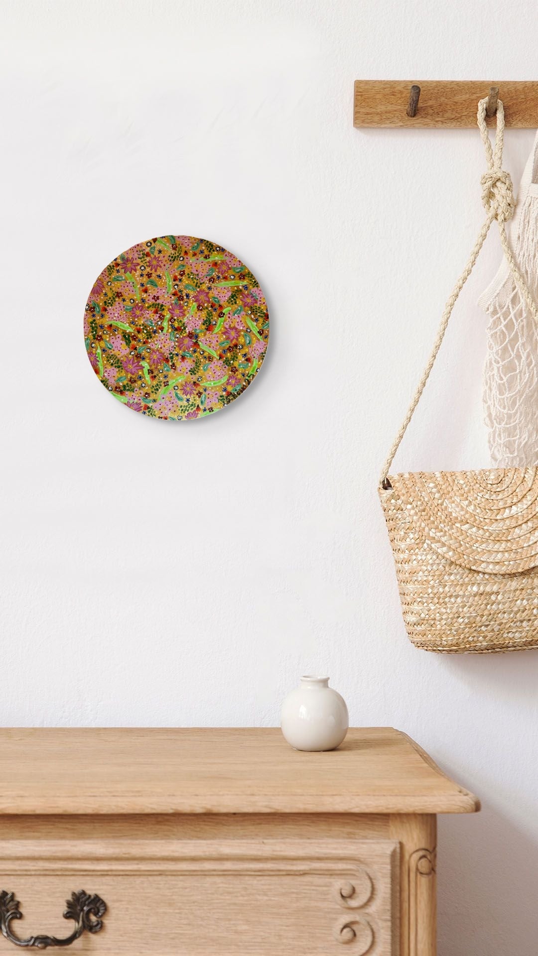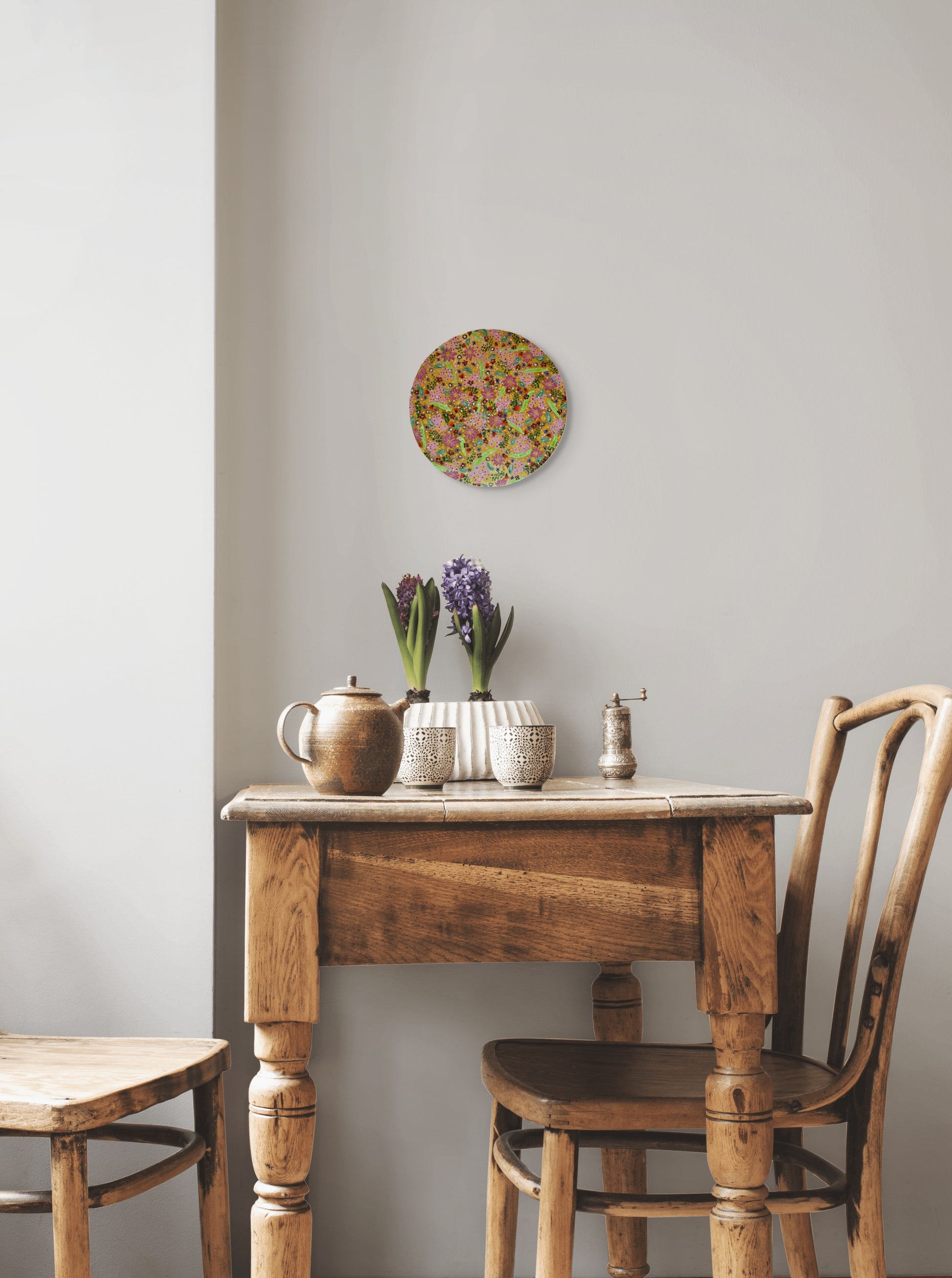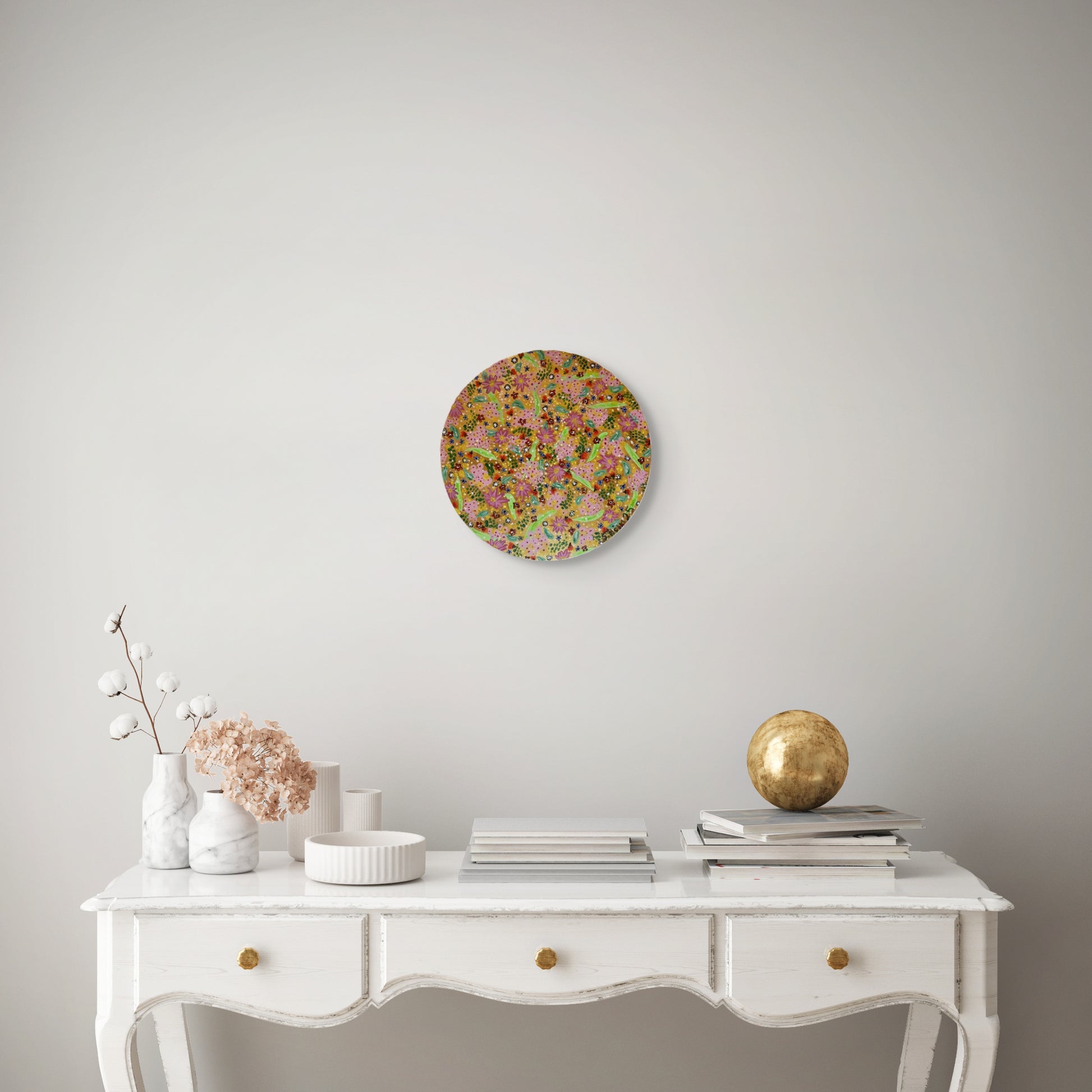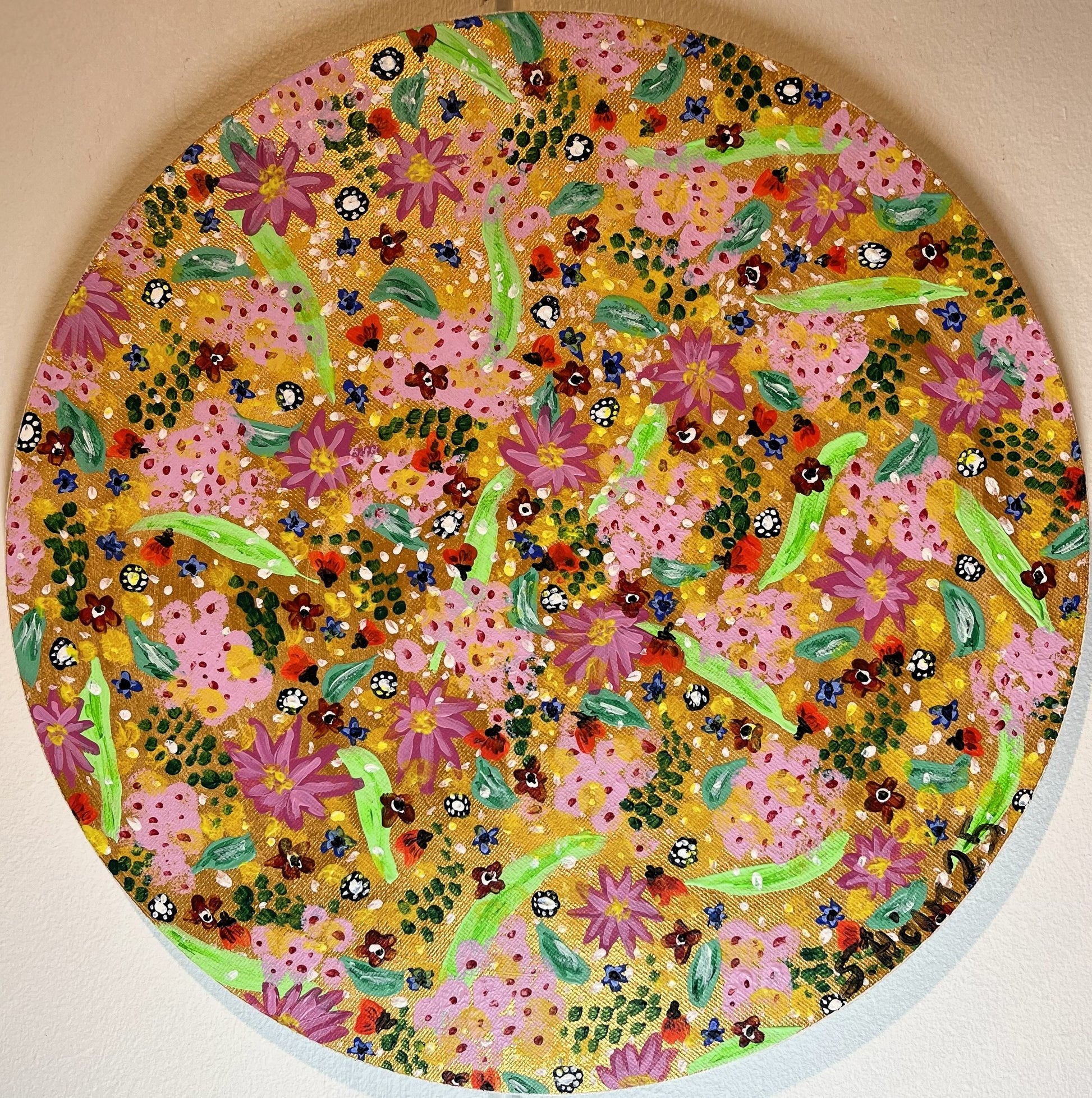 Blómadúlla 1 - Gullið - 2025, akrýl á flötum striga 30 sm. í þvermál