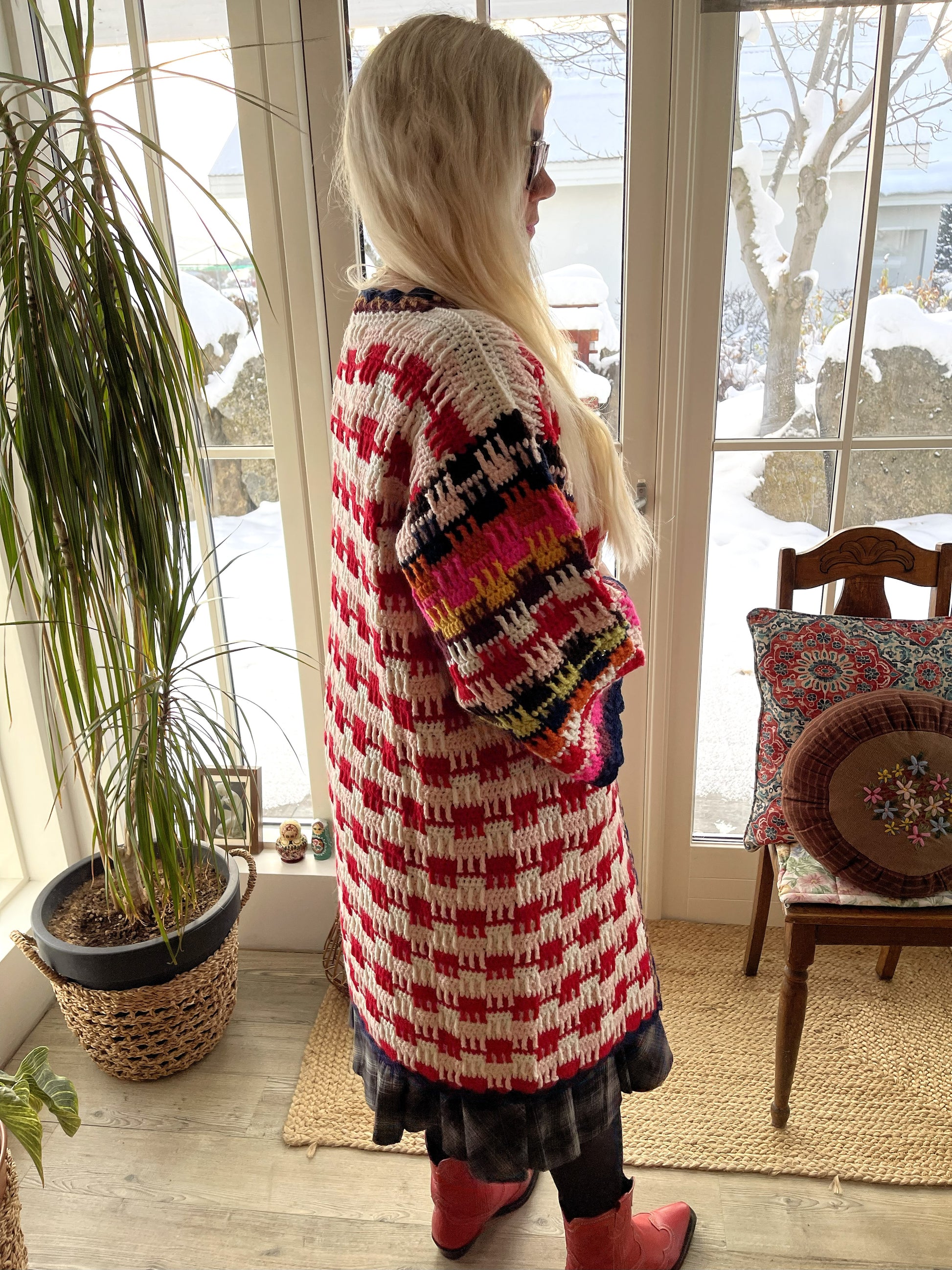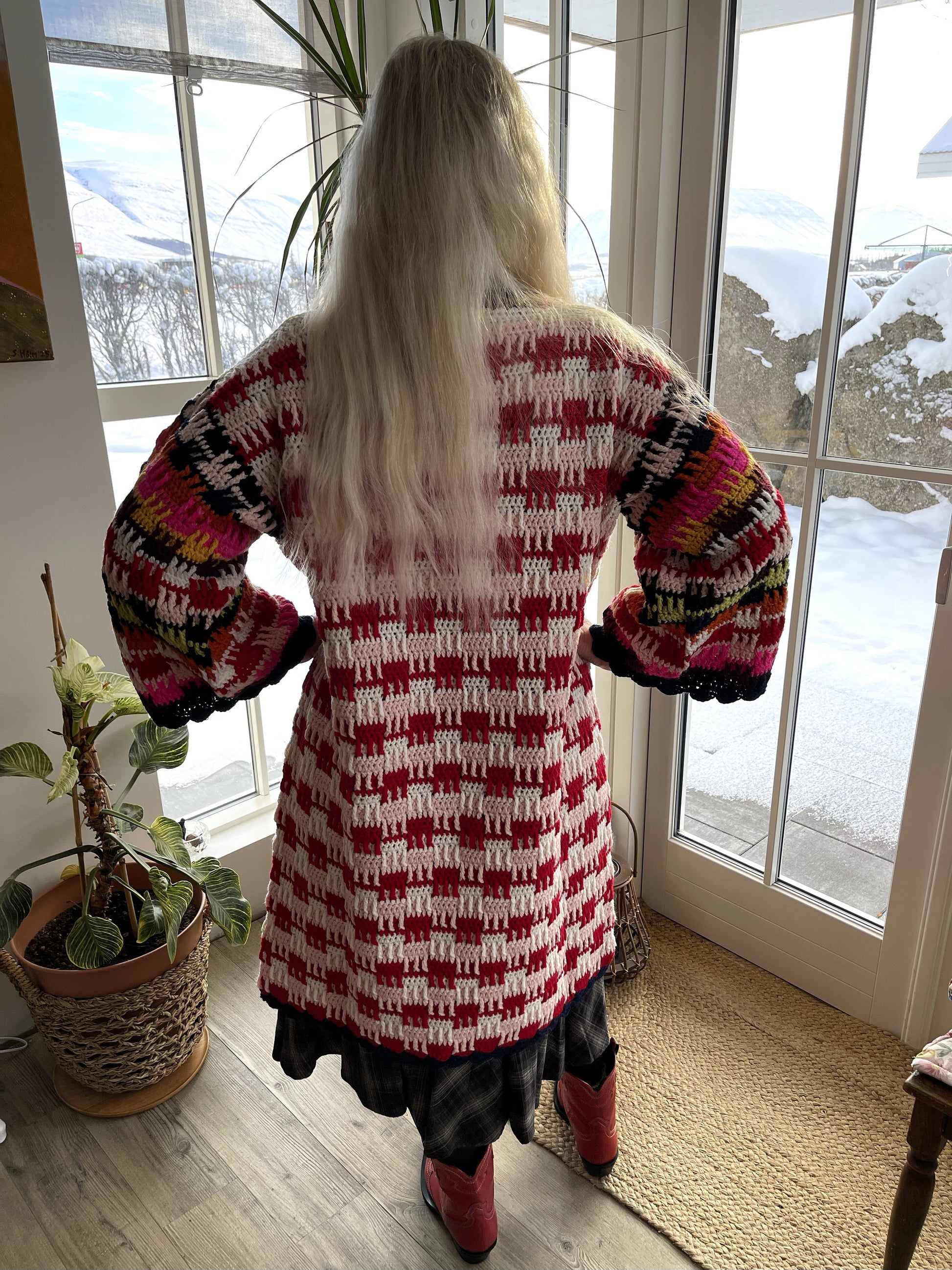 Efni: Í flíkinni er fjölbreytt garn, akryl-ullarblanda og fleira en peysan er efnismikil vegna munsturs sem gerir hana því dásamlega hlýja og notalega.