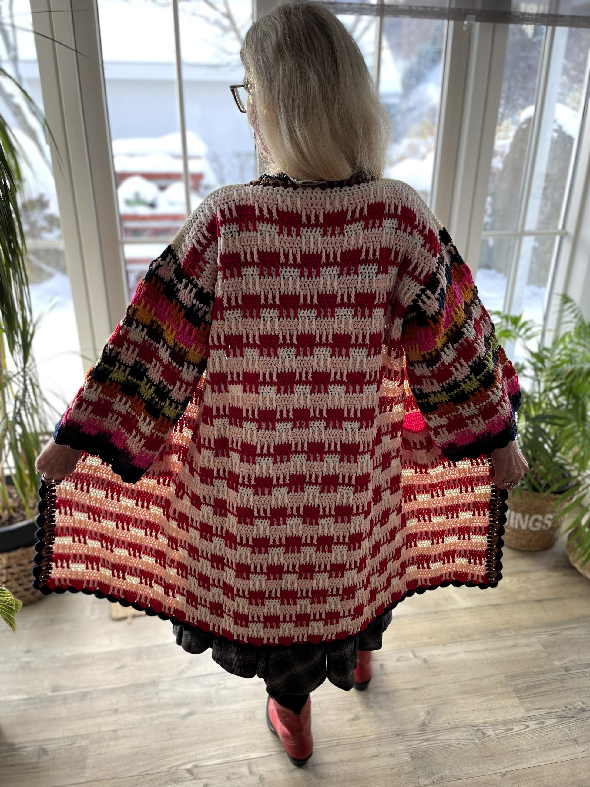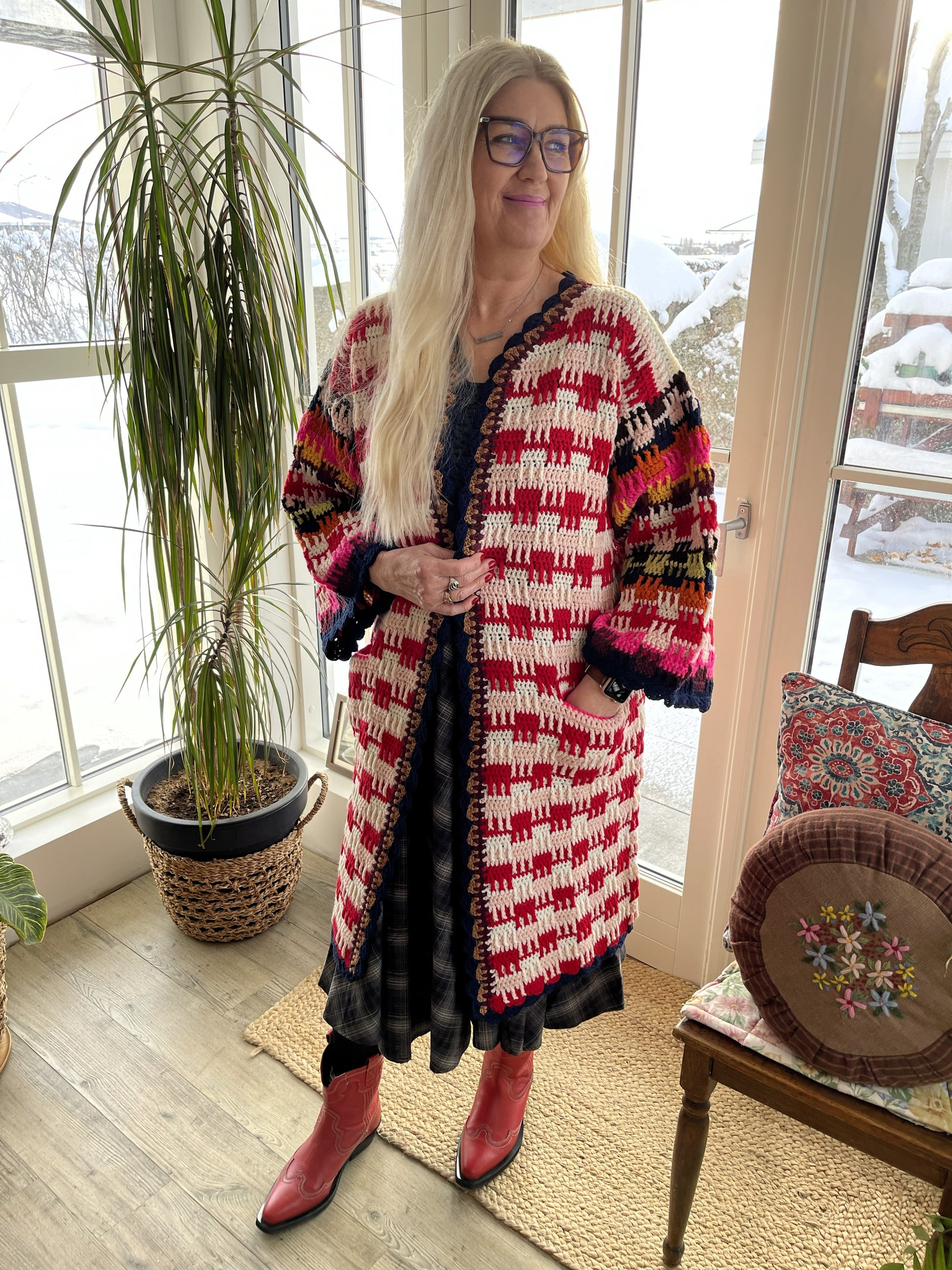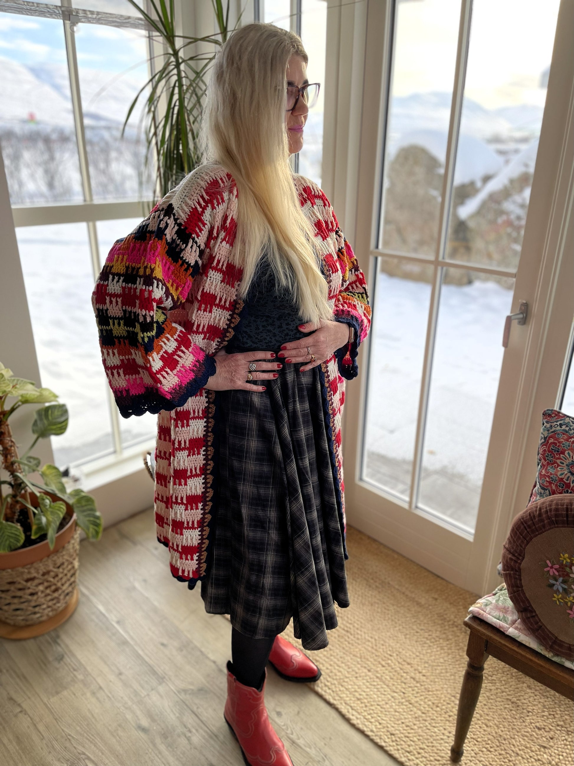 Falleg opin peysa sem er hekluð með fallegu munstur -hekli sem setur skemtilegan heildarsvip á þessa gæðalegu flík. Hún er mjög klæðileg og með góða sídd og einnig eru ermarnar víðari en gengur og gerist sem gefur peysunni ákveðinn karakter. Litirnir eru fallegir og passa vel saman. Þessa flík má nota við hvað sem er, um að gera að láta ýmindunaraflið ráða þar för. Eins og áður sagði er peysan opin og án tala eða hnappa en hún hefur vasa og lítið mál að nota fallegt leður belti við hana.