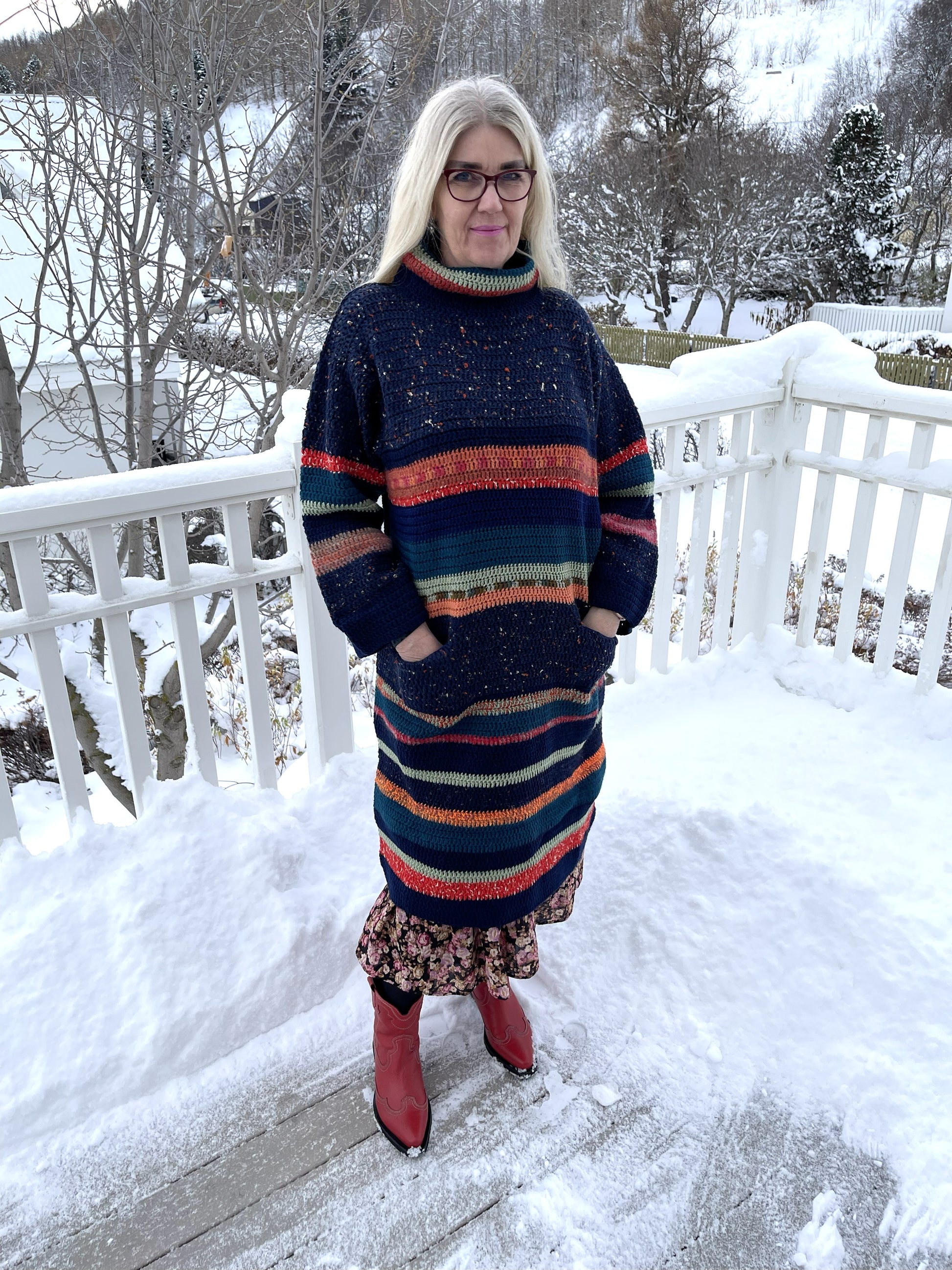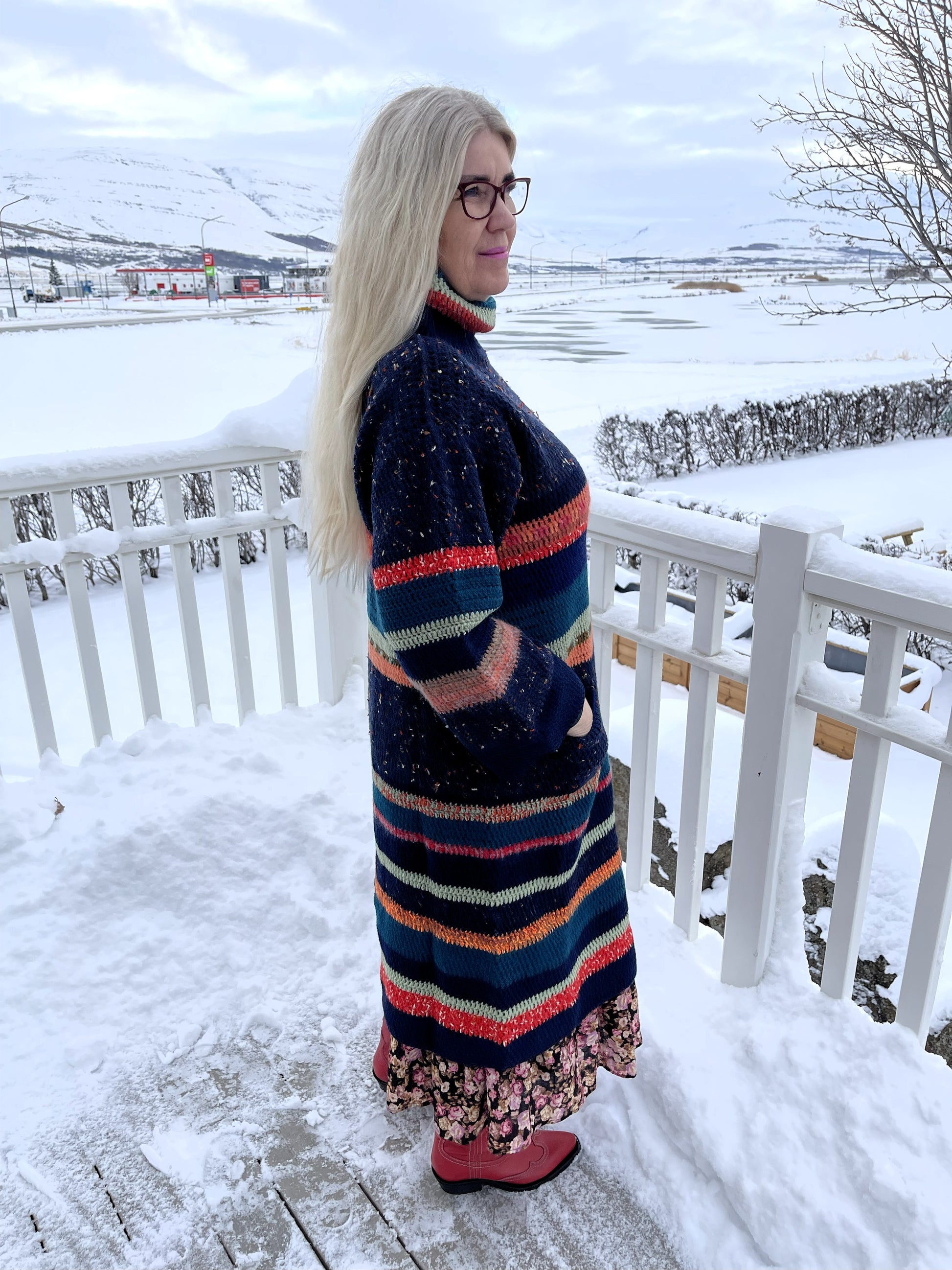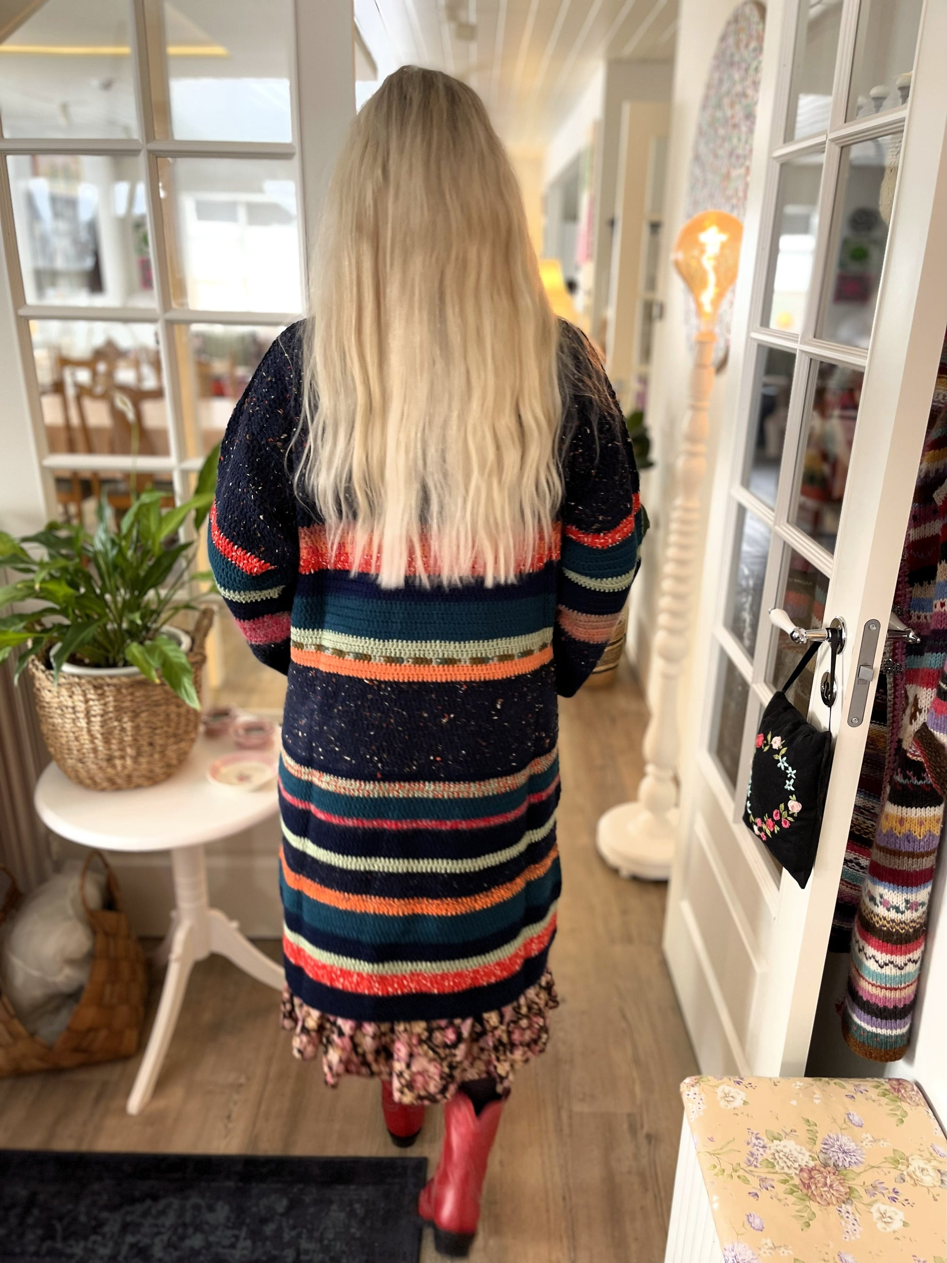 Hér er um mikla gæðaflík að ræða. Bláarönd er síð, hekluð peysa með vösum og stórum kraga. Hún er heil og því um nokkurskonar peysu-kjól að ræða. Litirnir í flíkinni lokkar og tælir til sín athyglina svo fallegir eru þeir. Dökkur tónn í grunninn með þessum fallegu litatónum inn á milli. Þetta er mjög klæðileg flík sem hægt er að nota við hvaða tilefni sem er, nota hana lausa eða skella leðurbelti í mittið til dæmis. Bláarönd er mikil dásemd.
