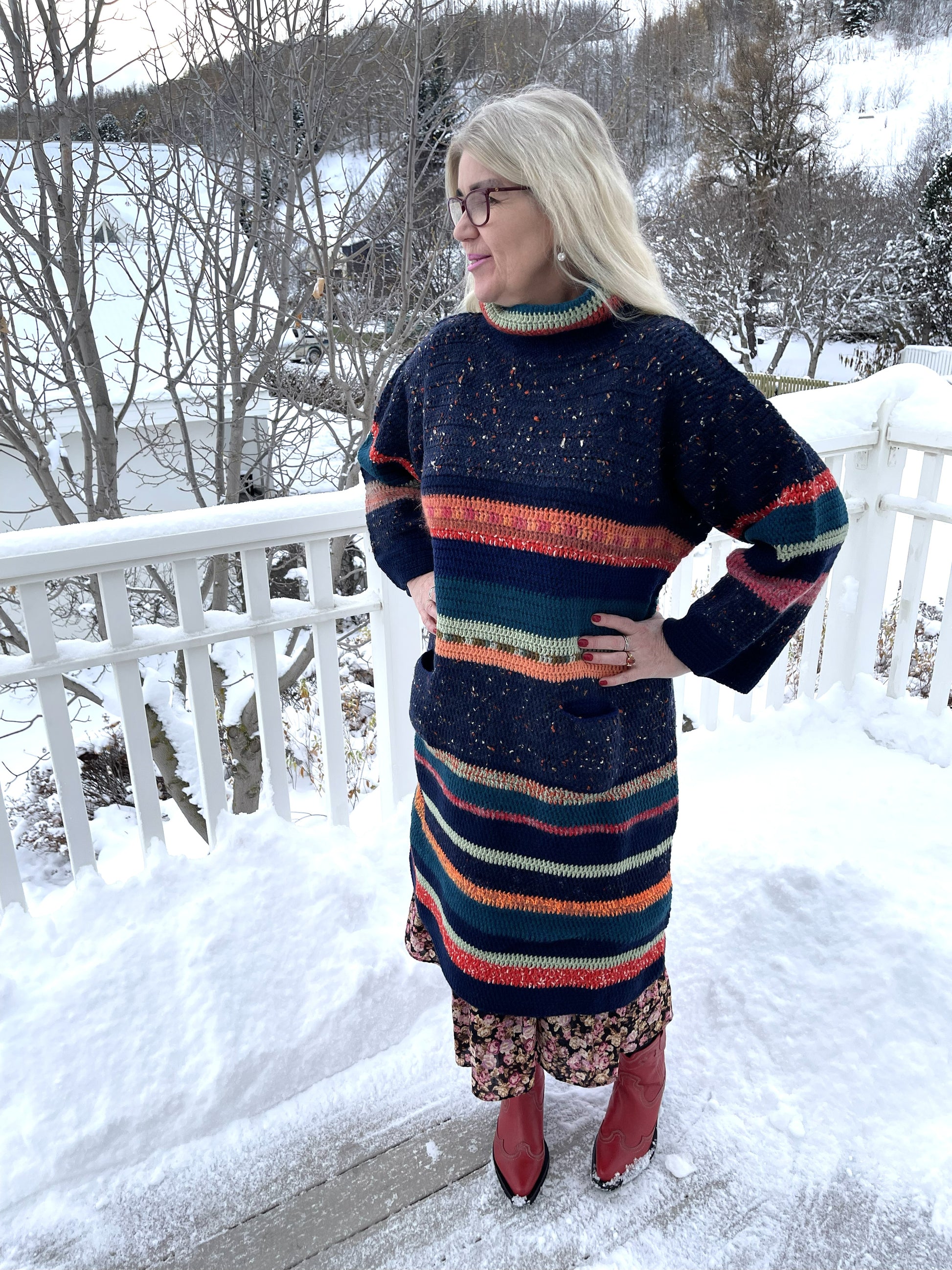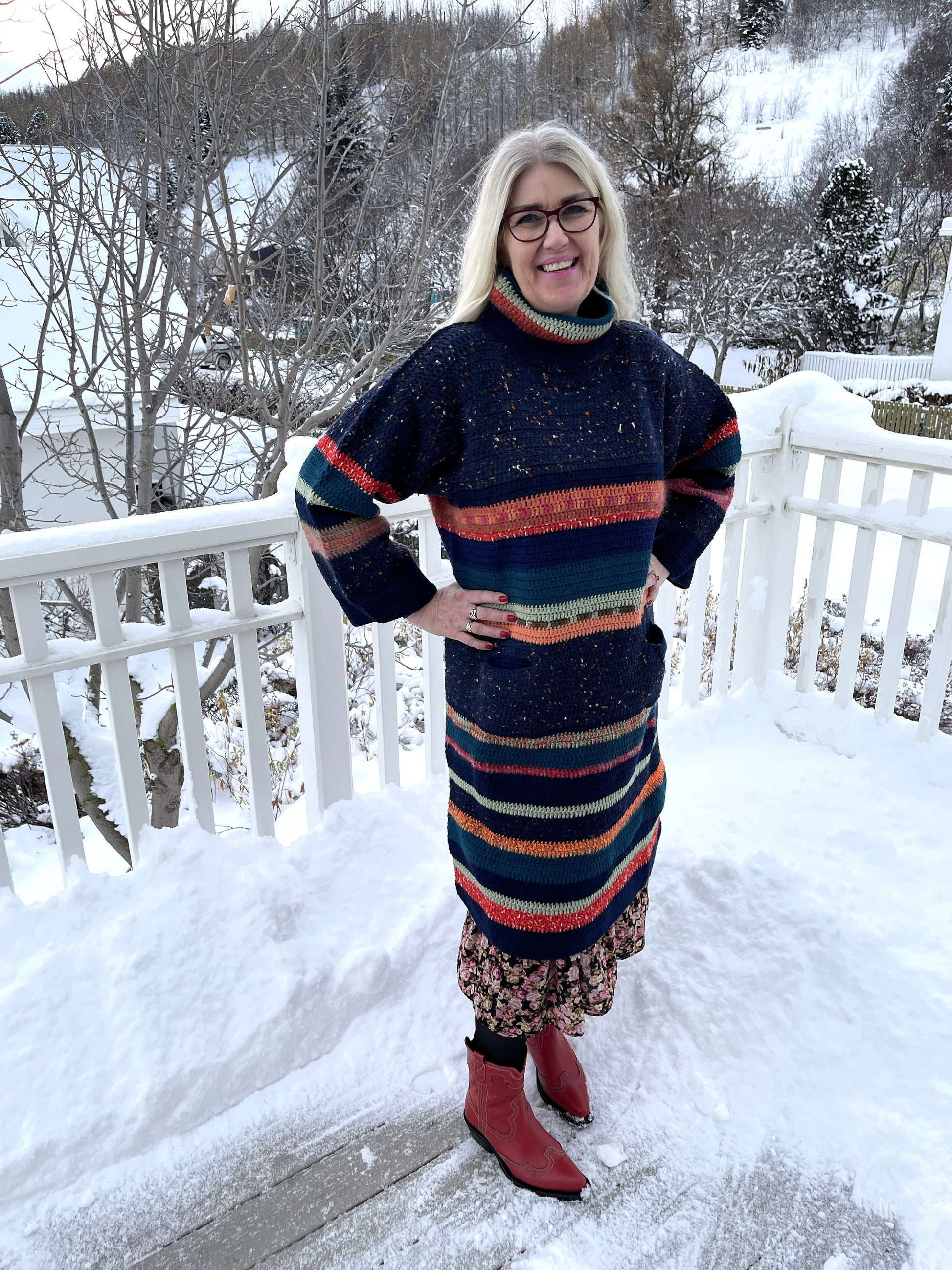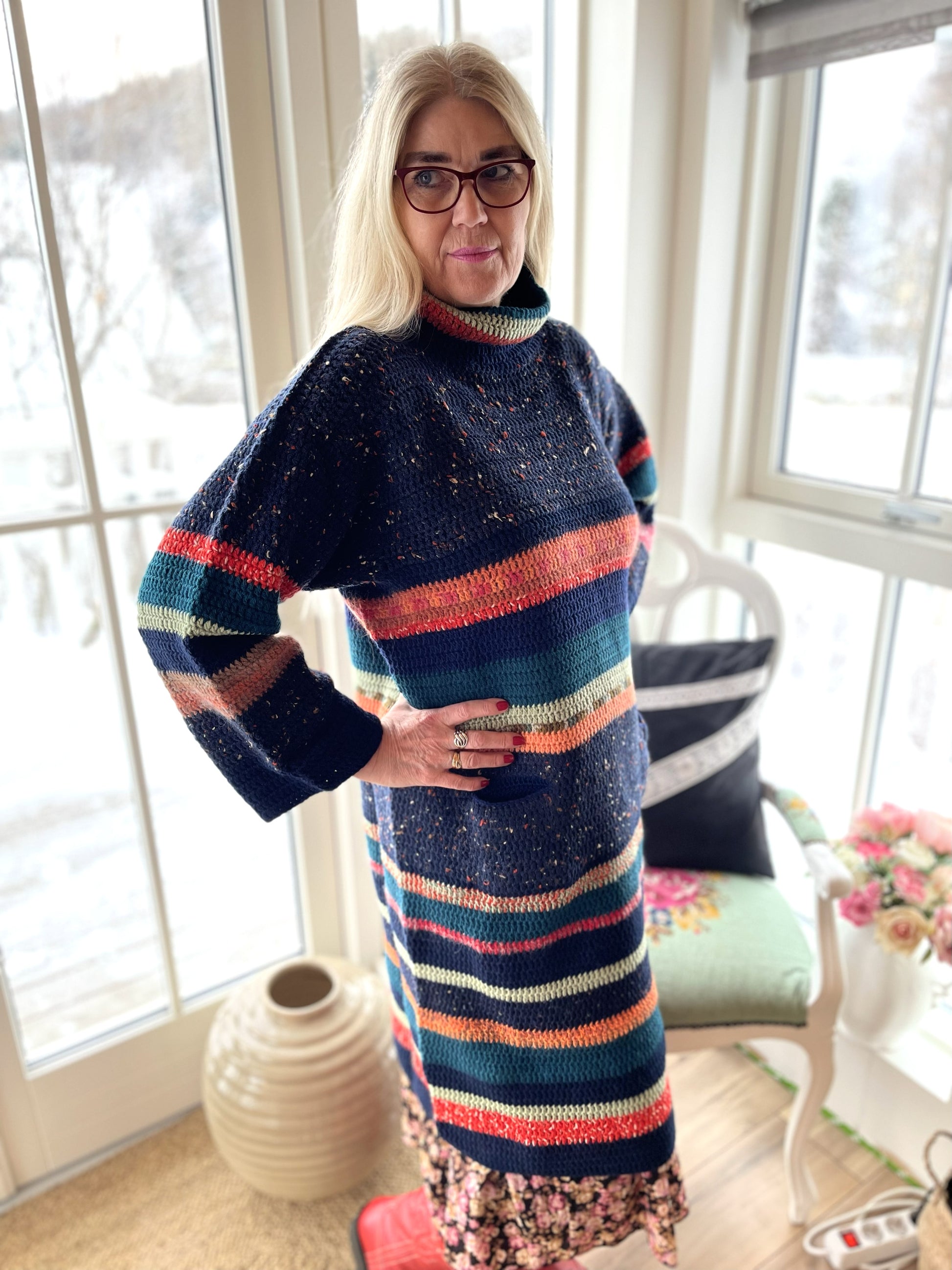 Hér er um mikla gæðaflík að ræða. Bláarönd er síð, hekluð peysa með vösum og stórum kraga. Hún er heil og því um nokkurskonar peysu-kjól að ræða. Litirnir í flíkinni lokkar og tælir til sín athyglina svo fallegir eru þeir. Dökkur tónn í grunninn með þessum fallegu litatónum inn á milli. Þetta er mjög klæðileg flík sem hægt er að nota við hvaða tilefni sem er, nota hana lausa eða skella leðurbelti í mittið til dæmis. Bláarönd er mikil dásemd.