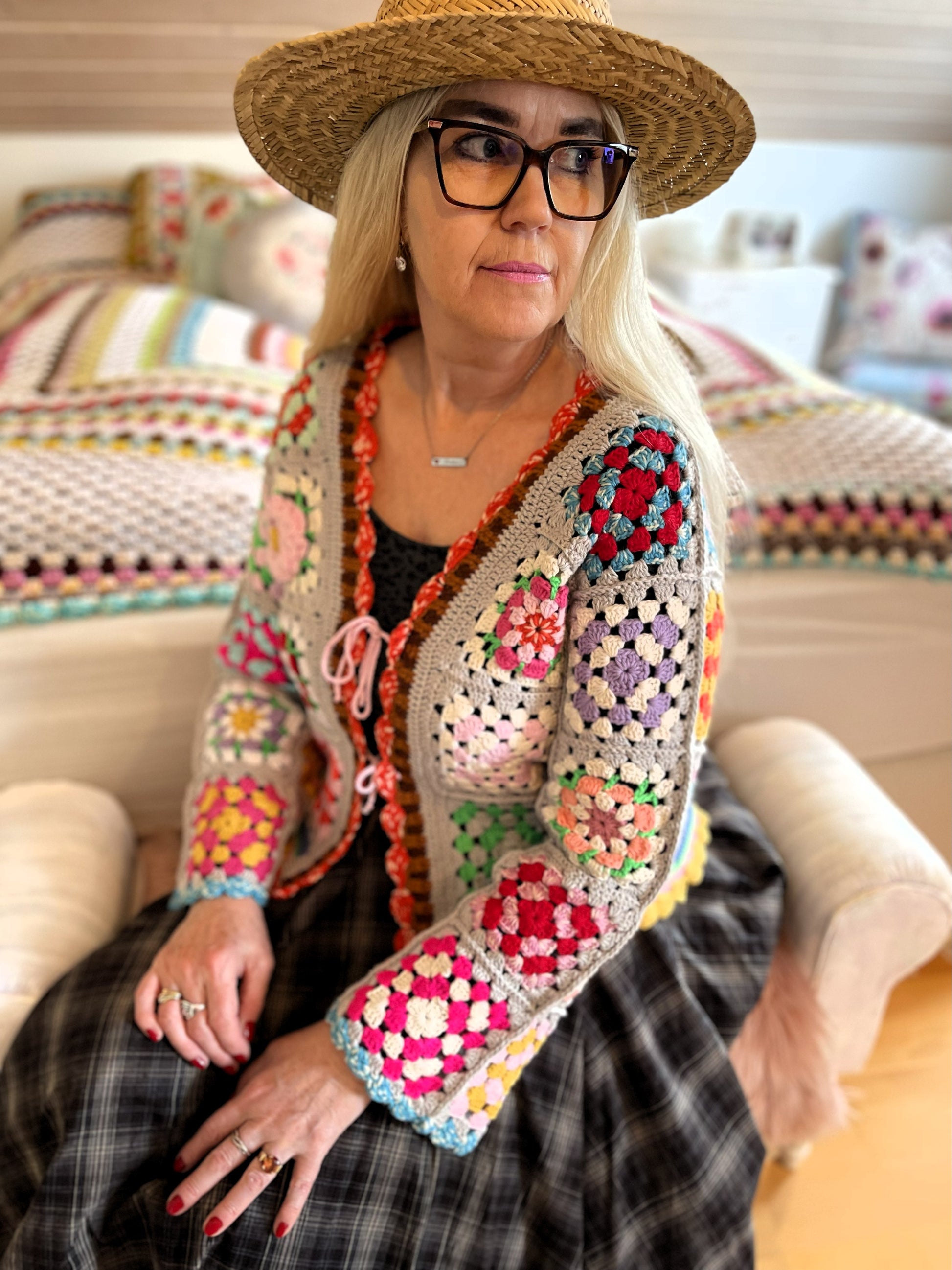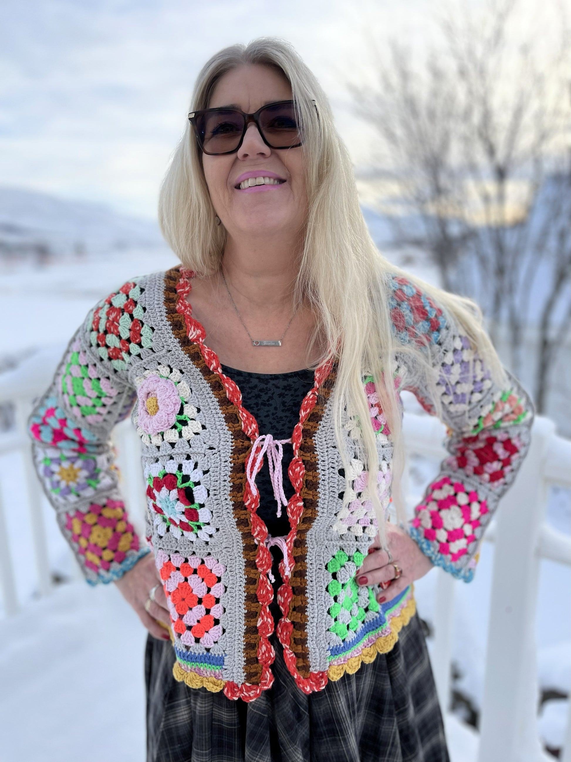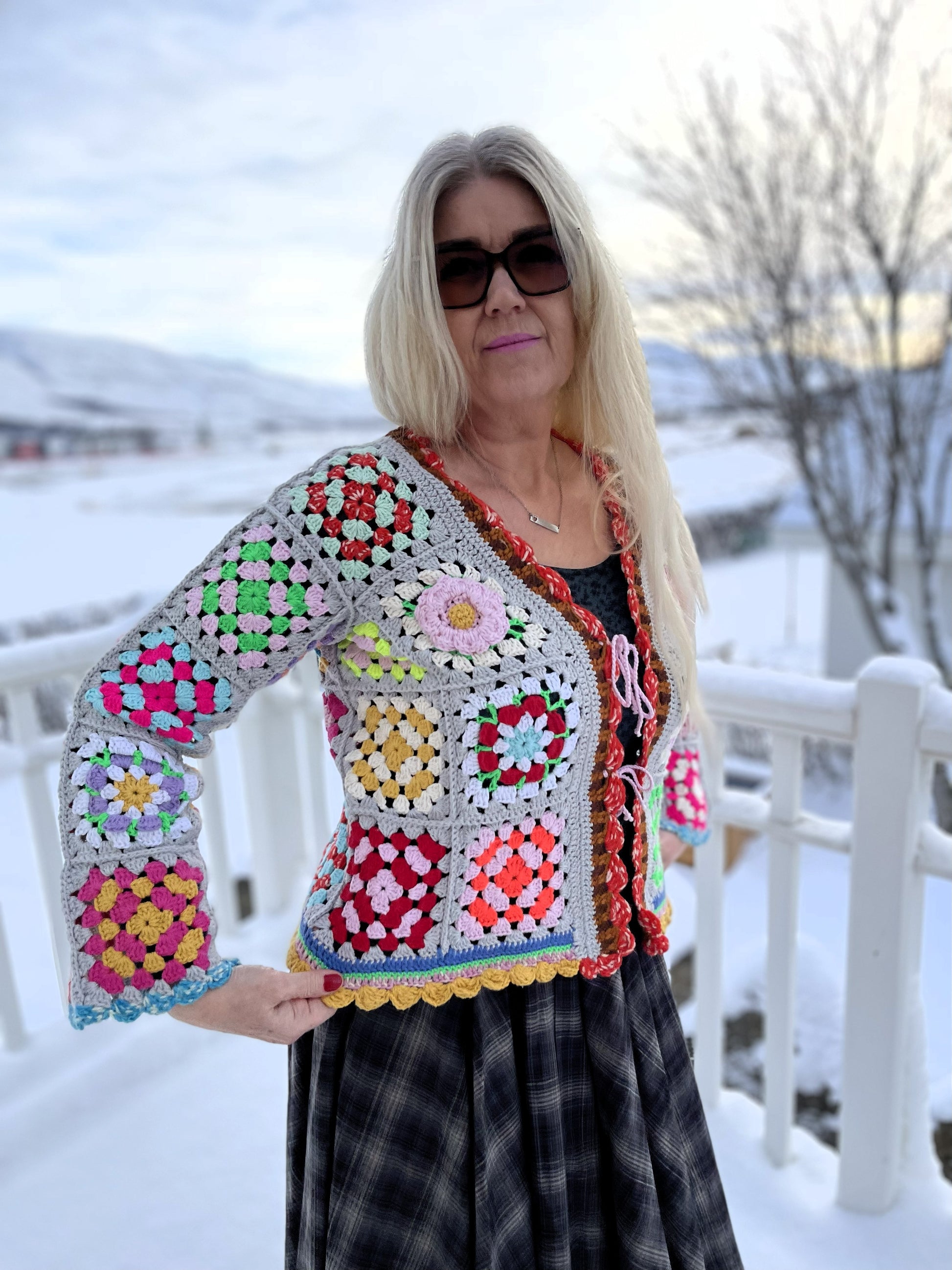 Dásamleg peysa í alla staði, hún er sérstök og hekluð úr litlum margskonar ömmu-dúllum. Litirnir í henni eru dásamlegir og er peysan nokkuð sumarleg en þó ekki þar sem að margir kjósa ljósa fallega liti í flíkunum sínum umfram aðra. Hún er bundin saman að framan verðu en auðvelt að sleppa því og hafa hana bara opna. Rósa passar við hvaða fatnað sem er en hún er mjög nett og passandi og alls ekki mikil vídd í henni. Mjög falleg peysa.
