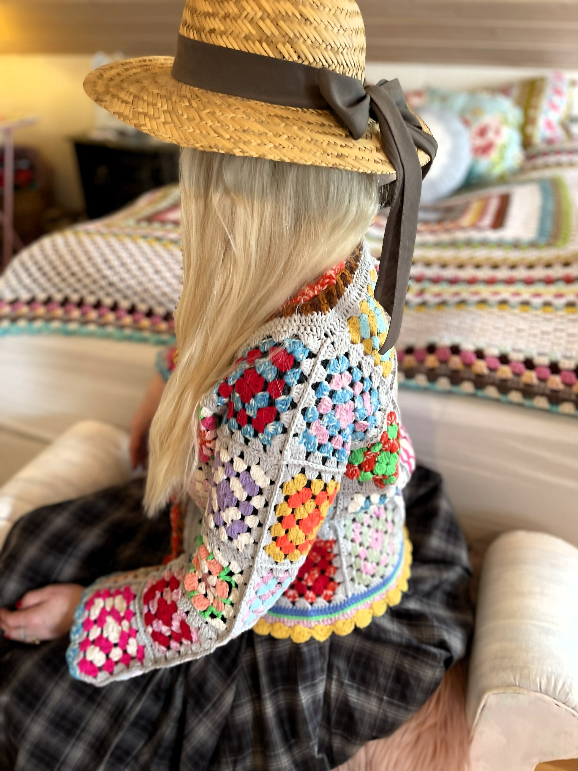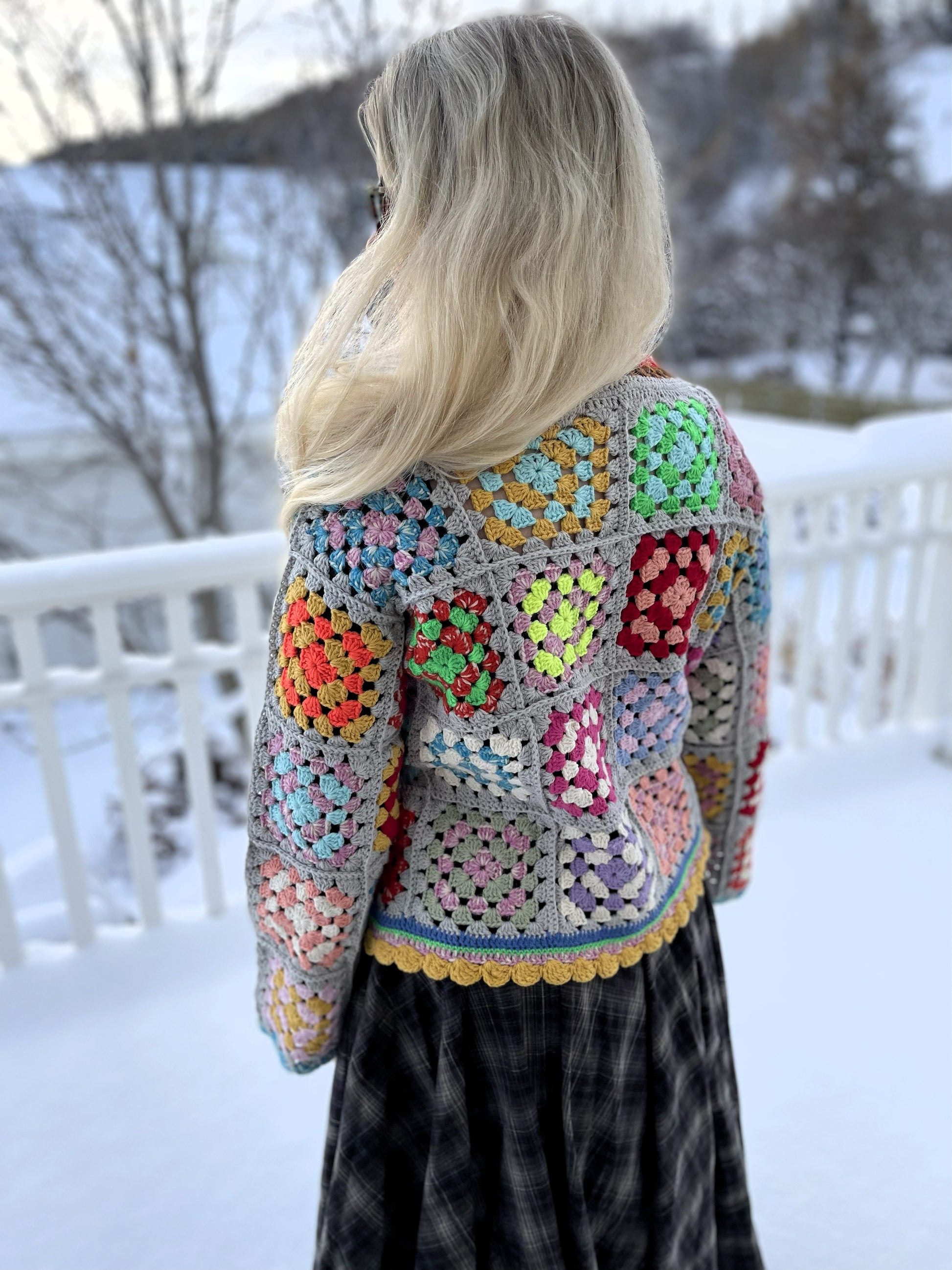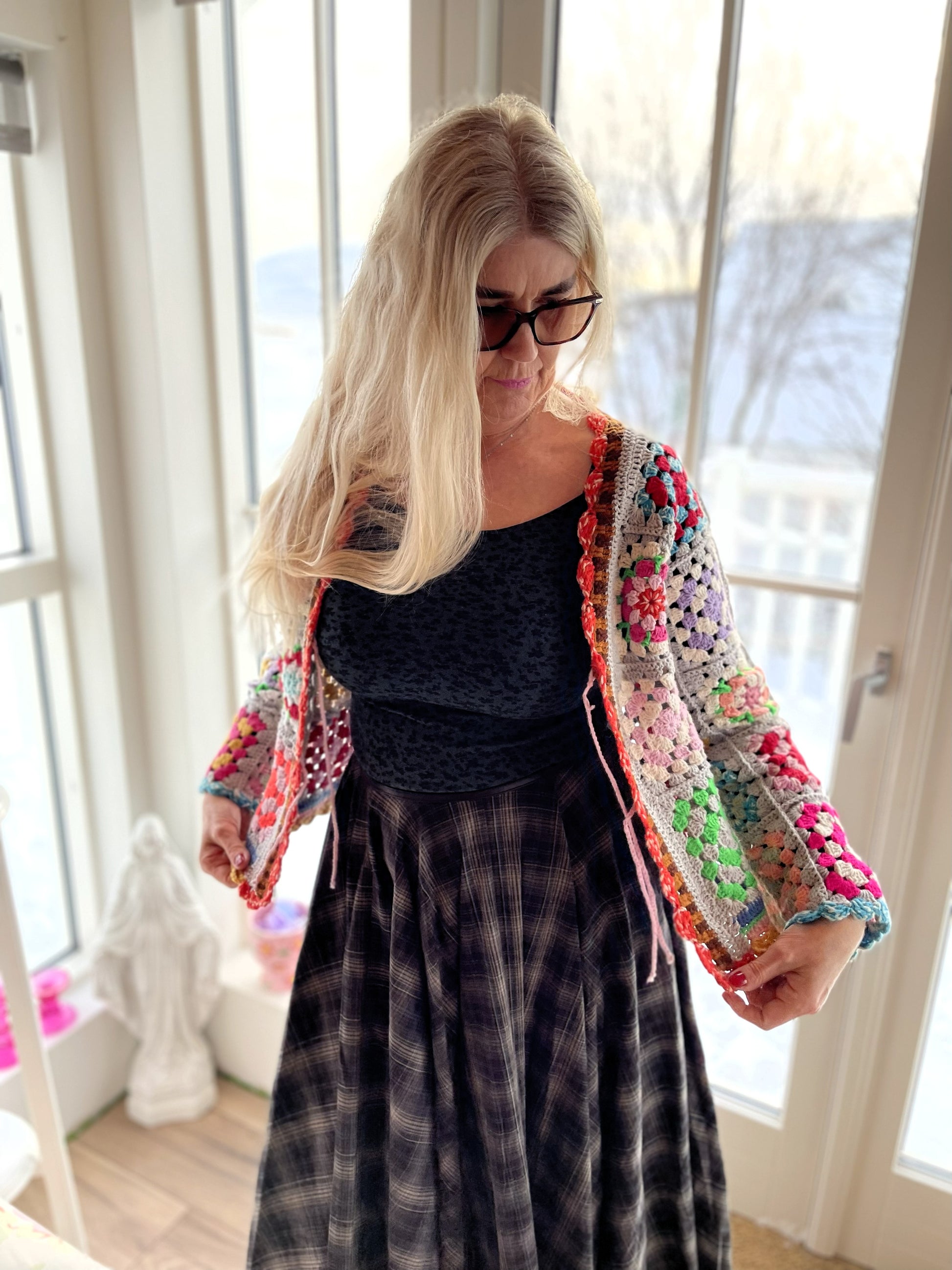 Dásamleg peysa í alla staði, hún er sérstök og hekluð úr litlum margskonar ömmu-dúllum. Litirnir í henni eru dásamlegir og er peysan nokkuð sumarleg en þó ekki þar sem að margir kjósa ljósa fallega liti í flíkunum sínum umfram aðra. Hún er bundin saman að framan verðu en auðvelt að sleppa því og hafa hana bara opna. Rósa passar við hvaða fatnað sem er en hún er mjög nett og passandi og alls ekki mikil vídd í henni. Mjög falleg peysa.