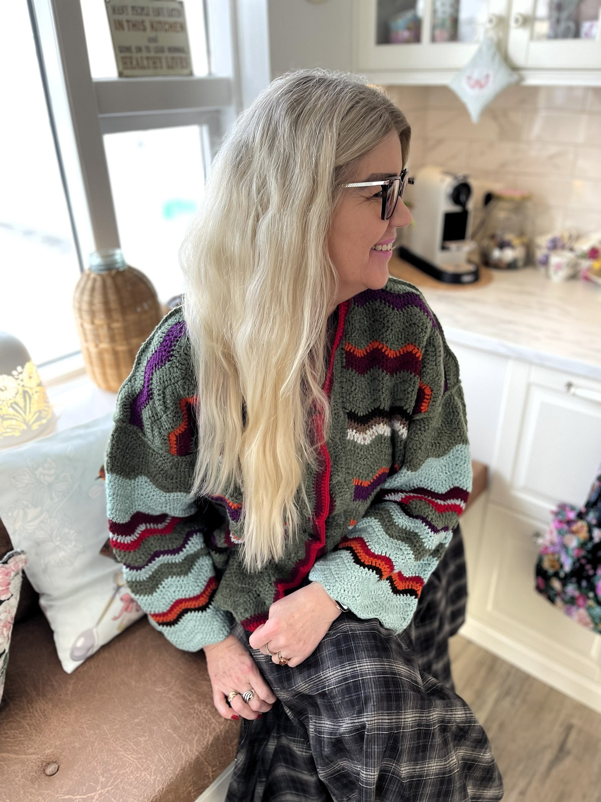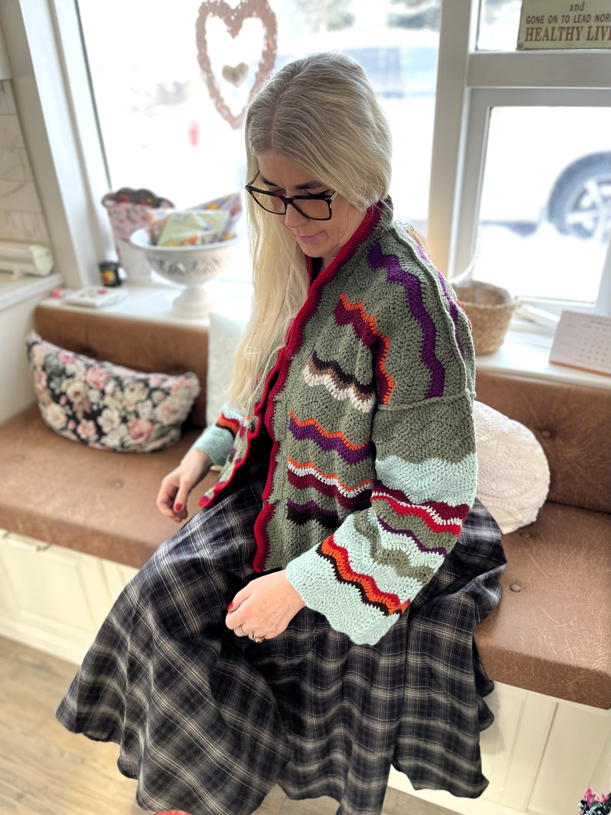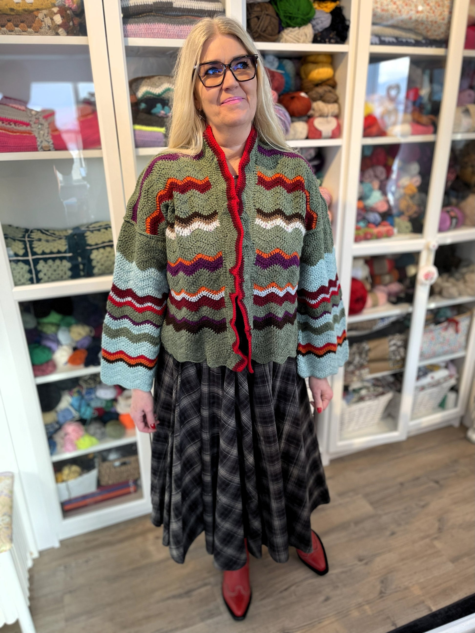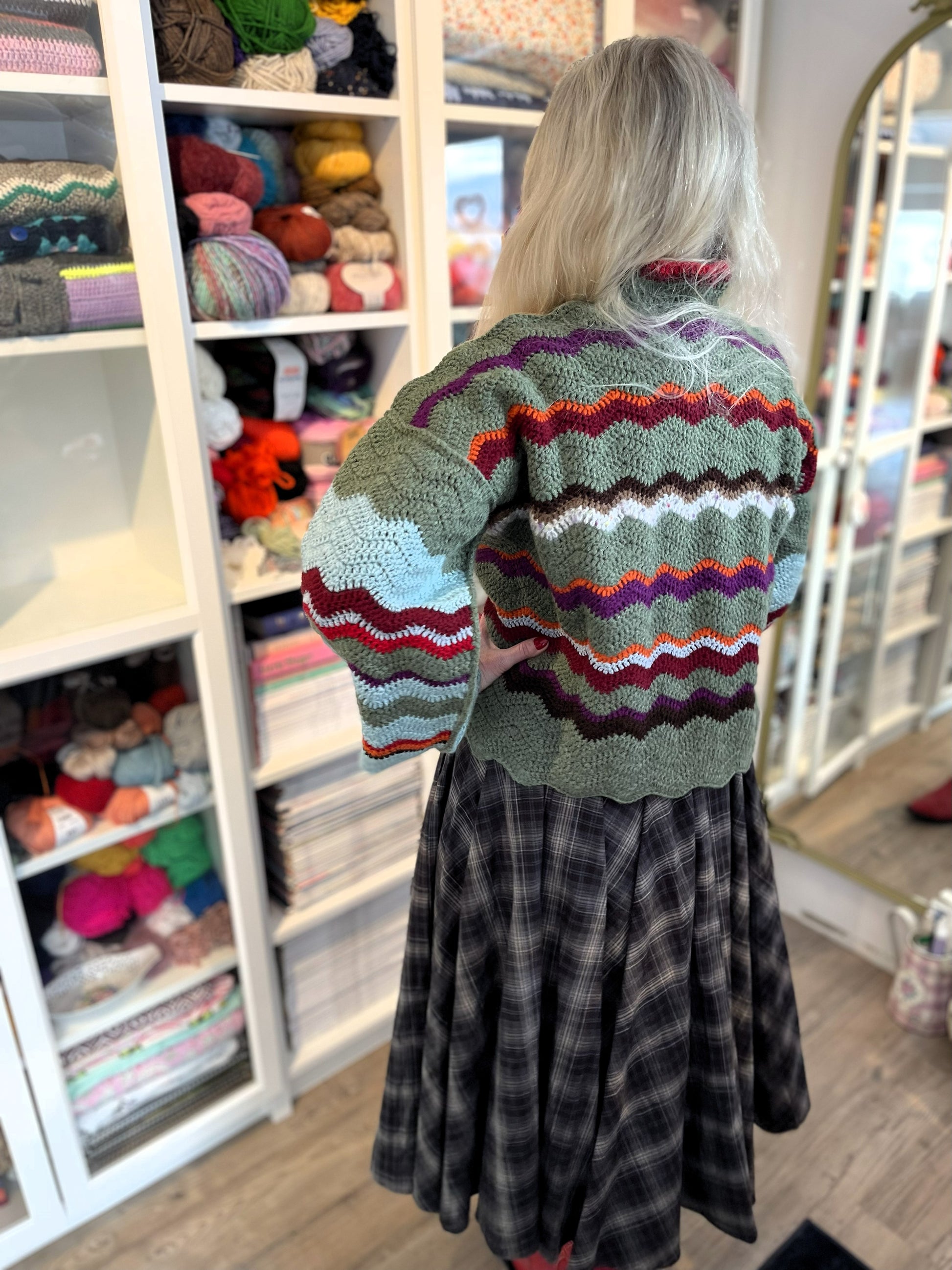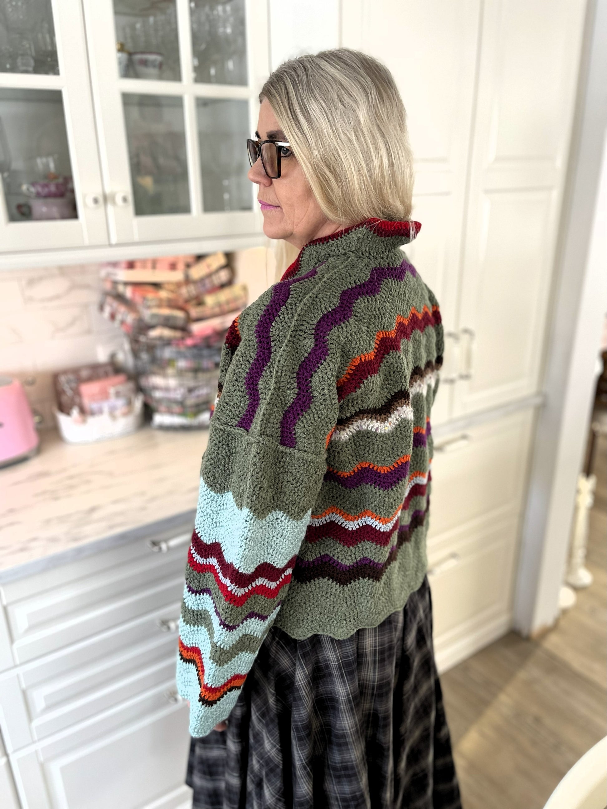 Þessi peysa er sprottin upp úr teppunum góðu, hekluðu bylgju-teppunum sem margir hafa heklað sér til heimabrúks. Hún er í fallegri litasamsettningu sem fangar augað og hefur vítækt notagildi og passar við nánast hvað sem er buxur pils eða yfir fallegan kjól. Peysan er opin og sómir sér vel þannig og er hún mjög notaleg og þægileg. Virkilega falleg og hlýleg flík.