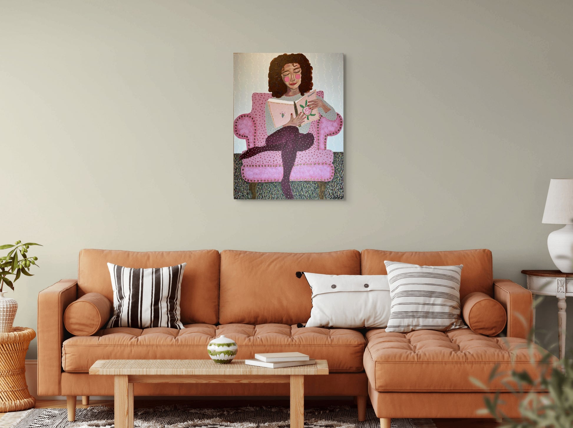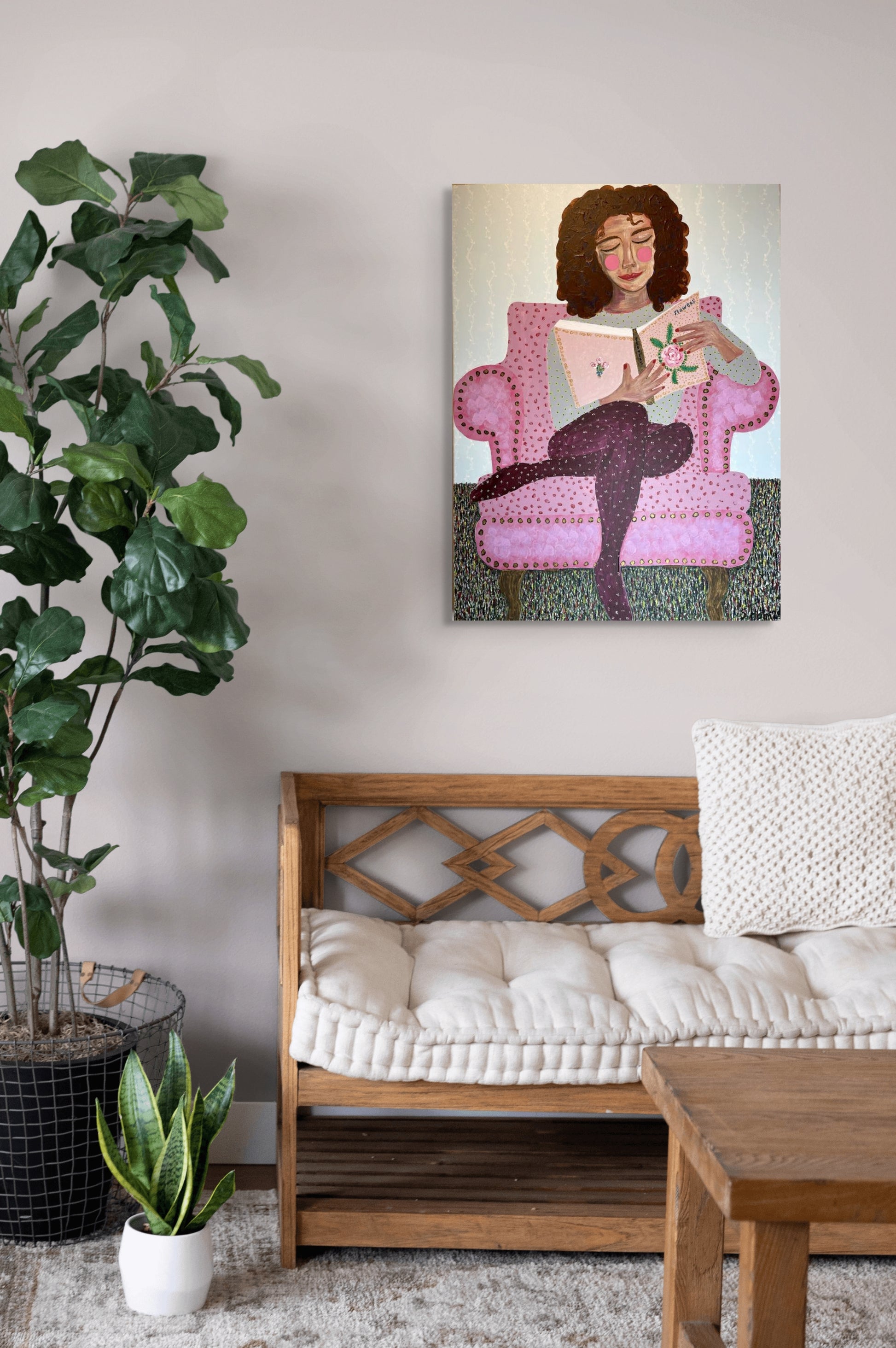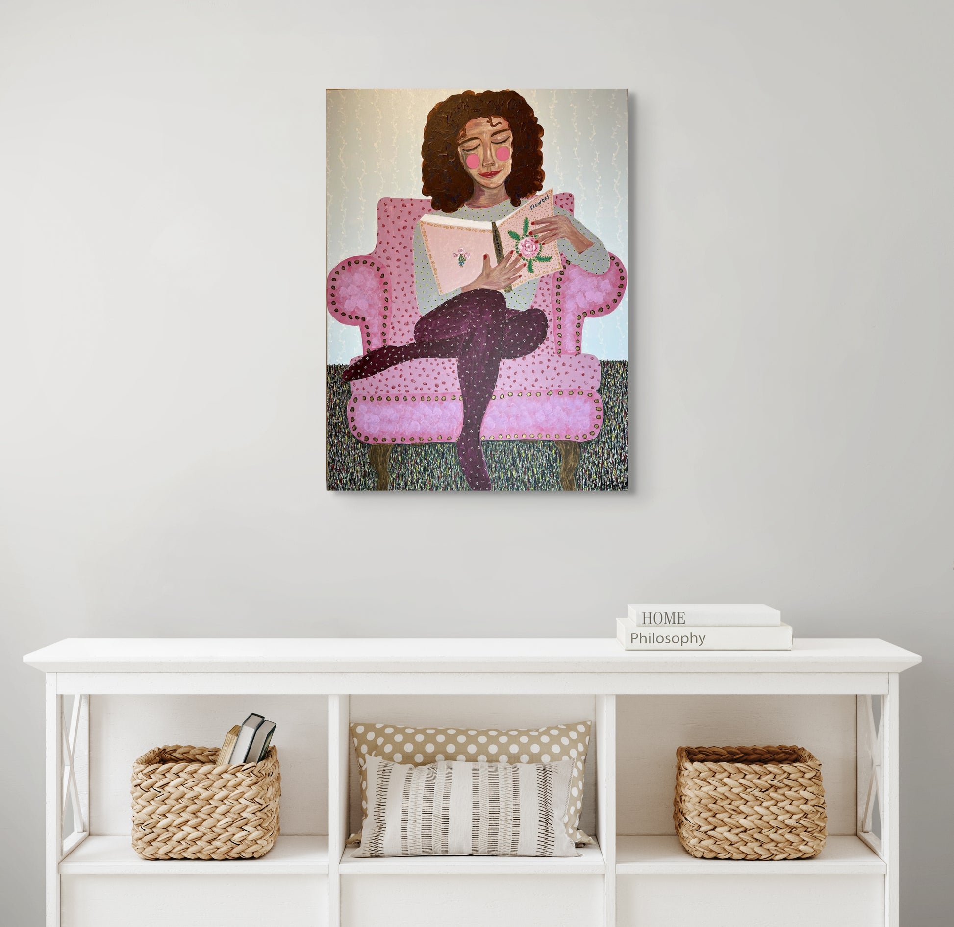 Friður, slökun, ró og næði. Tími til að hverfa inn í annan heim. Leyfa huganum og lönguninni í fróðleik að taka yfir um stund. Setjast í bleika stólinn og hverfa á vit ævintýranna. Yndis lestur er táknræn fyrir nærandi tíma fyrir sjálfið, tími fyrir endurheimt og endurstillingu. Falleg orð á prenti, hverfandi list en svo nauðsynleg og nærandi í lífsins ólgu nútímans.