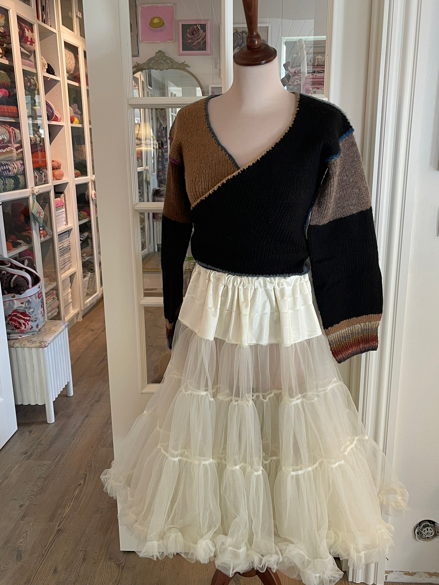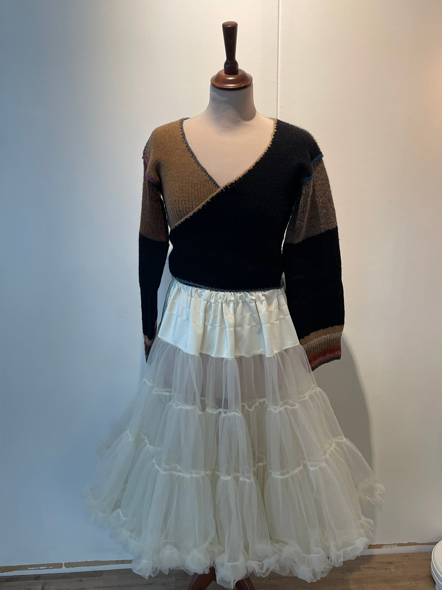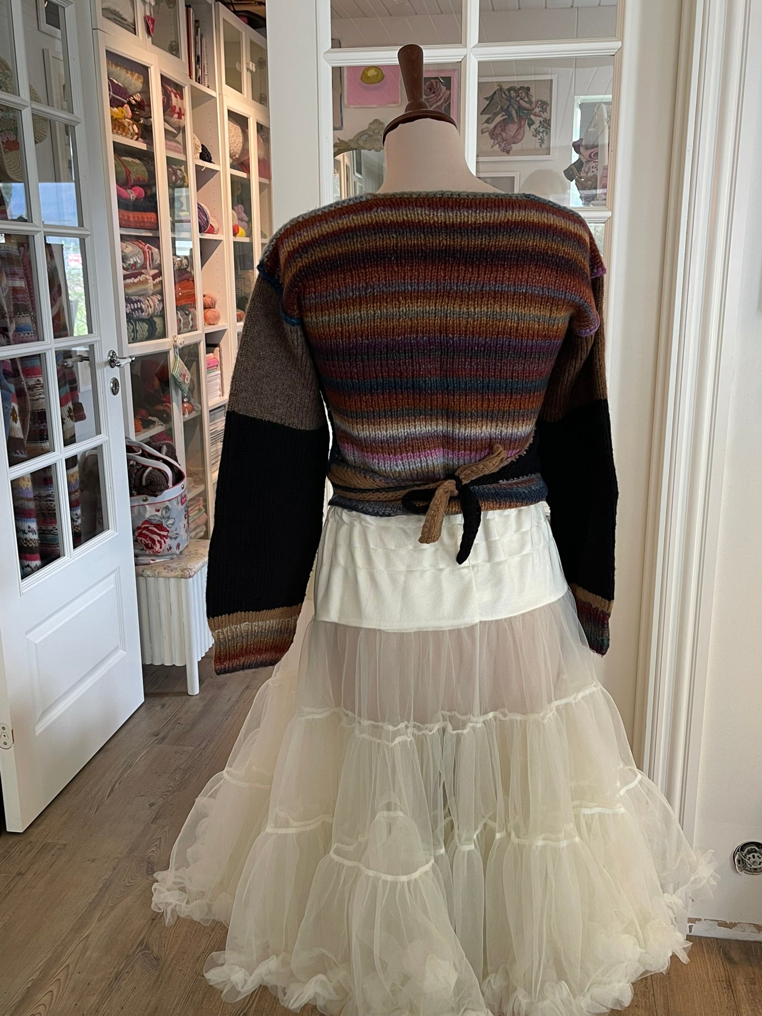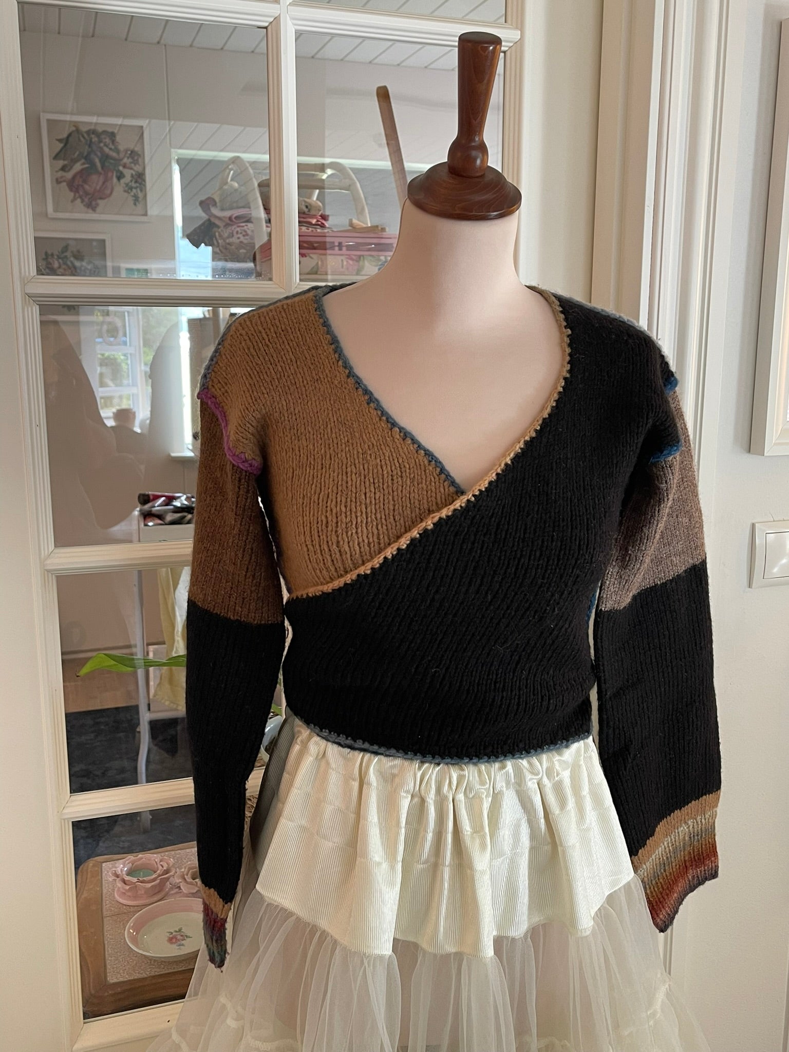 Þessi peysa er prjónuð og mjög kvenleg og klæðileg þar sem að hún víxlast að framan og er bundin að aftanverðu. Hægt er að skipta um hvaða framhlið-boðungur verður “ráðandi” það er í báðum hliðum eru “göt” til þess að fara með í gegn til að binda peysuna að aftanverðu. Hún er úr mjúku garni, stærðin er S og er þessi peysa mjög lítið notuð og er vel með farin. Full erma lengd er á henni. Hún er mjög falleg við kjóla og pils en líka klæðileg við buxur.