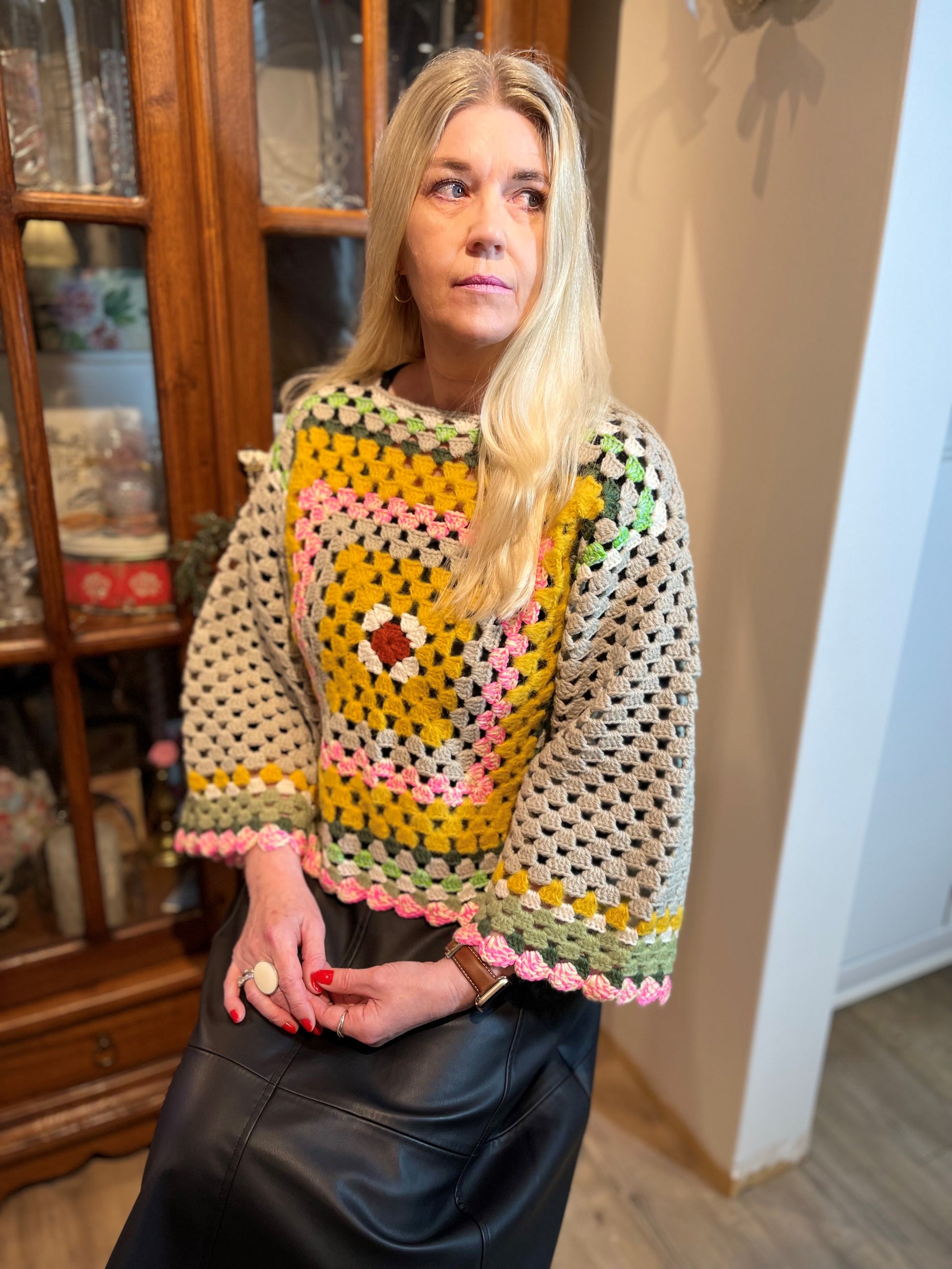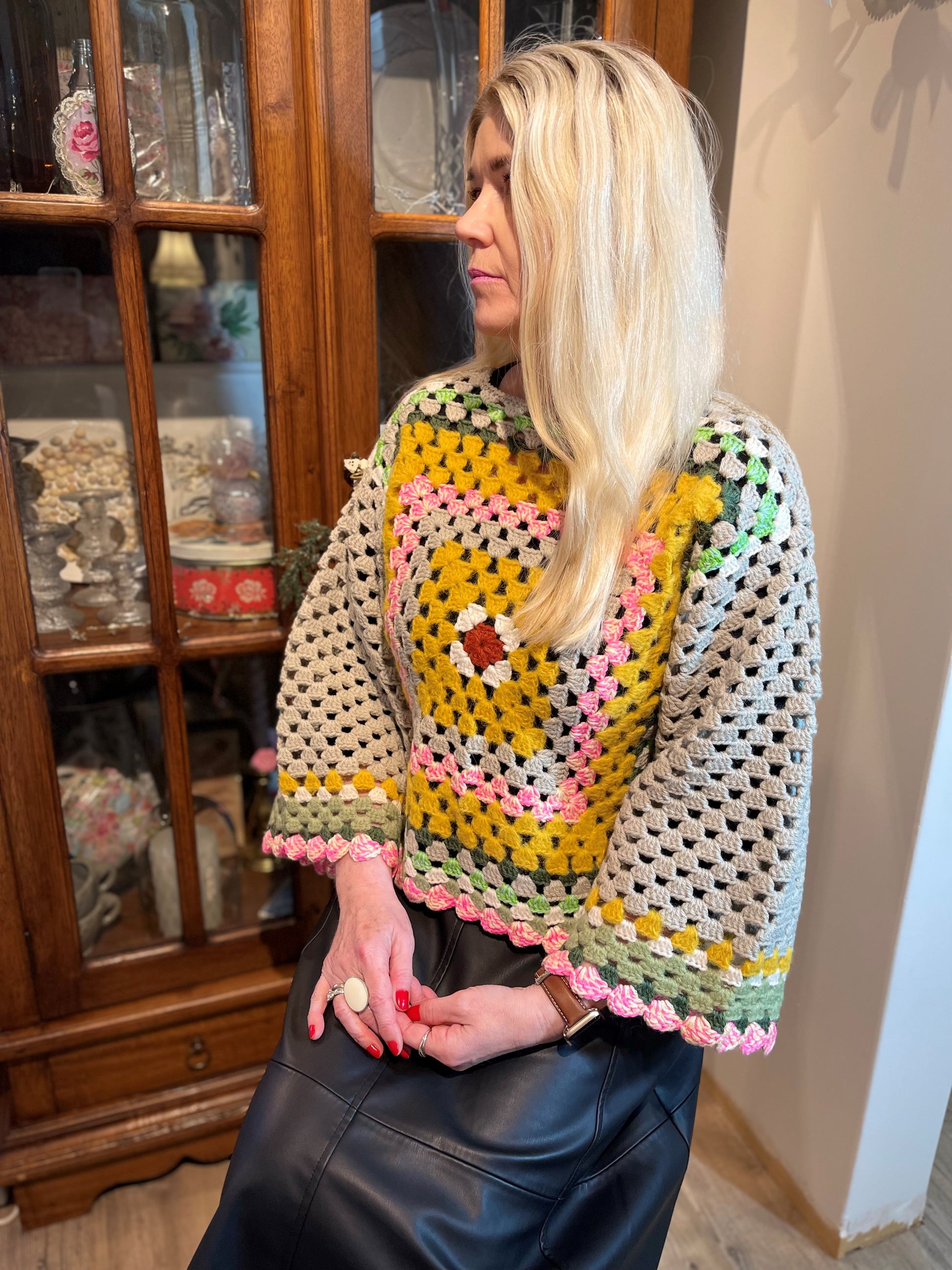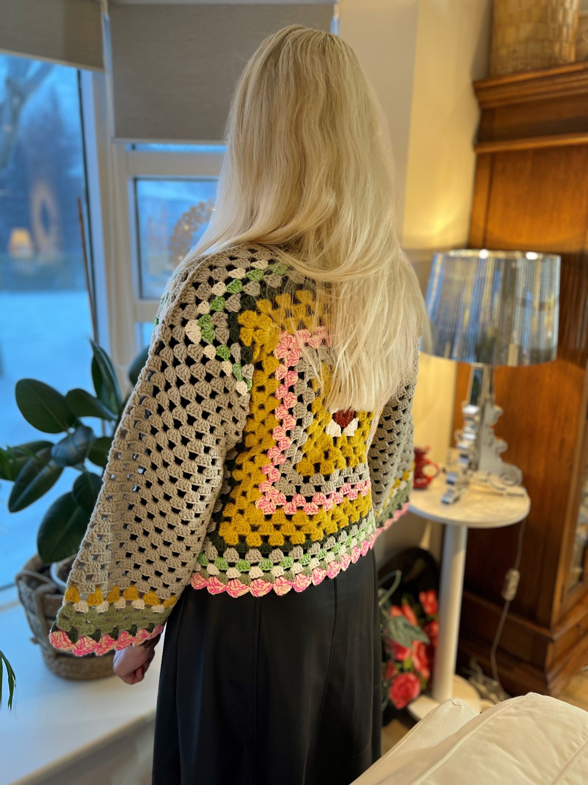 Það er hverjum einstaklingi nauðsynlegt að eiga fallega peysu til að bregða sér í. Það skemmir ekki ef flíkin geislar af góðum straumum og jákvæðni í gegnum bjarta og fallega liti sem minna á sólina og blómin en Sólblóm er einmitt þannig. Hún er hekluð í heiðri við gömlu „ömmu“ teppin og samanstendur af fram og bakstykki sem eru tvær stórar dúllur. Guli liturinn gerir hana svo bjarta og glaðlega að maður skildi ætla að það myndi lyfta hverju geði upp. Sólblóm er stutt peysa sem fallegt er að nota við gallabuxur, pils og jafnvel yfir kjóla og sómir sér vel bæði spari og hversdags. Sólblóm er dásamleg flík sem fangar vel anda hönnunar Rósalínu.