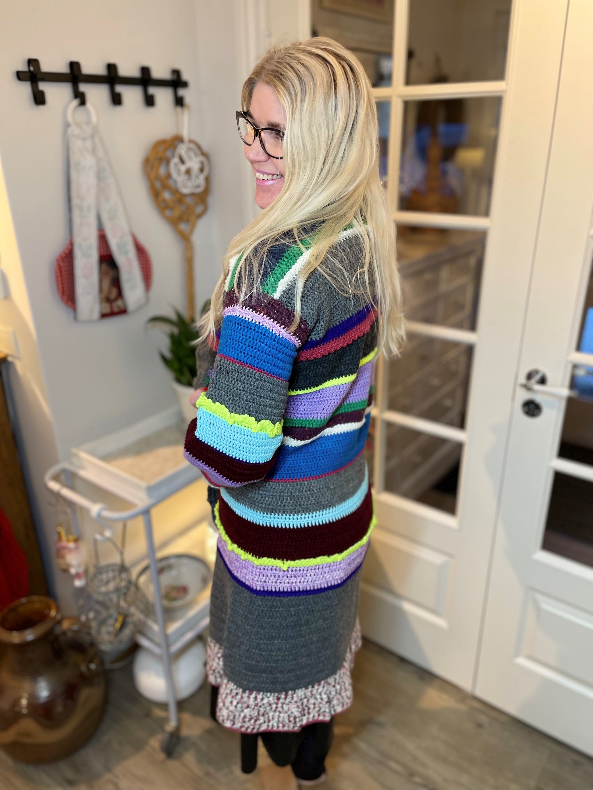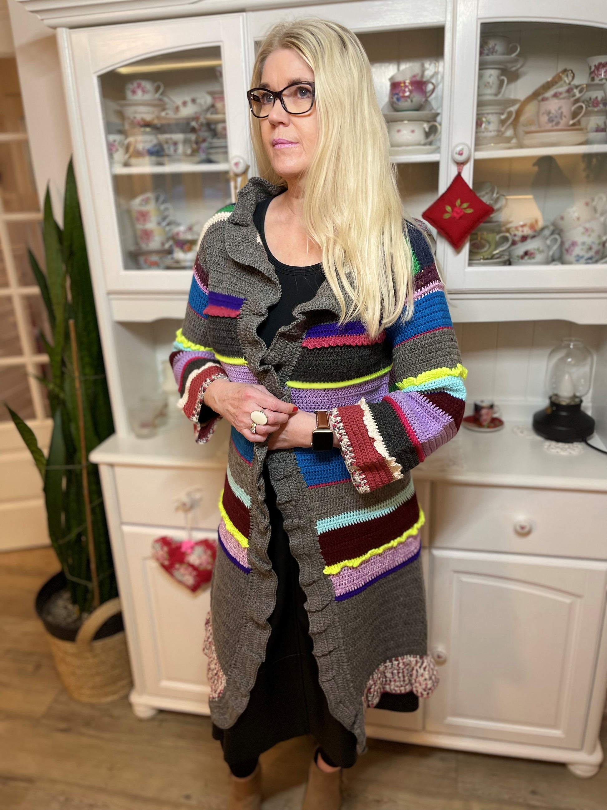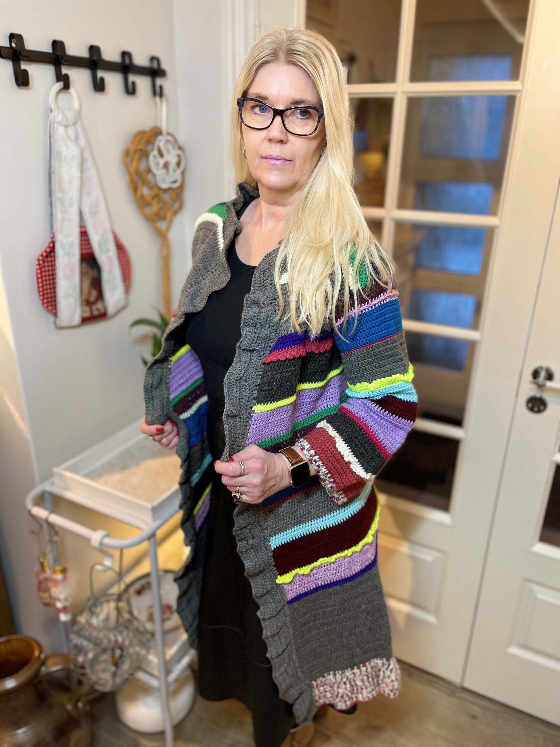 Þessi fallega peysa er sérstök og einstök. Hún klæðist vel og er mjög dömuleg og hægt er að klæða hana „upp og niður“. Hún fer vel við gallabuxurnar, pilsið og kjólinn hvort sem það eru strigaskórnir eða háu hælarnir við. Peysan er dásamlega hlý og notaleg með skemmtilegri lita samsettningu. Hægt er að setja fallegt leðurbelti yfir hana í mittið eða að leyfa pífunum að njóta sín með því að hafa hana opna. Þessi heklaða peysa er skemmtileg viðbót við Rósalínu og var í framleiðslu þegar haustið og veturinn voru farin að minna á sig og skilaði það sér í dimmum og huggulegum litatónum sem þó eru lífgaðir upp með bjartari tónum. Hverskonar Litasamsettningar eru sérkenni Rósalínu ásamt einstakri hönnun flíkanna.