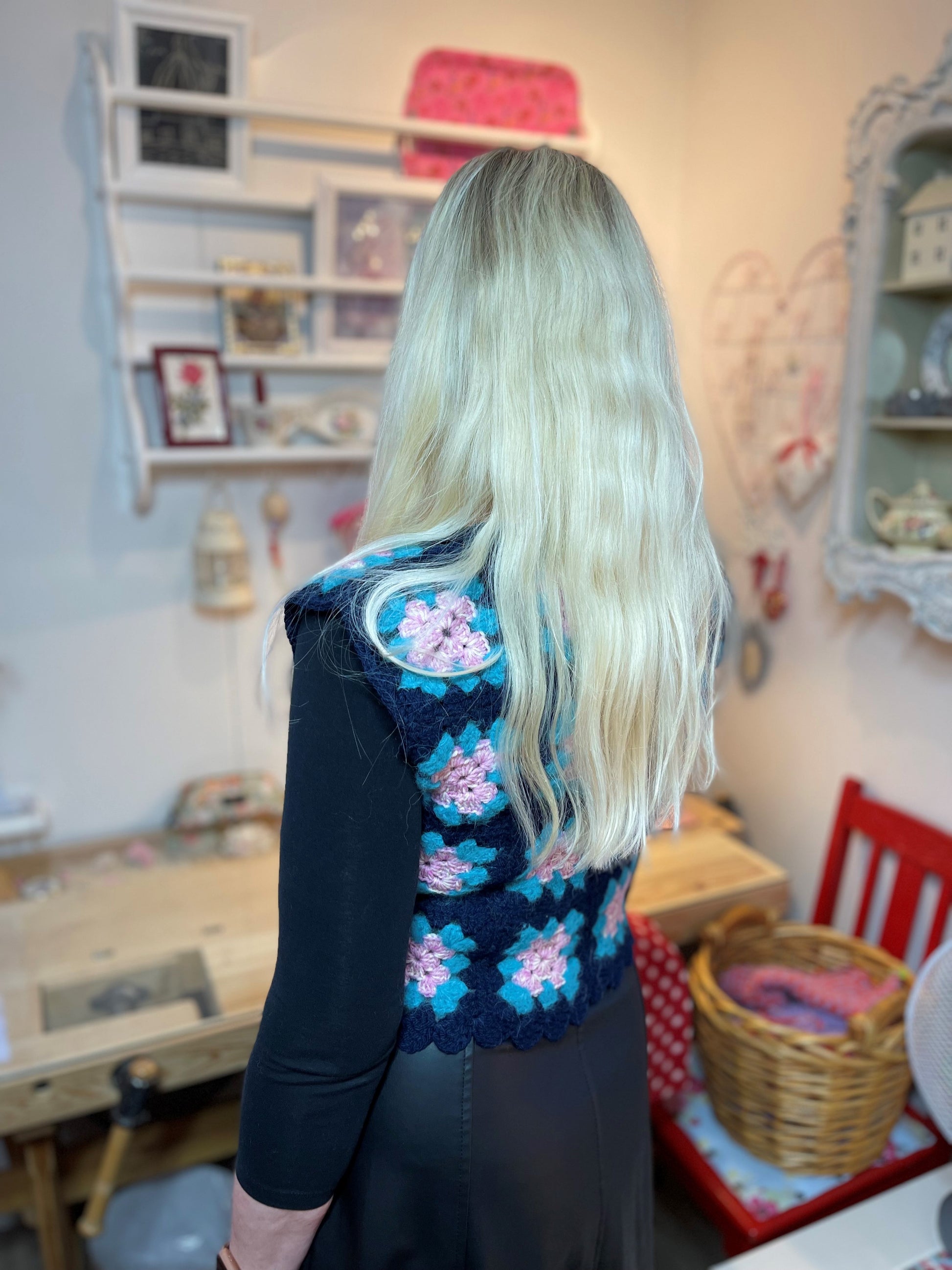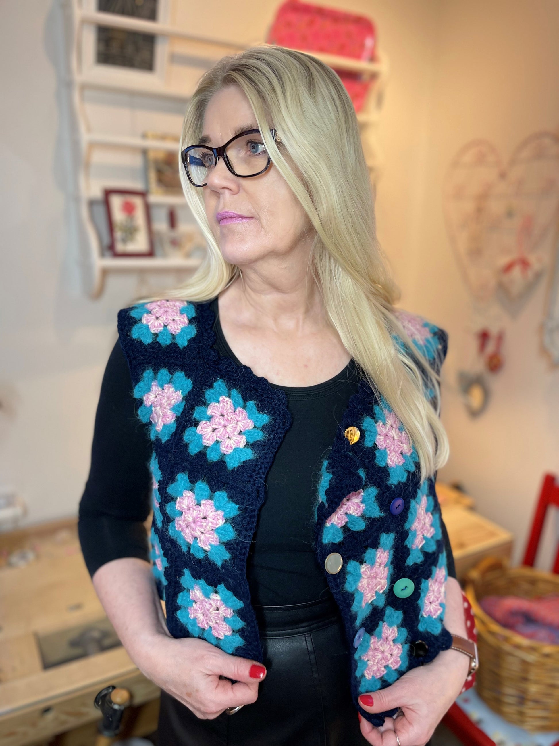 Vestið fékk nafnið Bláa dúllan! Enda er það heklað úr dúllum sem eru bláar og bleikar og er vestið með tvöfaldri röð af hnöppum eða tölum sem engin er eins sem setur mikinn svip á flíkina og skapar möguleika á að hneppa vestinu á fleiri en eina vegu. Bláa dúllan er fallegt við gallabuxur og pils eða jafnvel yfir kjóla. Vestið var hannað að hausti þegar þroski bláberjanna í lynginu heillaði og lokkaði þegar farið var út í náttúruna. Bláa dúllan er falleg og sérstök flík sem hefur ríka skírskotun til arfleifðar íslendinga í hlýleika gömlu „ömmu“ teppanna.