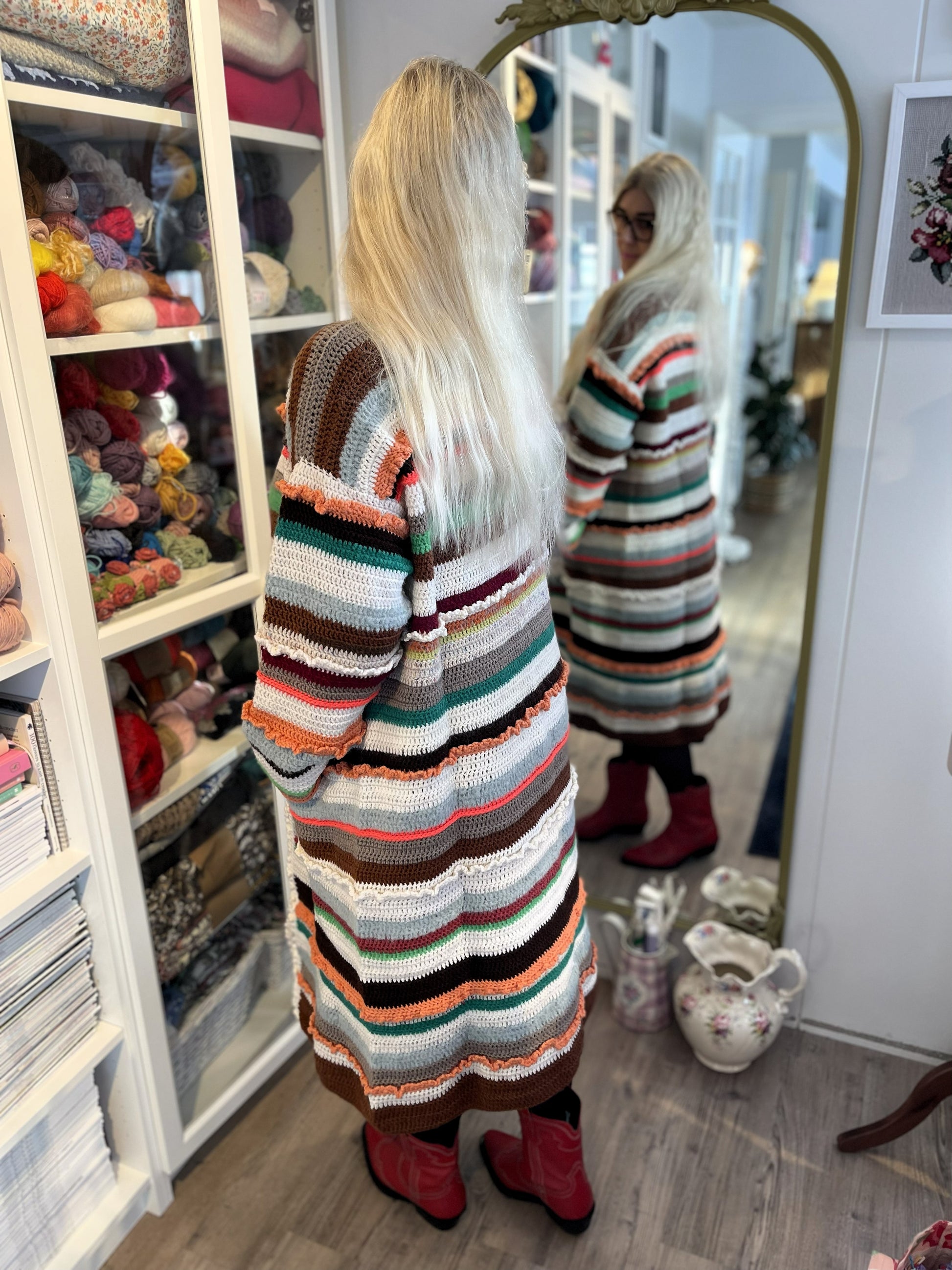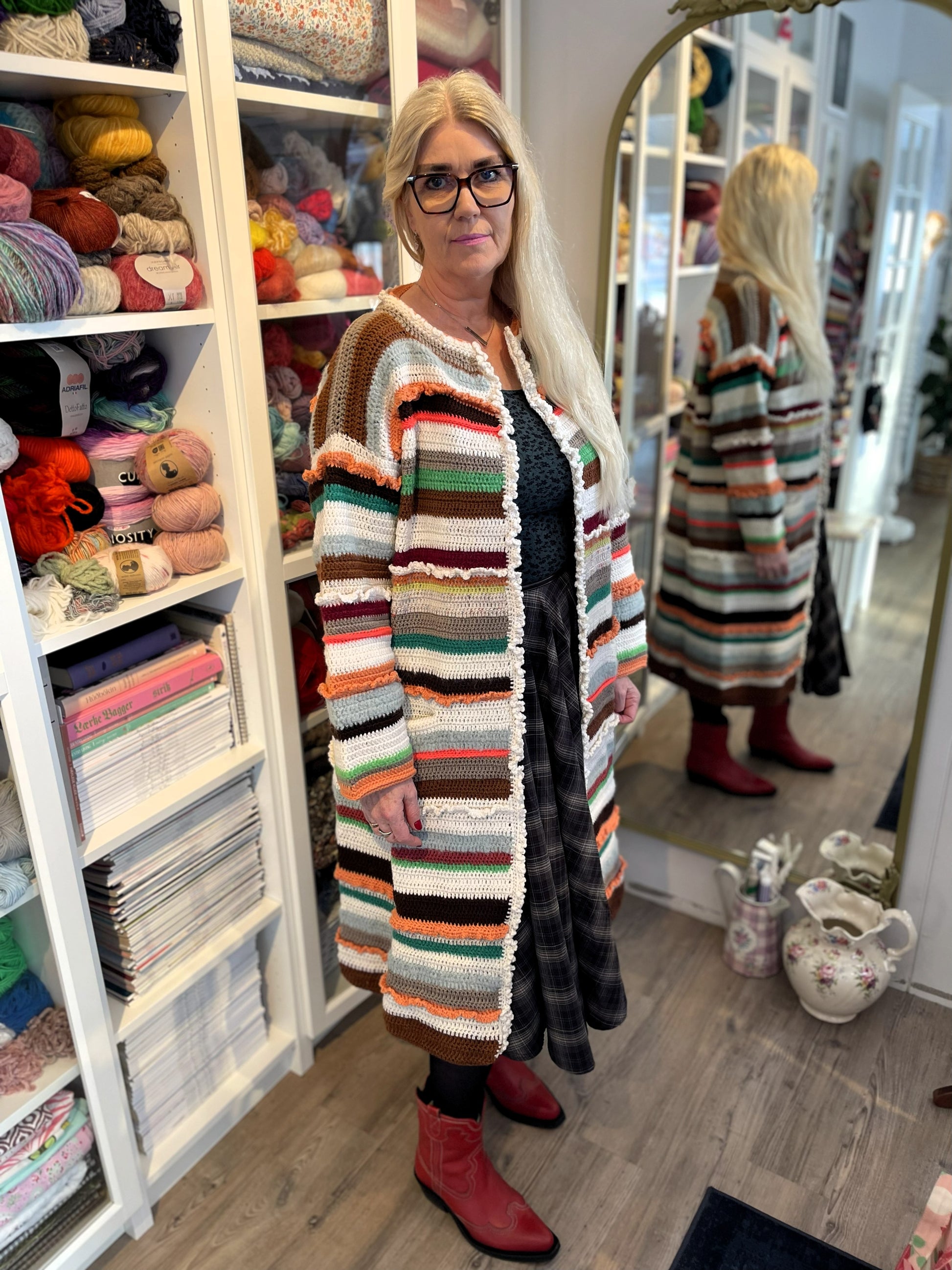 Síð og mikil, opin peysa sem hefur mikla notkunar möguleika. Á henni eru vasar en engir hnappar og auðvelt er að skella á flíkina fallegu belti ef vill. Þetta er hin mesta gæða flík, ekta “golla” sem gott er að grípa til við hin ýmsu tækifæri. Flíkin er í fallegri litasamsettningu sem passar alltaf við hvort sem það er haust-vetur-vor eða sumar. Hún er þétt hekluð með nokkrum skemtilegum útfærslum sem setja mikinn svip á heildar útlitið. Þetta er frábær flík sem nauðsynlegt er að eiga í fataskápnum.