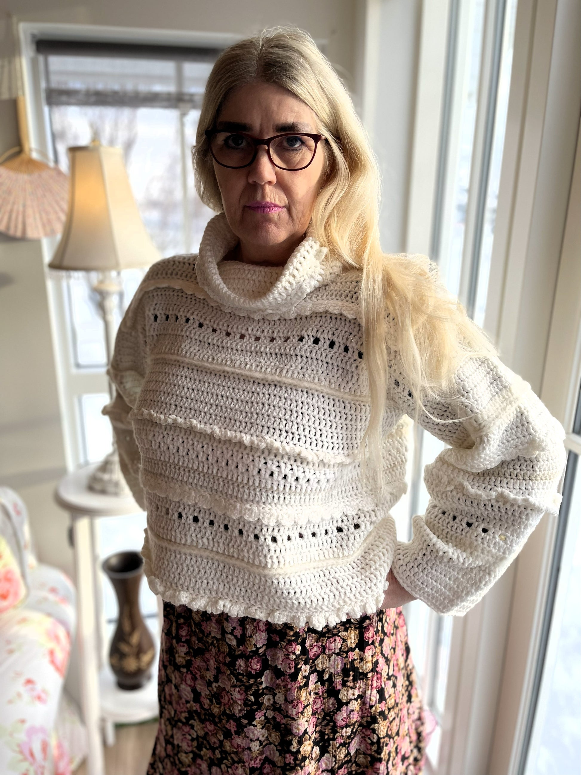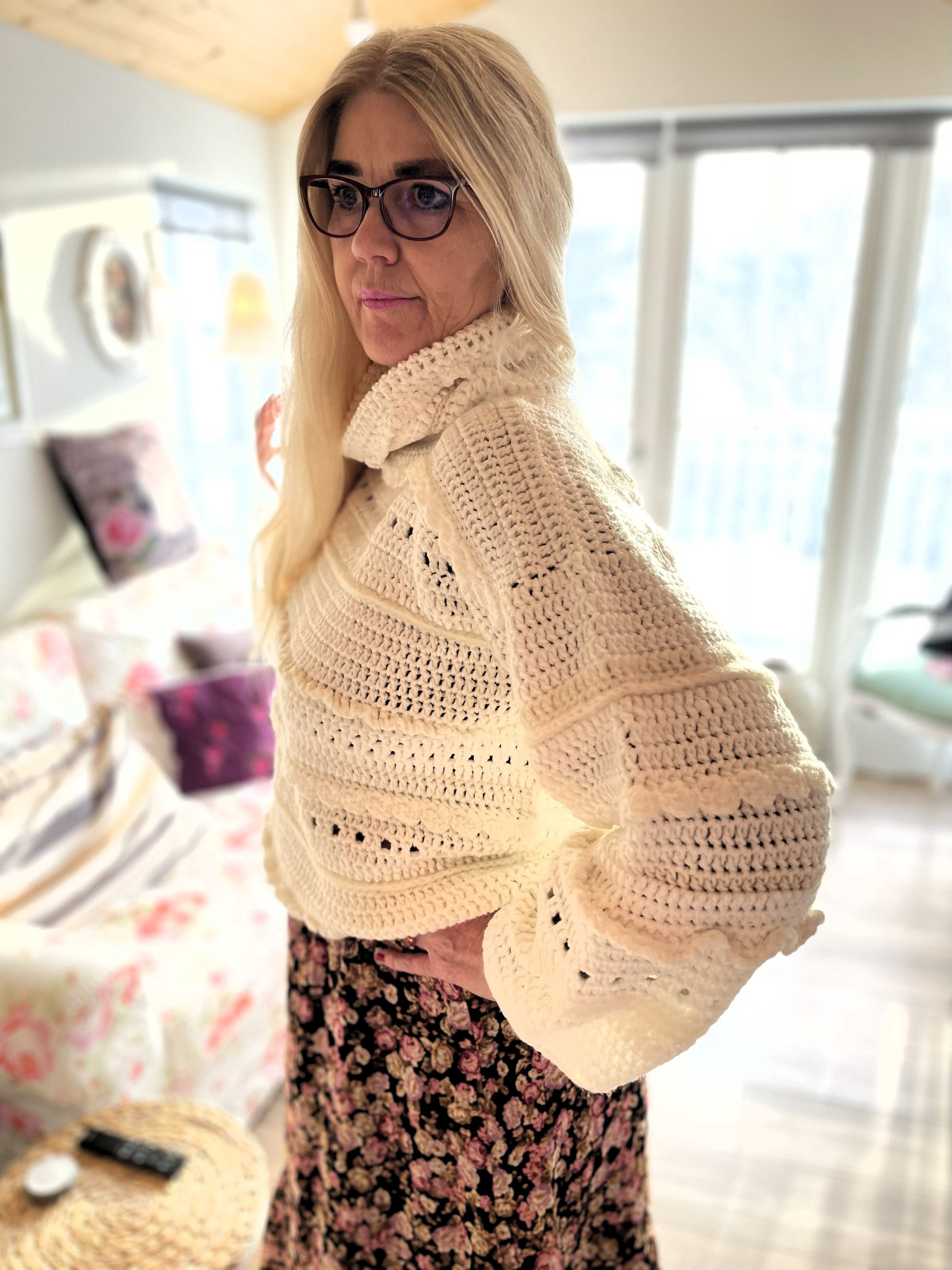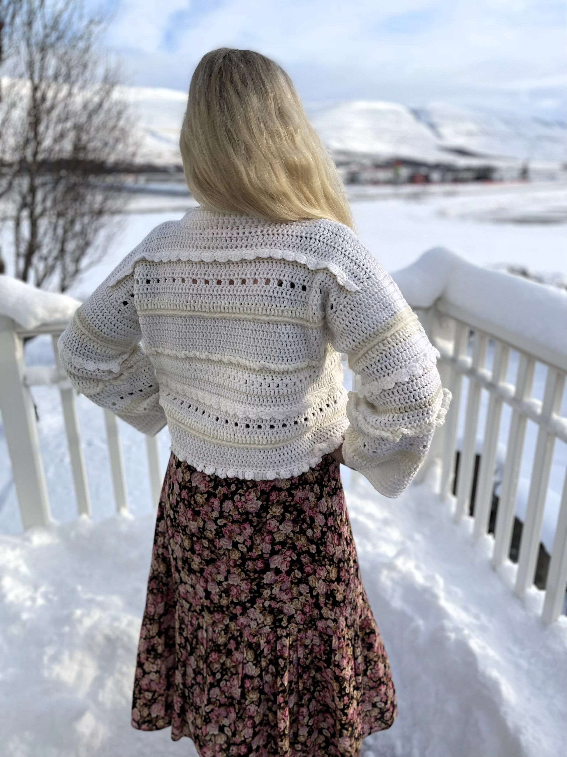 Tær eins og bólstrandi hvít og mjúk ský á himni enda ber hún nafnið Ský þessi dásamlega fallega peysa. Hún er mjúk viðkomu og mátast vel og vekur hvarvetna eftirtekt. Ský er hekluð með munstri úr fjölbreyttu garni sem gefur henni fallegan karakter. Hún hefur gæðalegan hálskraga, hlýjan og góðann. Dásamlega Ský er drauma-peysan enda draumi líkust.