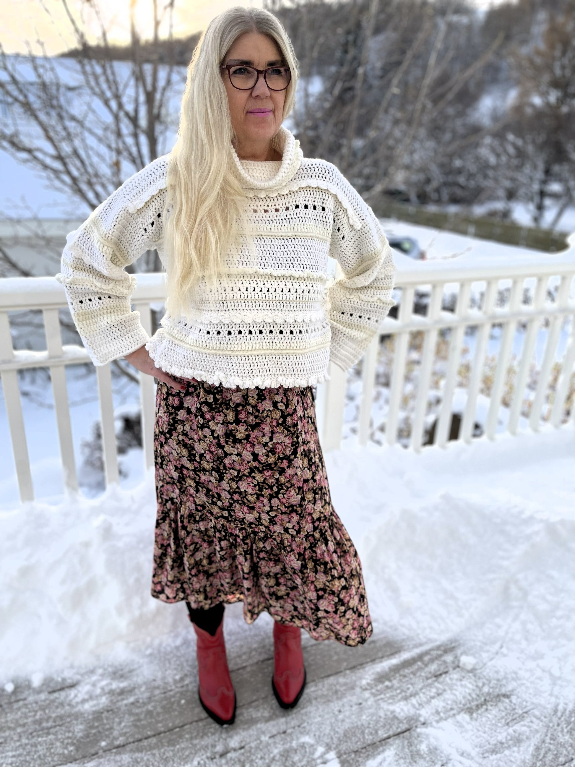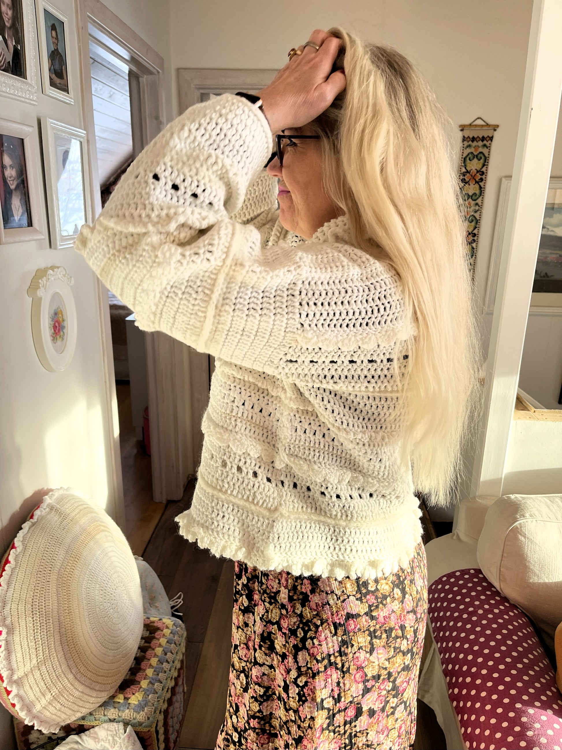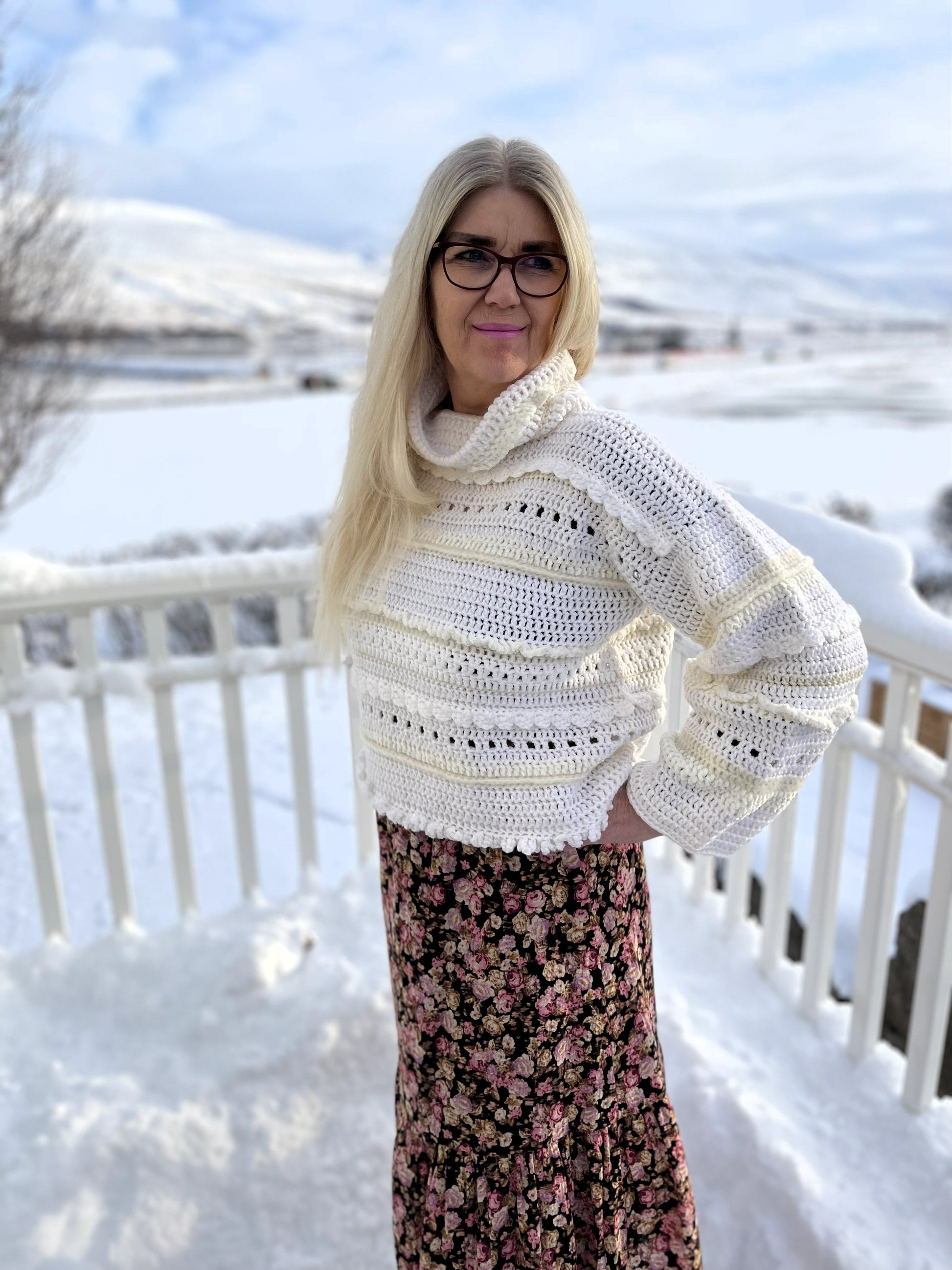 Tær eins og bólstrandi hvít og mjúk ský á himni enda ber hún nafnið Ský þessi dásamlega fallega peysa. Hún er mjúk viðkomu og mátast vel og vekur hvarvetna eftirtekt. Ský er hekluð með munstri úr fjölbreyttu garni sem gefur henni fallegan karakter. Hún hefur gæðalegan hálskraga, hlýjan og góðann. Dásamlega Ský er drauma-peysan enda draumi líkust.