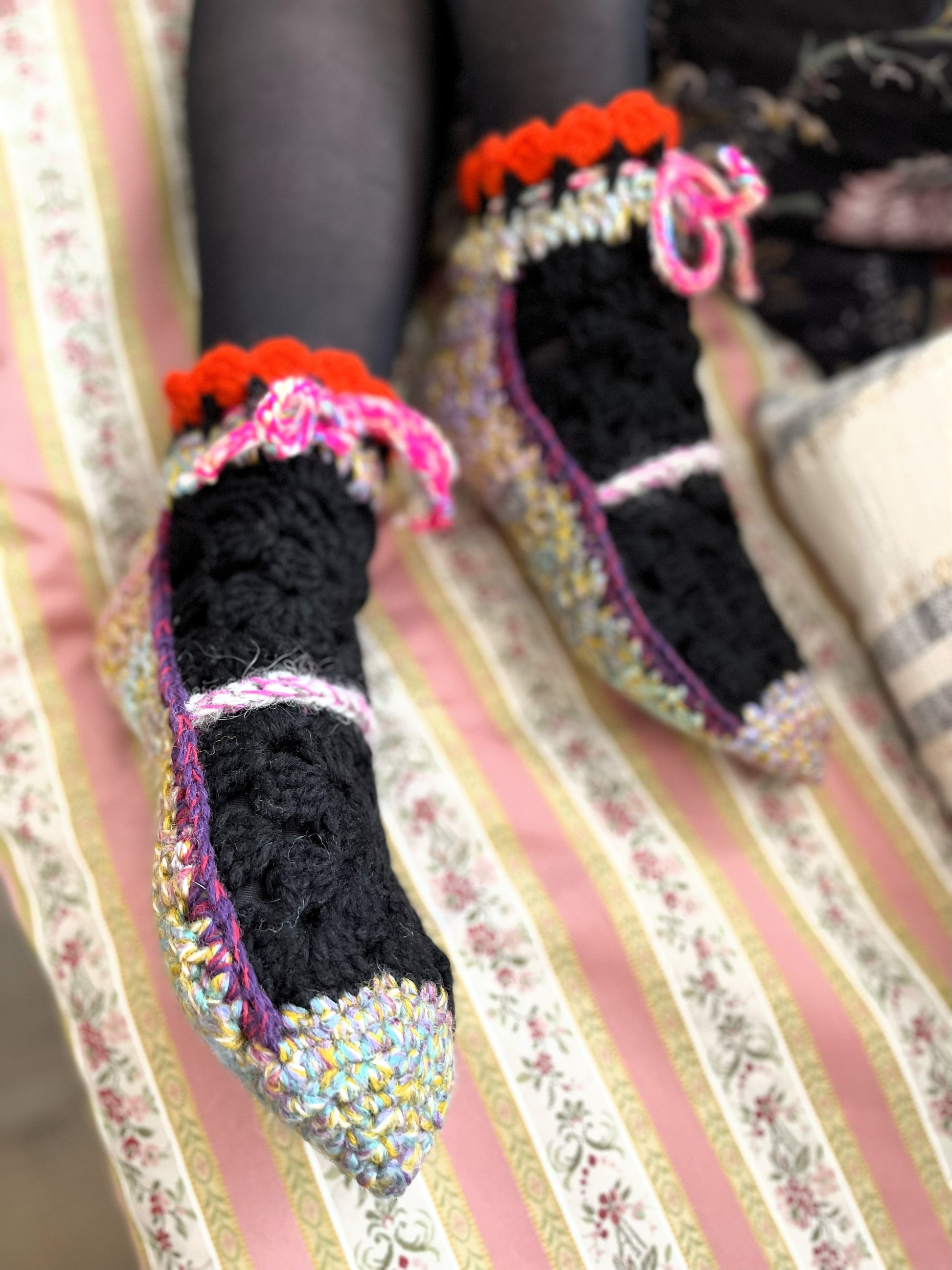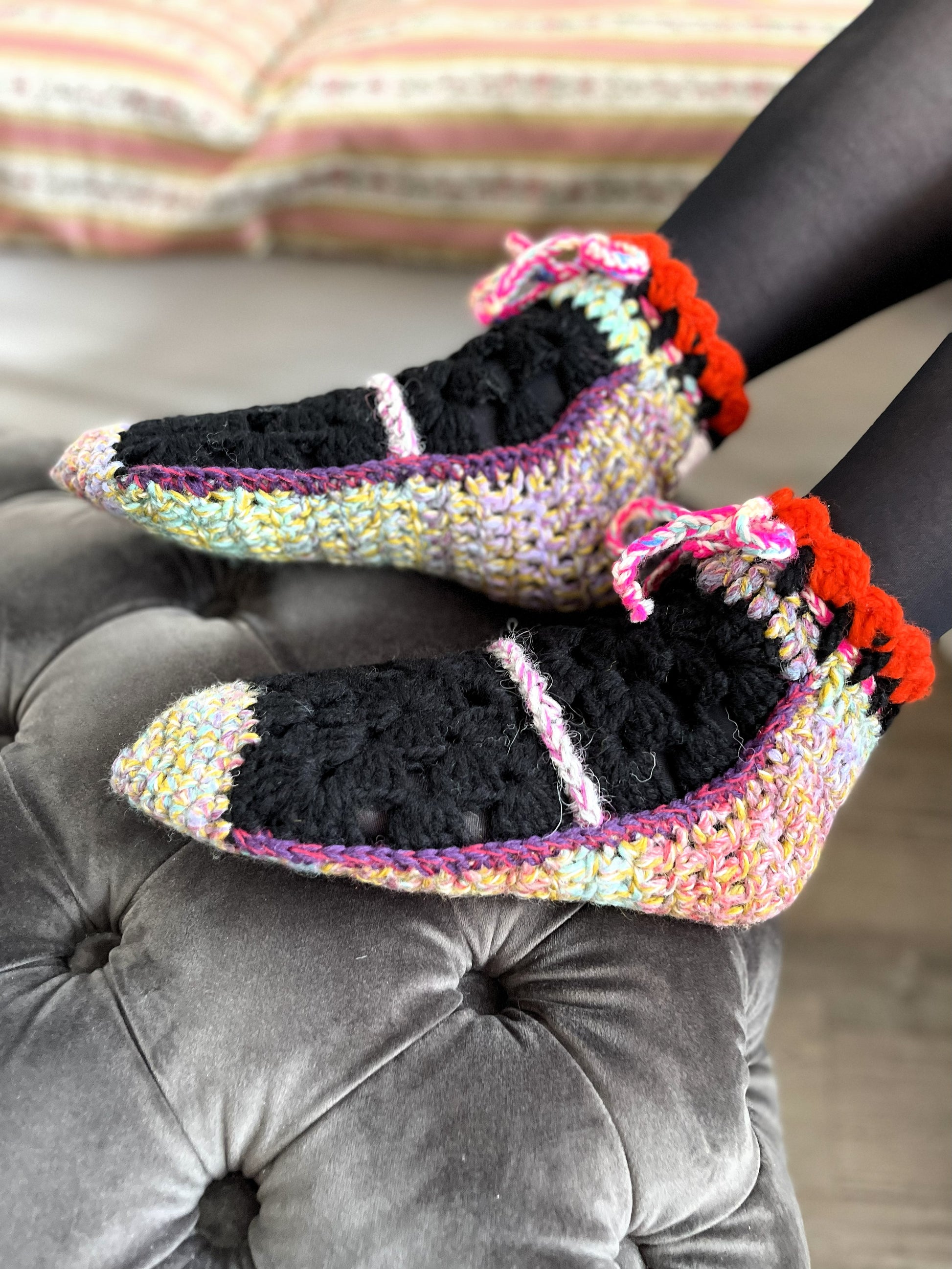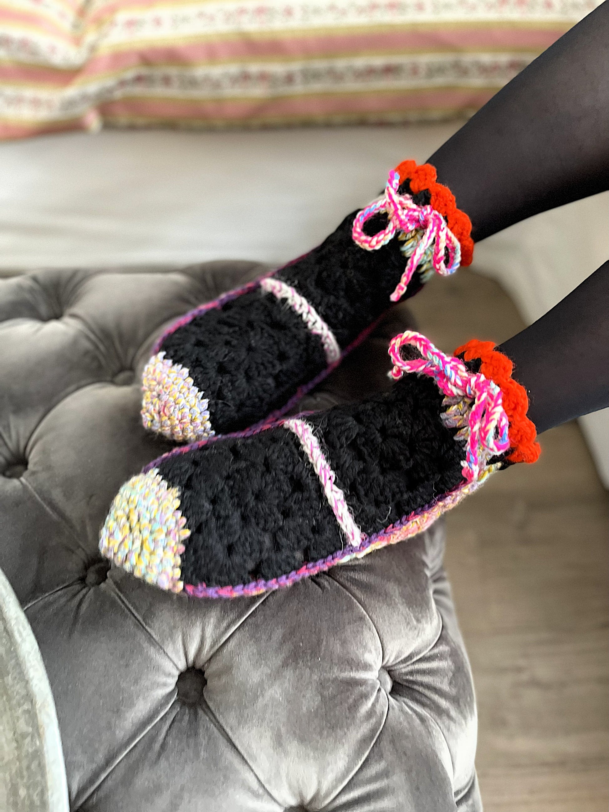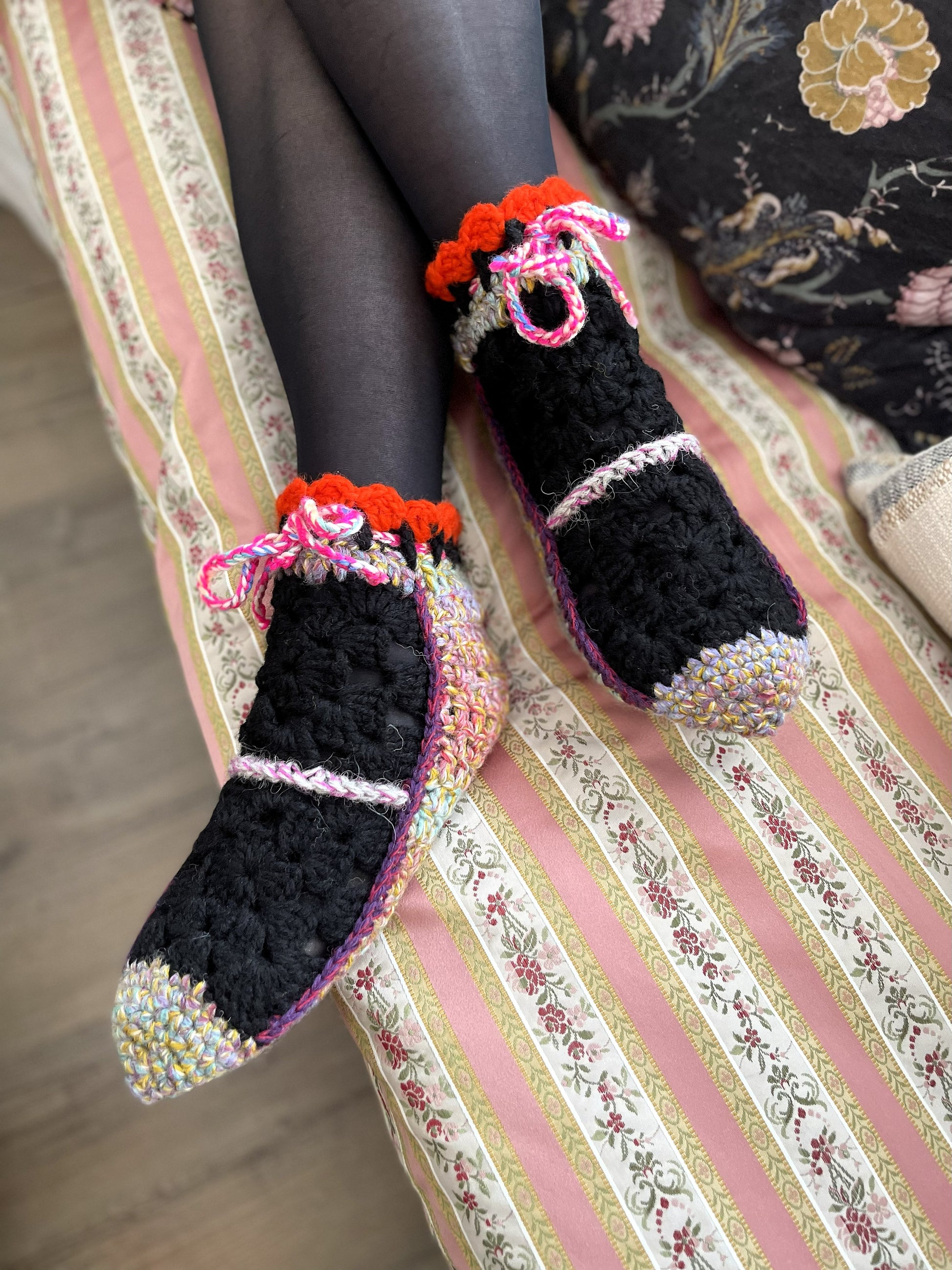 Þessir Dúllusokkar 1 eru hugsaðir sem heima-kósý-sokkar. Þeir eru heklaðir úr ömmu-dúllum og eru dregnir saman með hekluðu litríku bandi til að undirstrika notkun þeirra sem notalega heima-kósý-sokka. Þessir eru algjörir krútt og alveg nauðsynlegt að eiga eina svona til að bregða sér í þegar tásurnar eru kaldar eða bara til að hafa það kósý upp í sófa. Dúllusokkar 1 eru dásemdin ein, hlýjir og fallegir í senn.