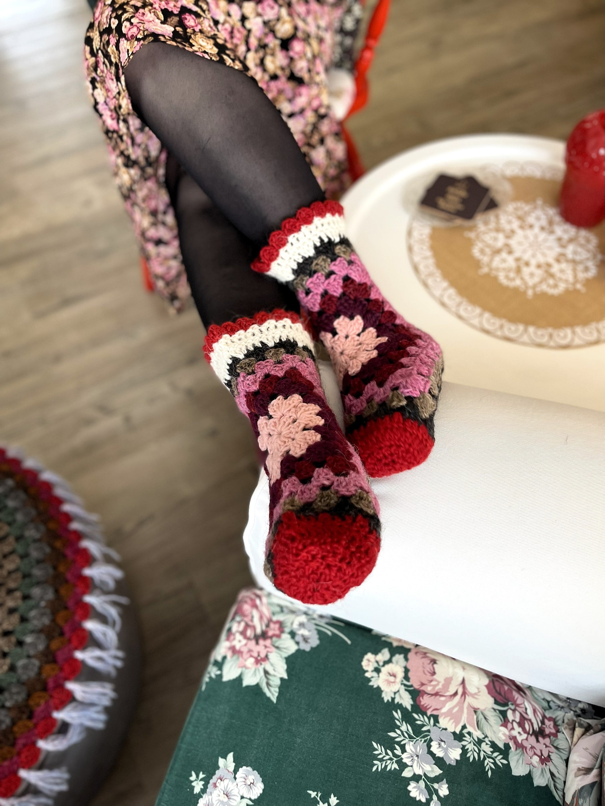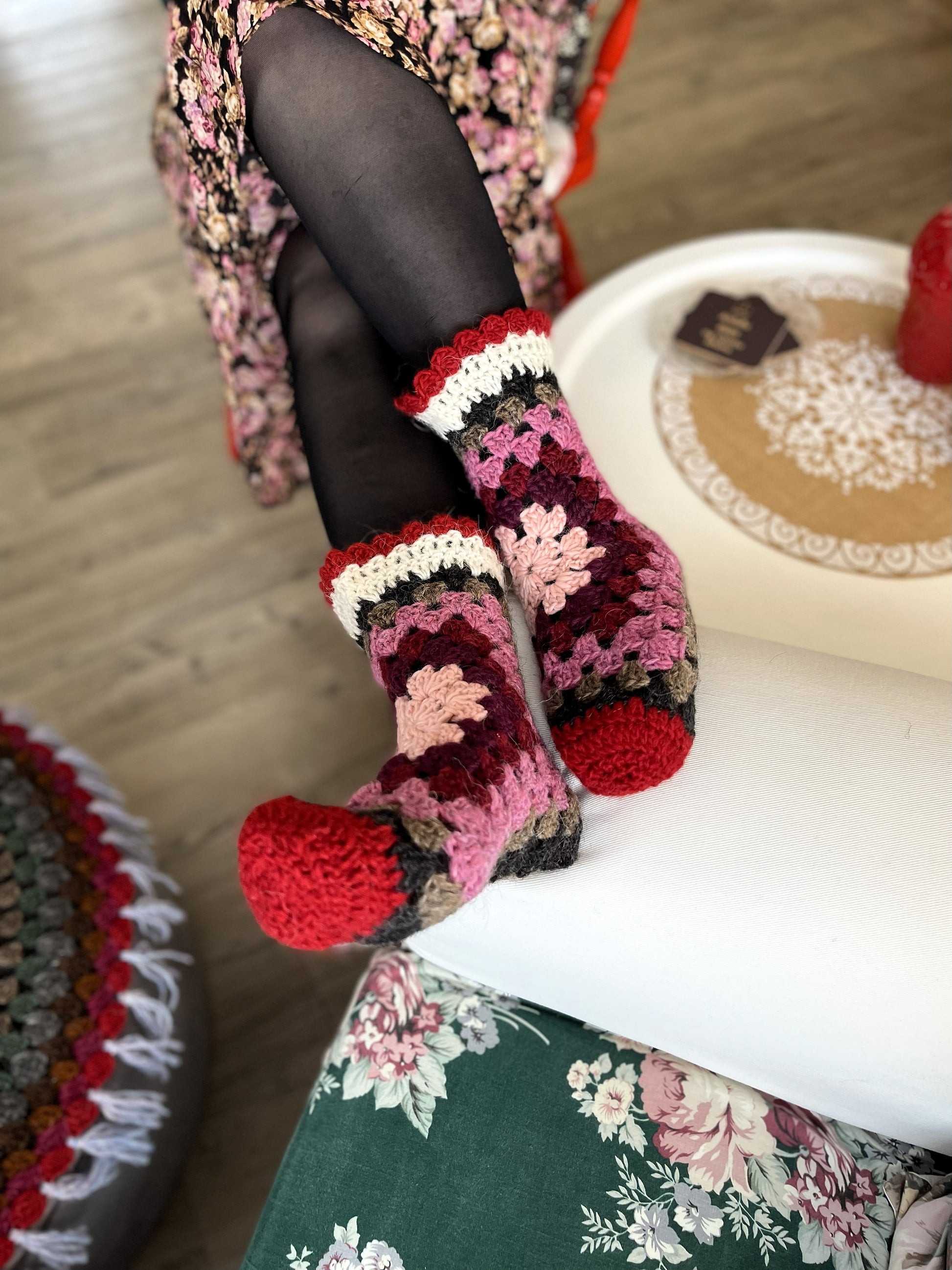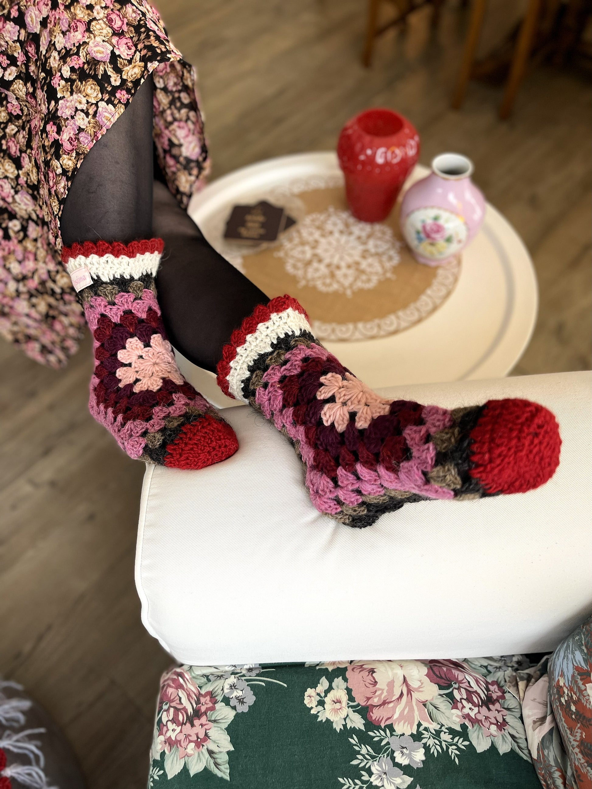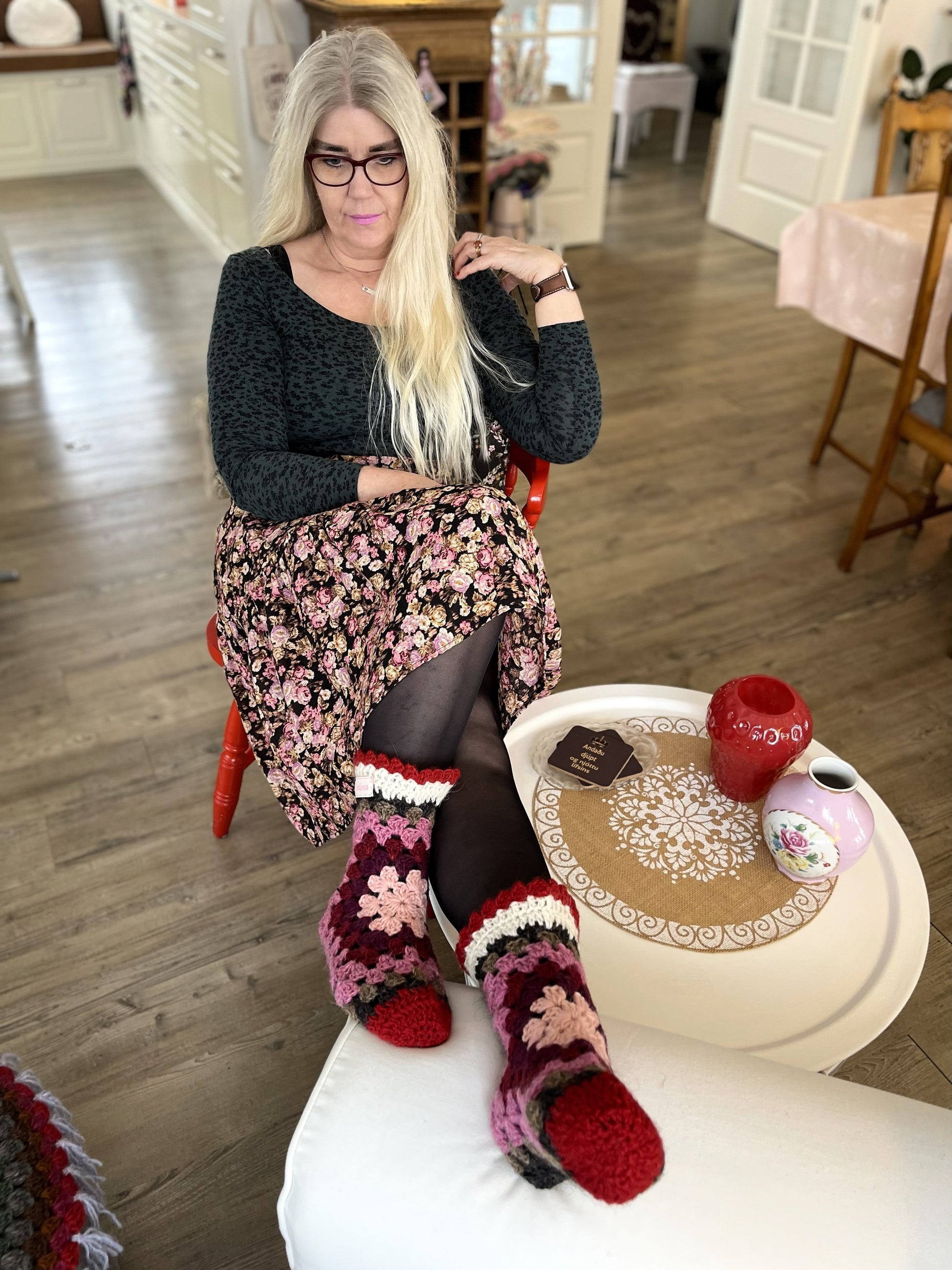Það þarf að eiga góða sokka á tásur, það er nauðsynlegt og ekki er verra að hafa þá einstaka eins og Lopasokkar 1 eru. Hér er á ferðinni hönnun þar sem ömmu-dúllan er útfærð með þessari dásamlegu útkomu. Lopasokkar 1 eru heklaðir úr lopa og því hlýjir og góðir og fallegir. Tilvalið að eiga eitt par þegar kulda sækir að en varúðar skal gæta að öllu öryggi þar sem lopasokkar yfir höfuð geta verið hálir að ganga í á gólfinu.