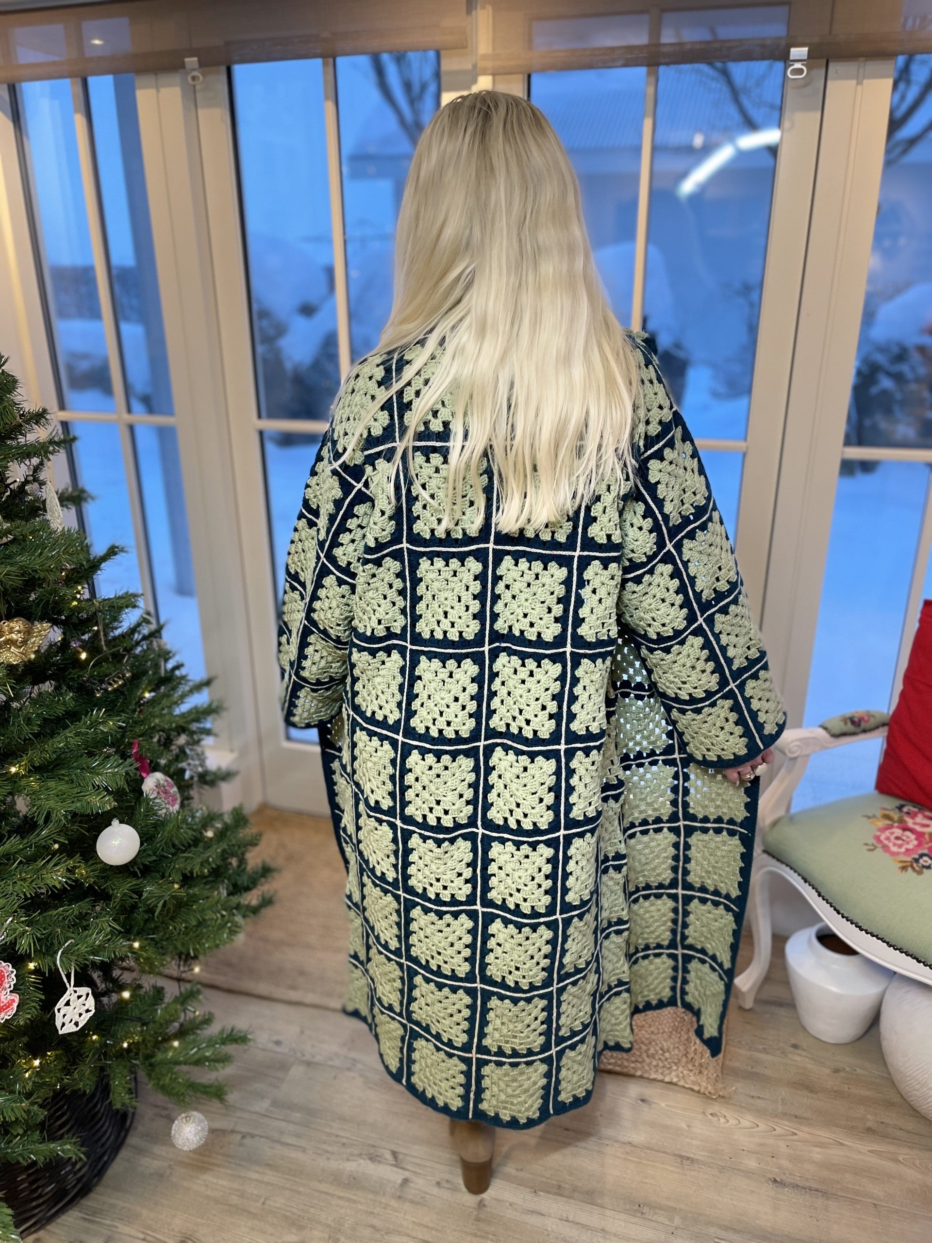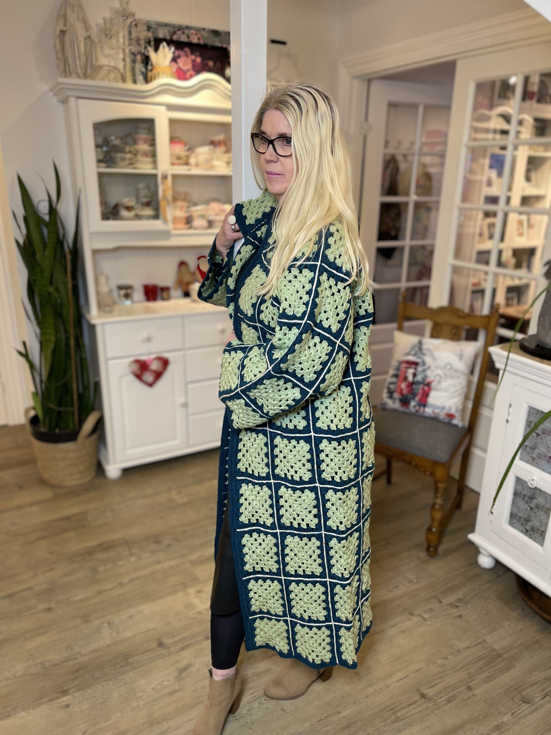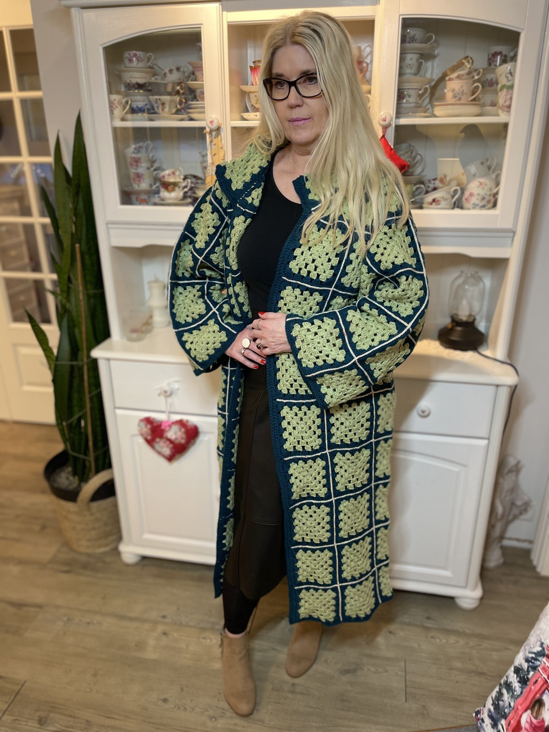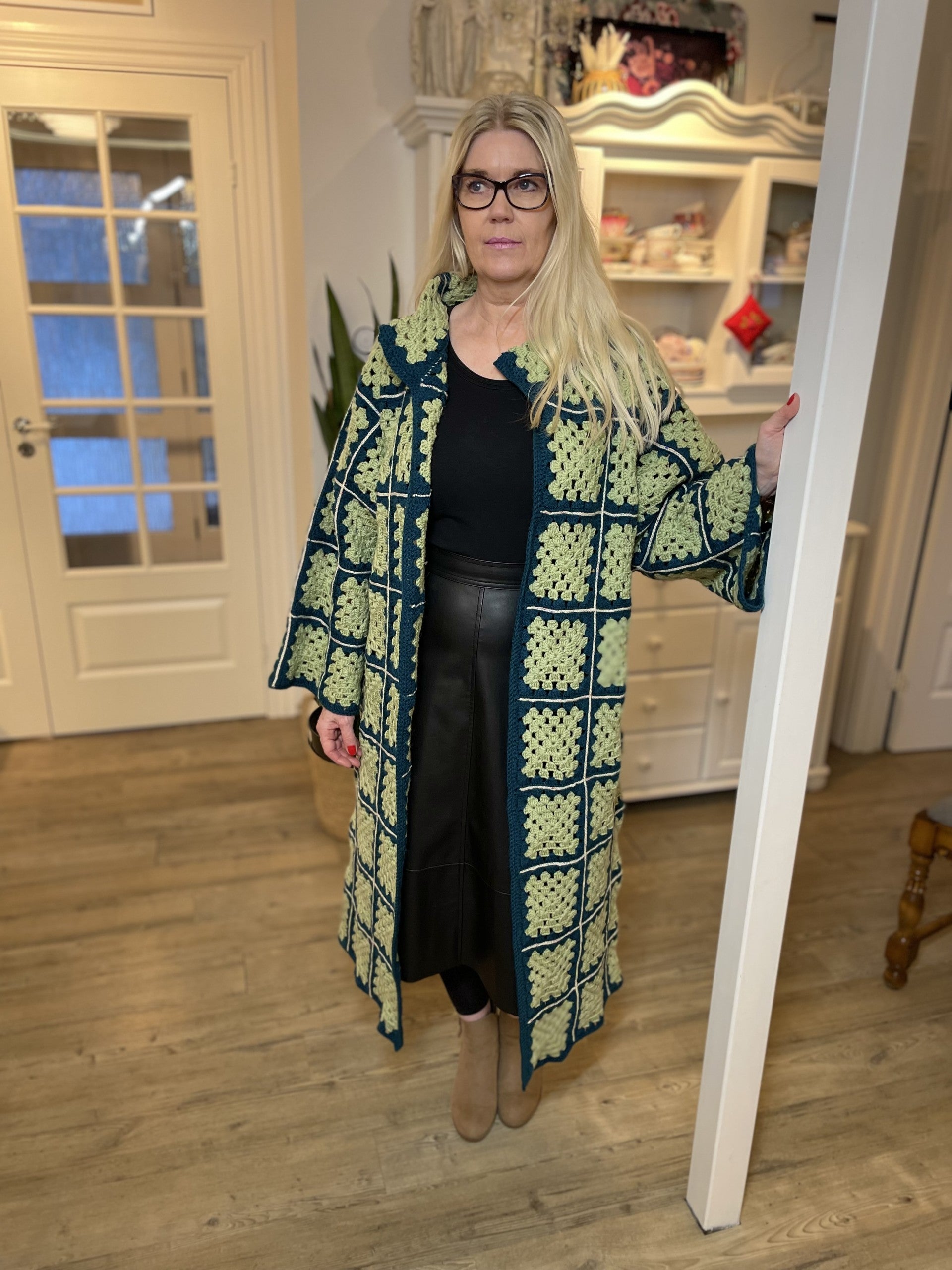 Allt er vænt sem vel er grænt! Sem passar vel við hér en þessi síða og allt um vefjandi fallega flík tekur vel utan um notandann með sínu fallega útliti og notalegheitum. Græna dásemdin, peysan eða kápan, eins og heyrst hefur er hekluð og samsett úr litlum dúllum sem gefur henni mikinn karakter og sér einkenni. Þetta er mikil flík sem hægt er að nota við ýmsar aðstæður og tilefni, úti í íslensku sumri eða til að fá hlýju í kroppinn þegar kuldi herjar að. Hún sómir sér vel við gallabuxurnar, pilsið eða kjólana og er einnig falleg bara opin og laus eða með fallegu leðurbelti í mittinu. Þessi síða peysa er tilvalin til þess að skella yfir sig á hraðferð. Að þjóta er að njóta!