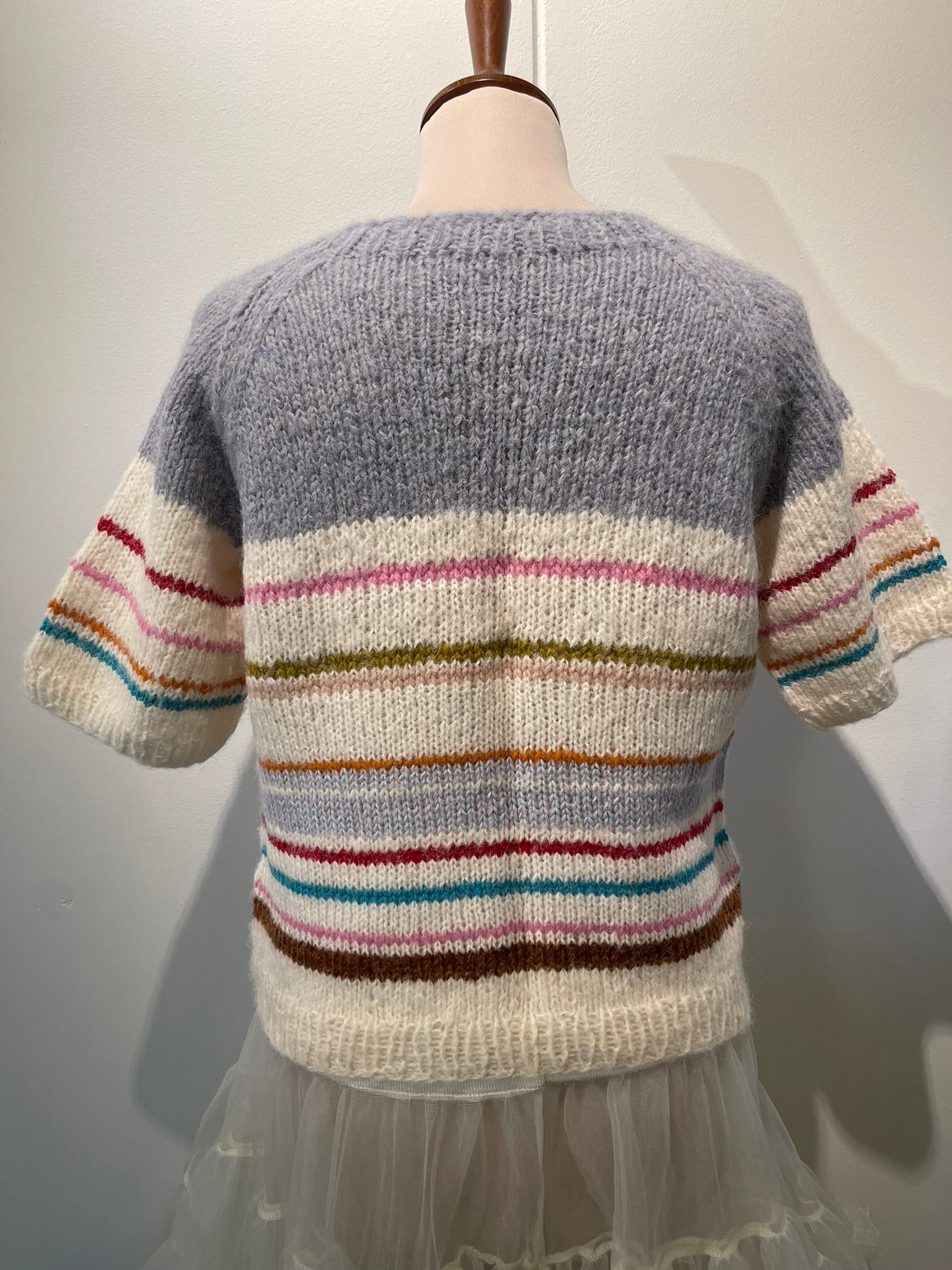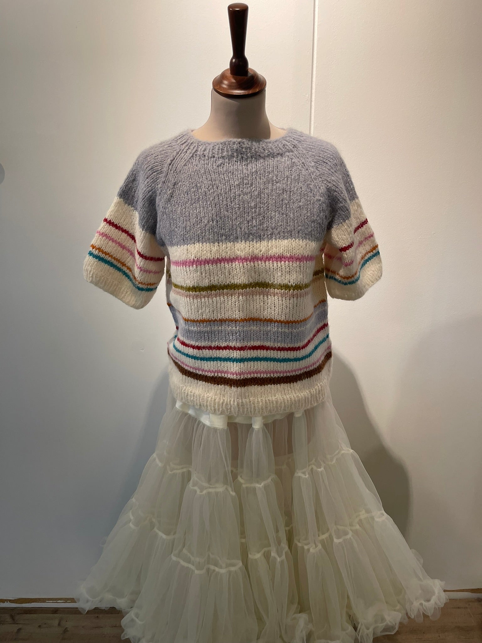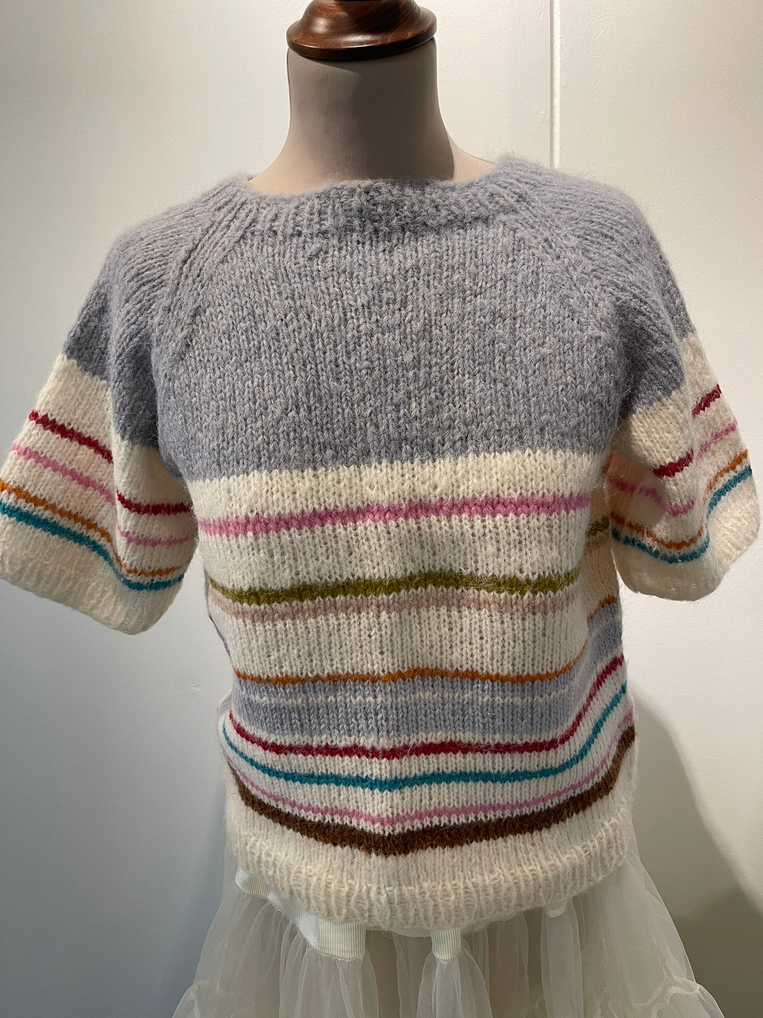 Stutterma peysa í ljósum litatónum prjónuð úr góðu garni með lask-ermum. Mjög lítið notuð flík og er falleg að nota við hvað sem er. Sídd á bol er hefðbundin og stærðin er S-M.