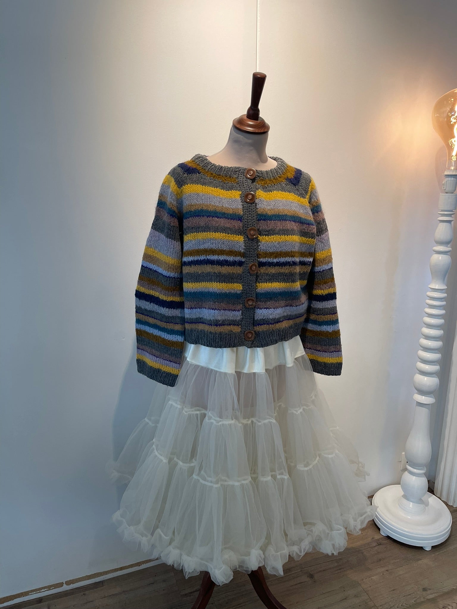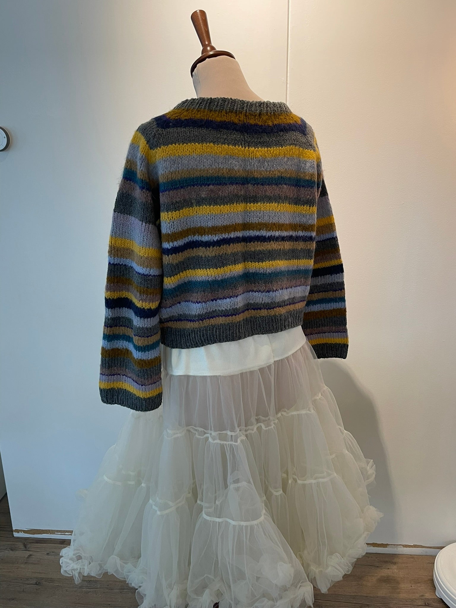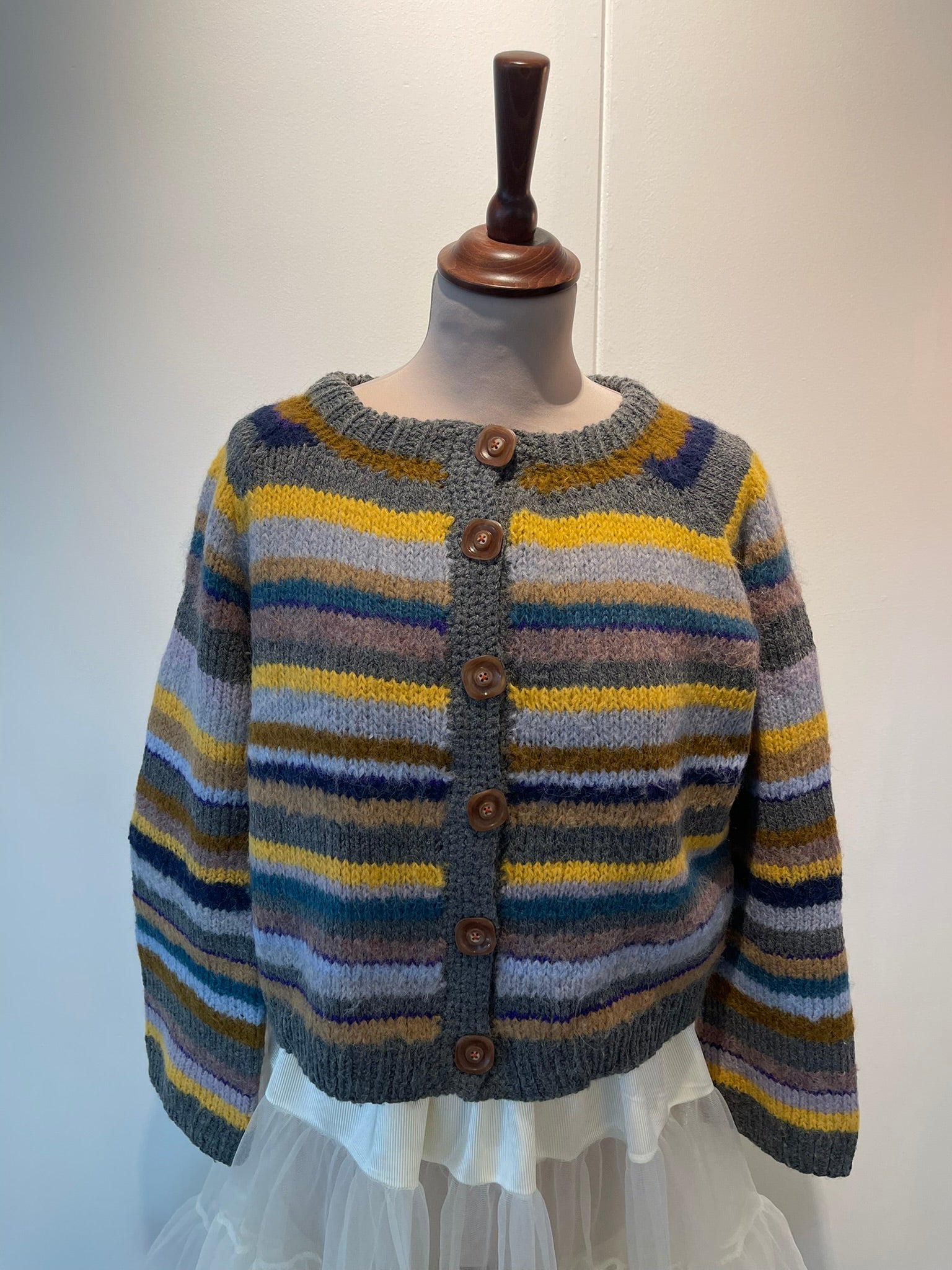 Haustleg og falleg, hlý og notaleg úr mjúku eðal garni. Hún er nokkuð hefðbundin í sniði með fulla sídd á ermum og bolur ekki of stuttur. Peysan er opin og prjónuð og með lask-ermum. Passar við hvað sem er að mínu mati. Stærð S-M.