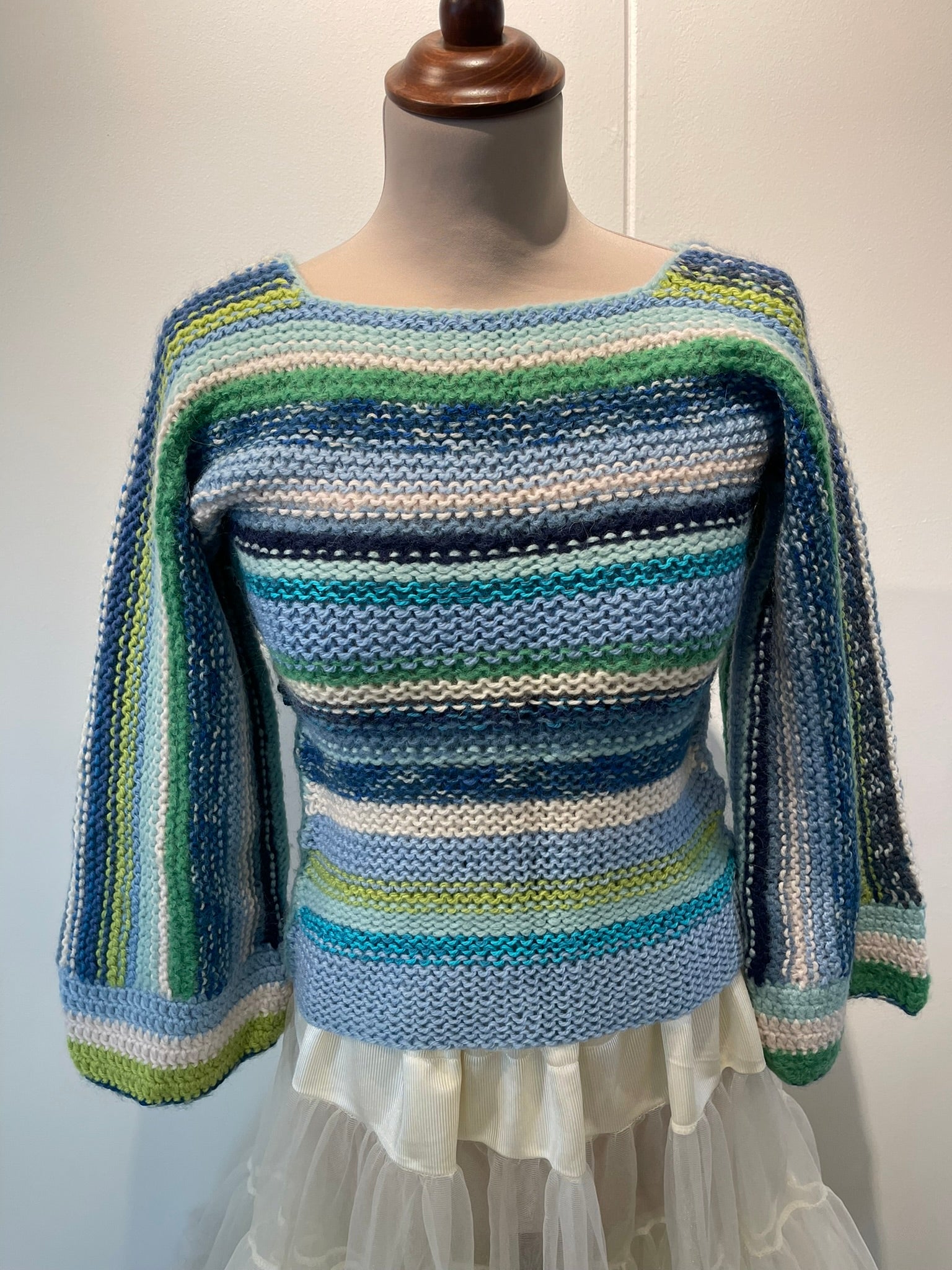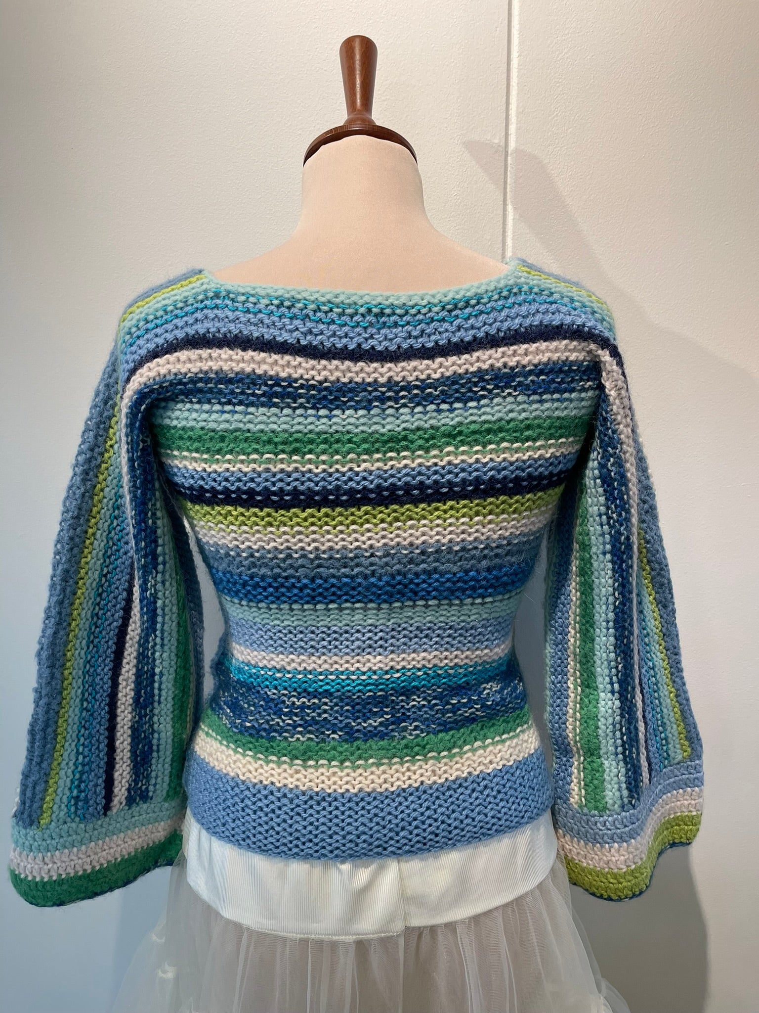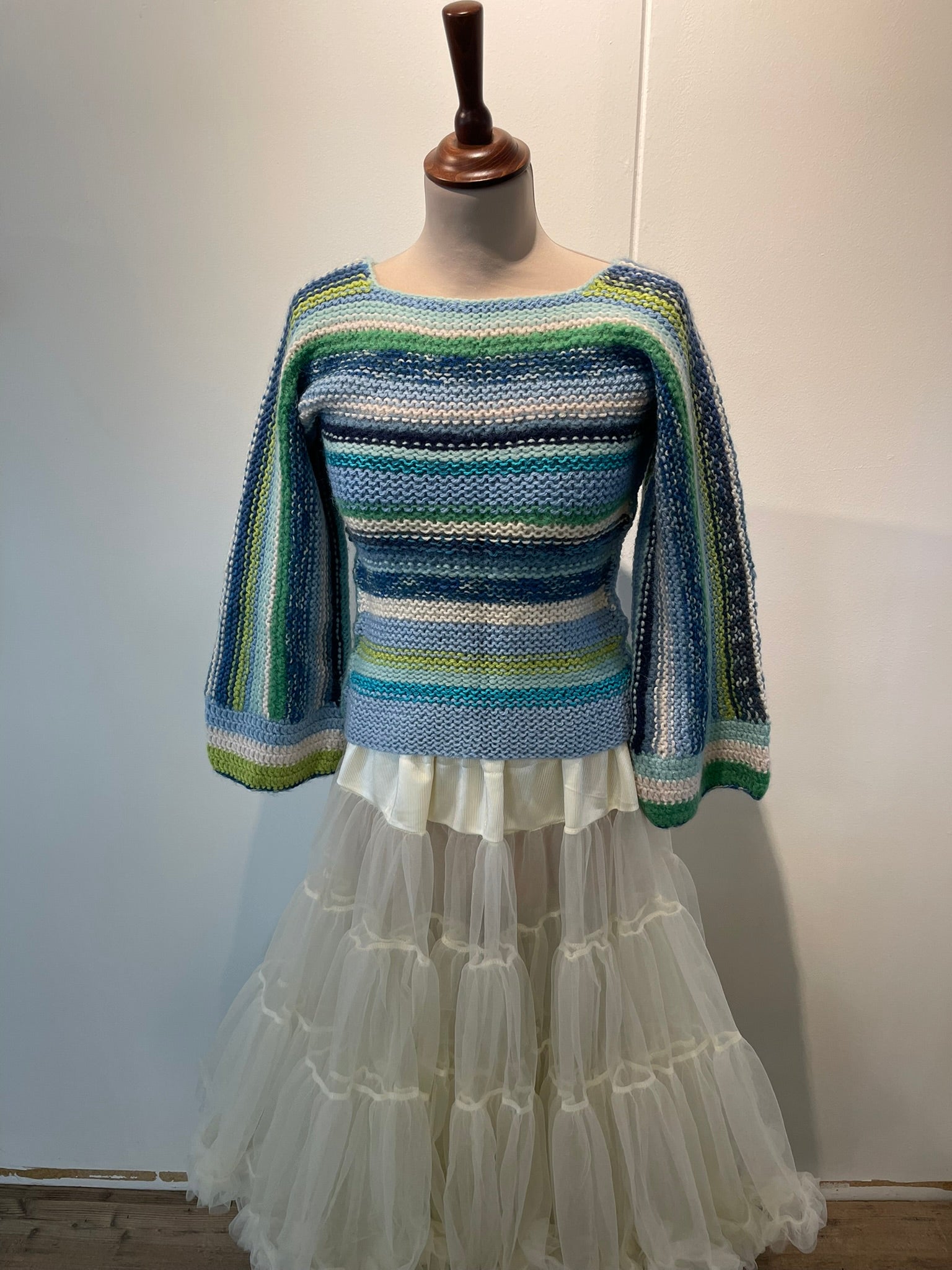 Fallegir litatónar einkenna þessa peysu en hún er einnig prjónuð úr garðaprjóni fram og til baka og hekluð saman. Ermar eru3/4 lengd og bolurinn stuttur. Einföld en falleg peysa, lítið notuð og stærðin er S.