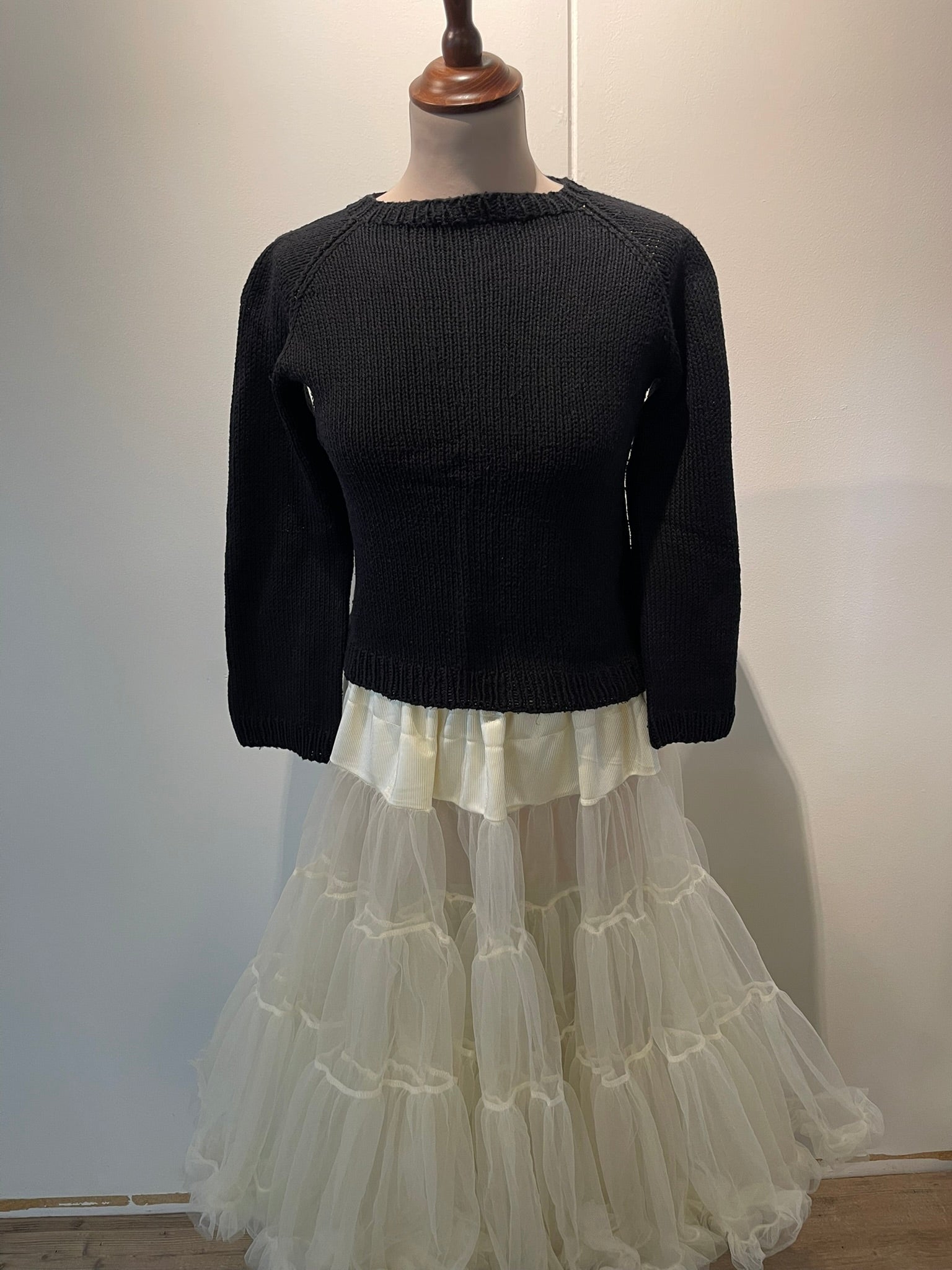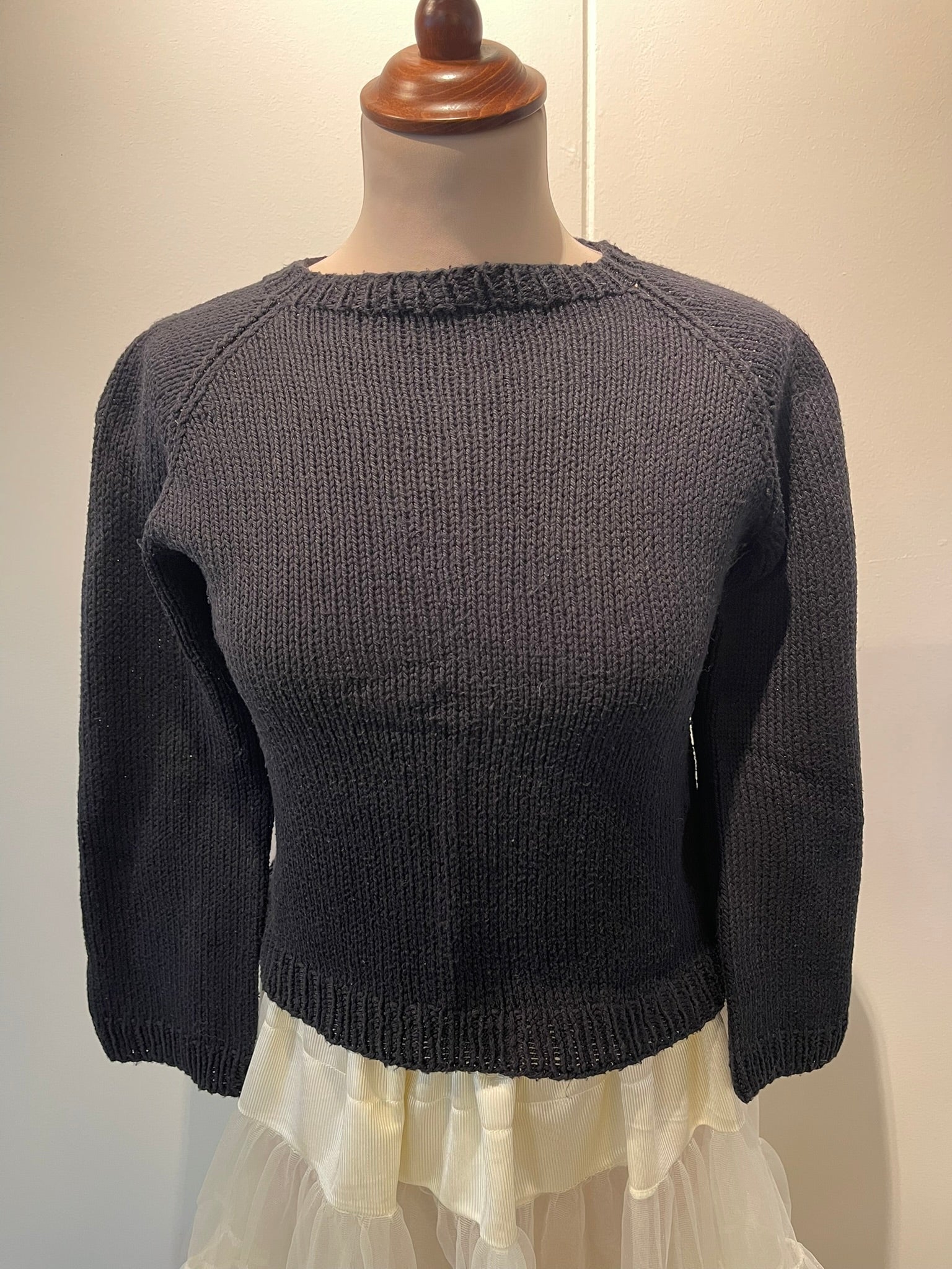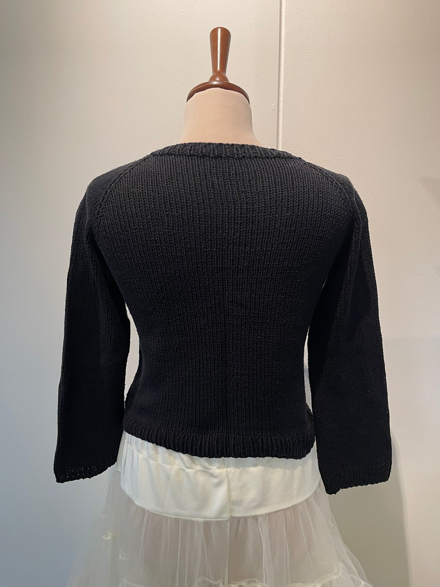 Svört og úr grófri bómull er þessi peysa. Ermar ¾ lengd og bolur stuttur. Falleg yfir kjóla og við pils. Mjög einföld peysa með lask-ermum. Lítið notuð en hún er mjúk og klassísk. Stærð S.