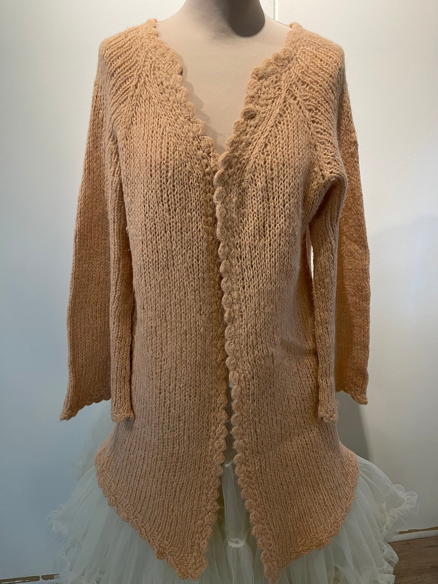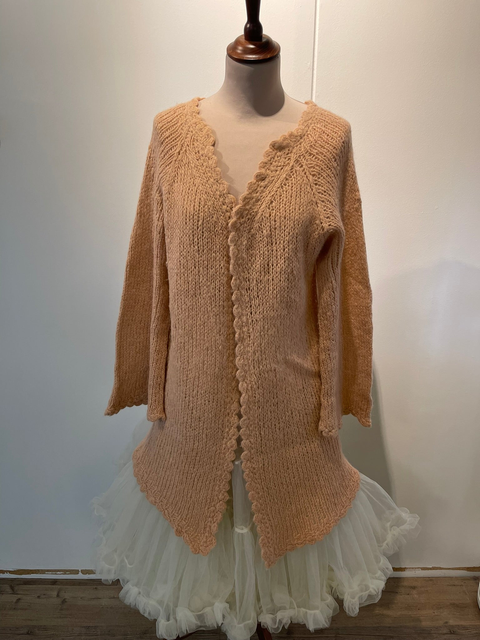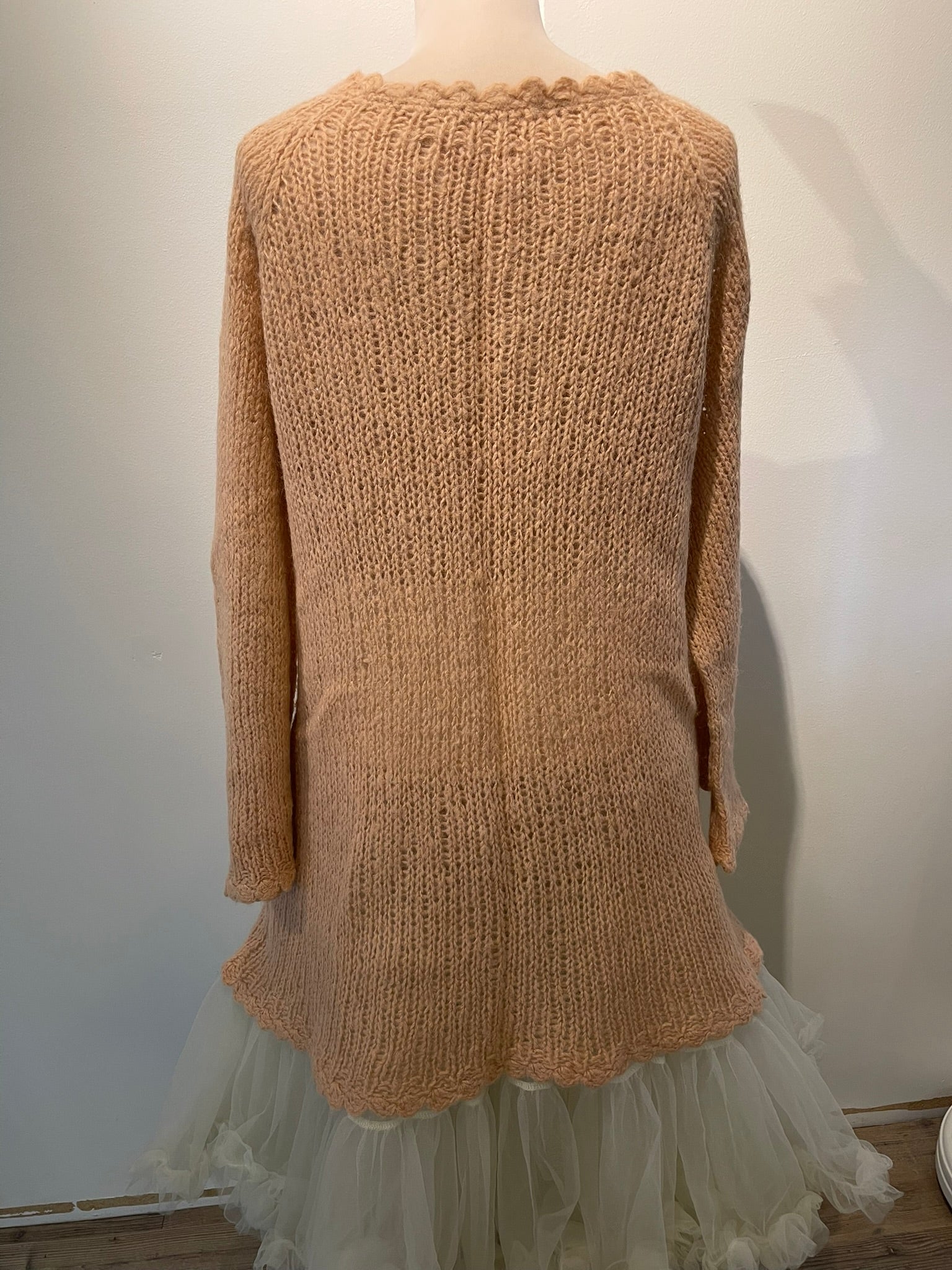 Þessi golla er prjónuð með heklaða kanta úr mjög mjúku og “fluffy” garni. Hún umvefur þann sem í hana fer og er tilvalin til að grípa í við tækifæri! Liturinn á henni er dásamlega ferskjulitur sem er svo ljúfur og notalegur. Ermar eru víðar og settar í með lask- úrtöku. Fallegt er að setja leðurbelti yfir peysuna í mittið en stærðin er S-L. Peysan getur notast við hvað sem er en hún er létt og leikandi og mjúk sem fiður.
