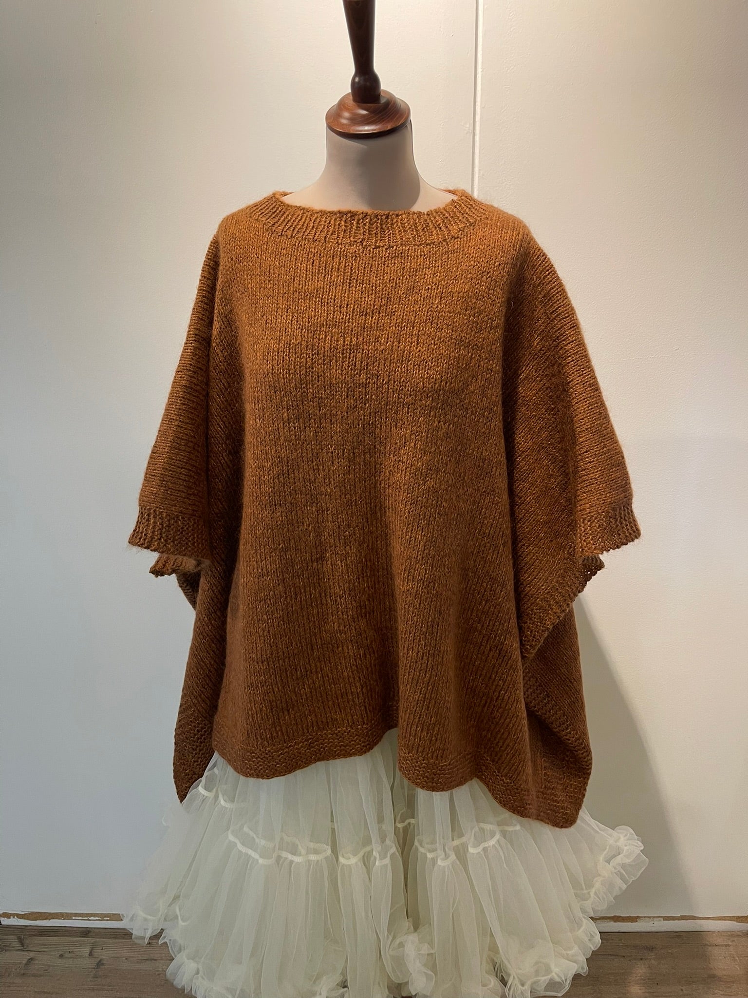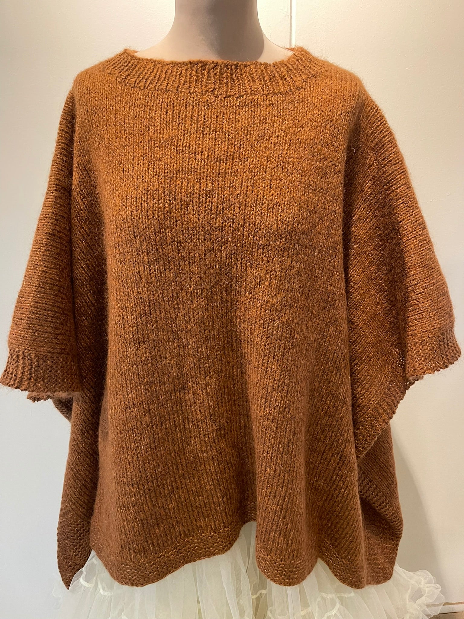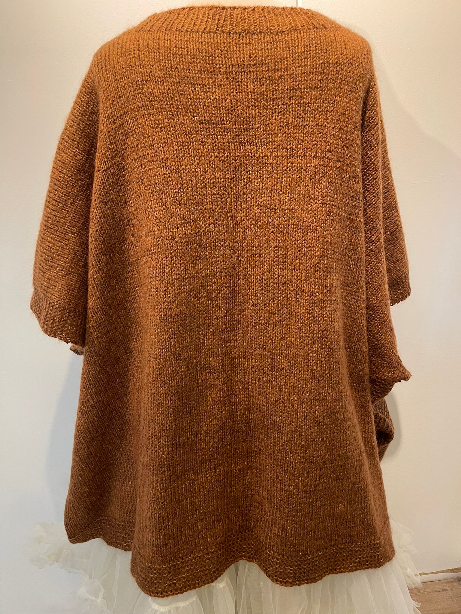 Þessi brúna slá er efnismikil úr hlýju tvöföldu eðal-garni. Hún er víð og síð og hlý þar sem síddin er örlítið styttri að framan en að aftan. Á hliðum er op fyrir hendur og hjá mér náði flíkin niður á 3/4 handleggi. Stærð fyrir alla og er þessi flík mjög smart fyrir þá sem eru fyrir föt með mikilli vídd í.