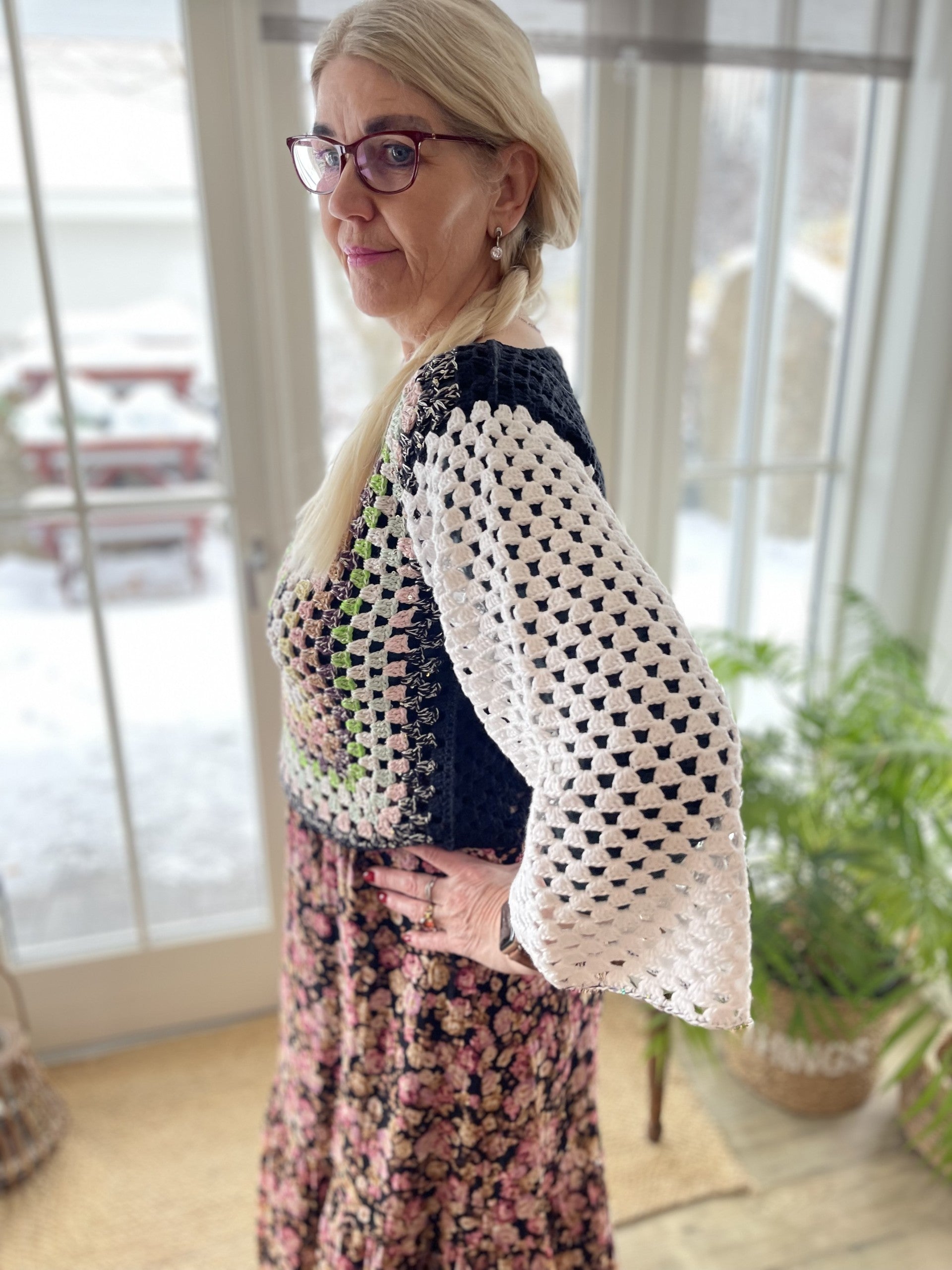 Þessi peysa er hekluð með fallegum skrautþræð á framstykkinu, sem setur mikinn svip á flíkina. Peysan er létt og leikandi og mjög sparileg enda hefur hún einungis einu sinni verið notuð og það á árshátíð. Falleg peysa í stærðinni S.