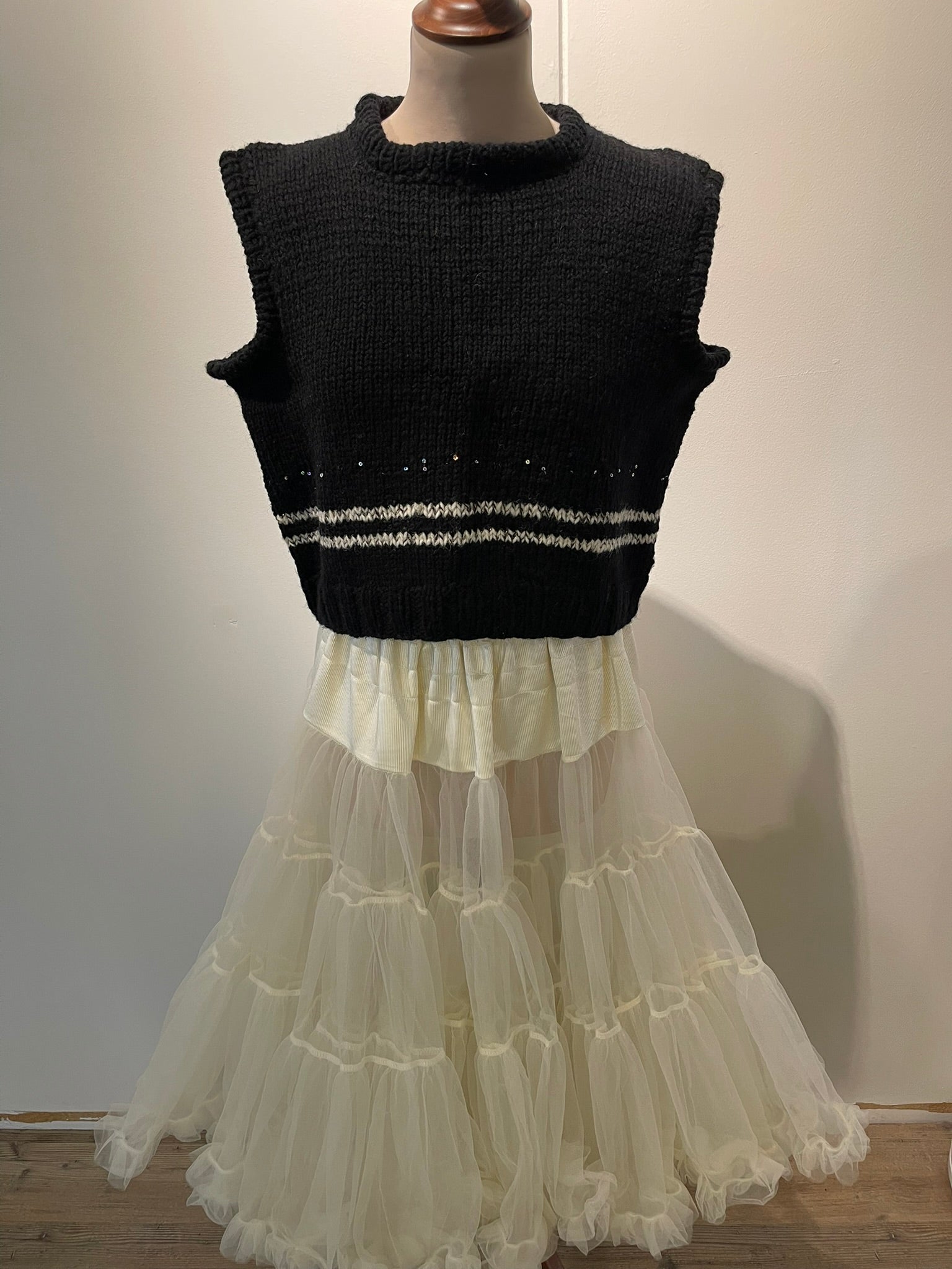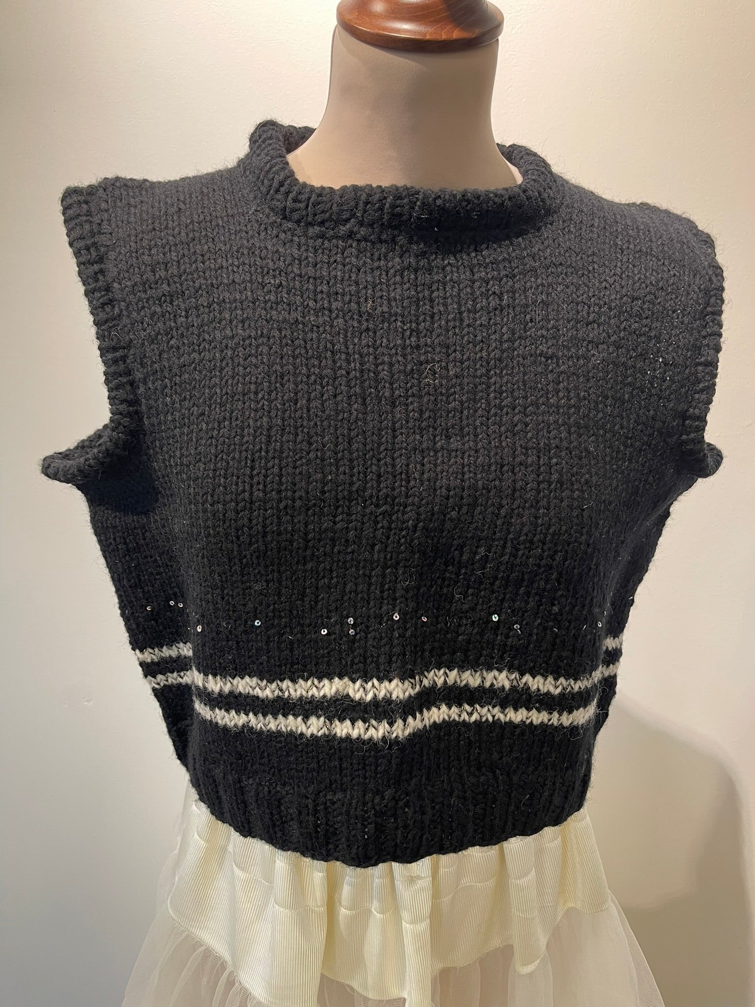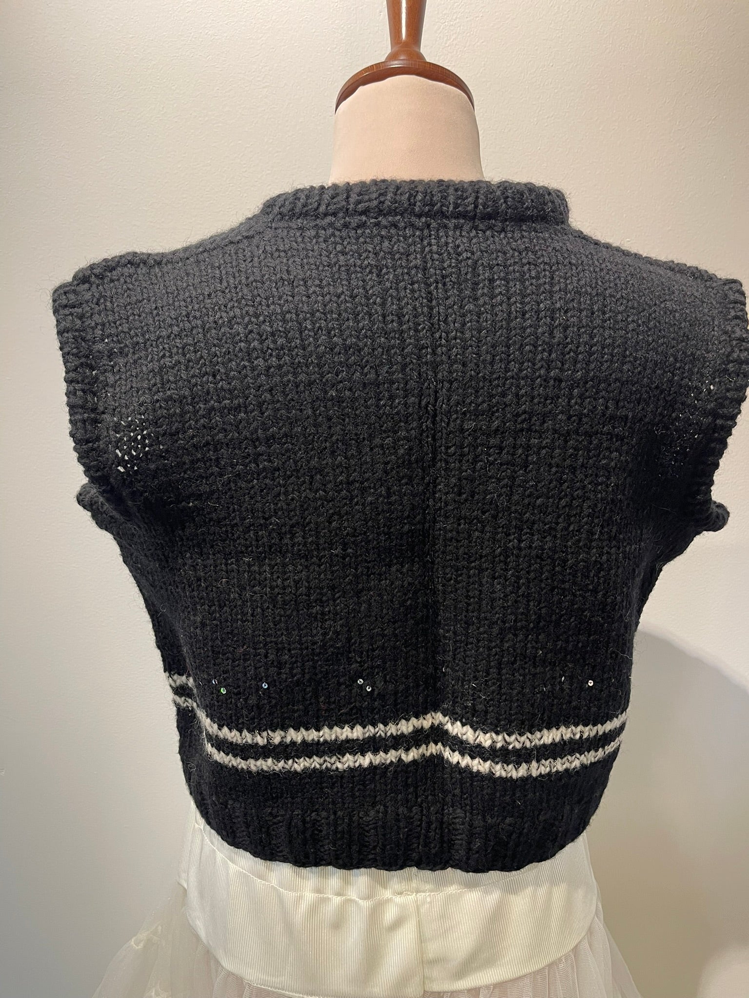 Hlýtt og gott ullarvesti með eina rönd af skrautþræði sem gerir mikið fyrir þessa flík. Vestið er í styttri kantinum og passar við hvað sem er, yfir blússur(skyrtur), kjóla eða við pils/buxur. Garnið stingur ekki en gerir það að verkum að vestið er mjög hlýtt og því tilvalið þegar fer að kólna. Stærðin er S-M.