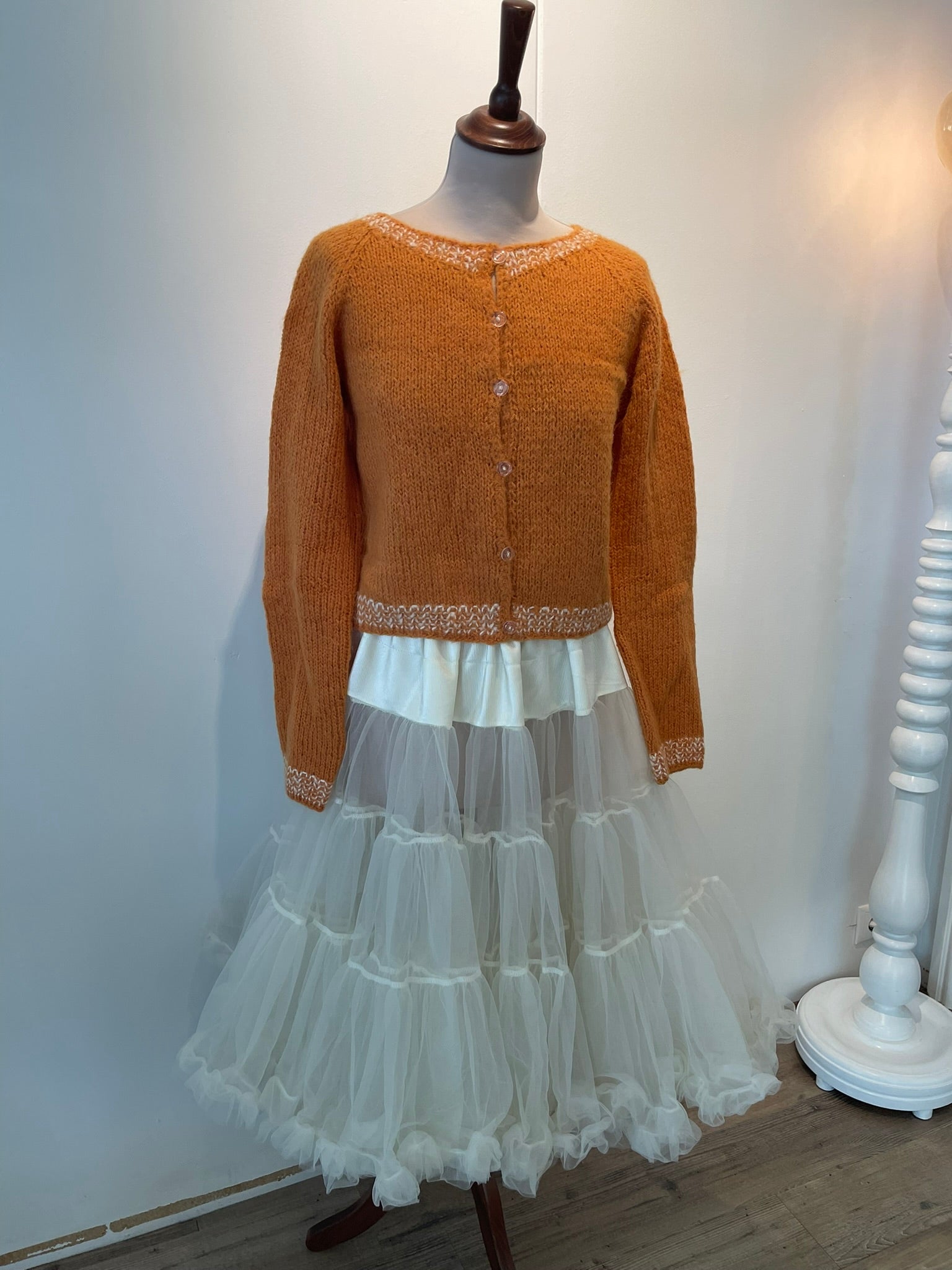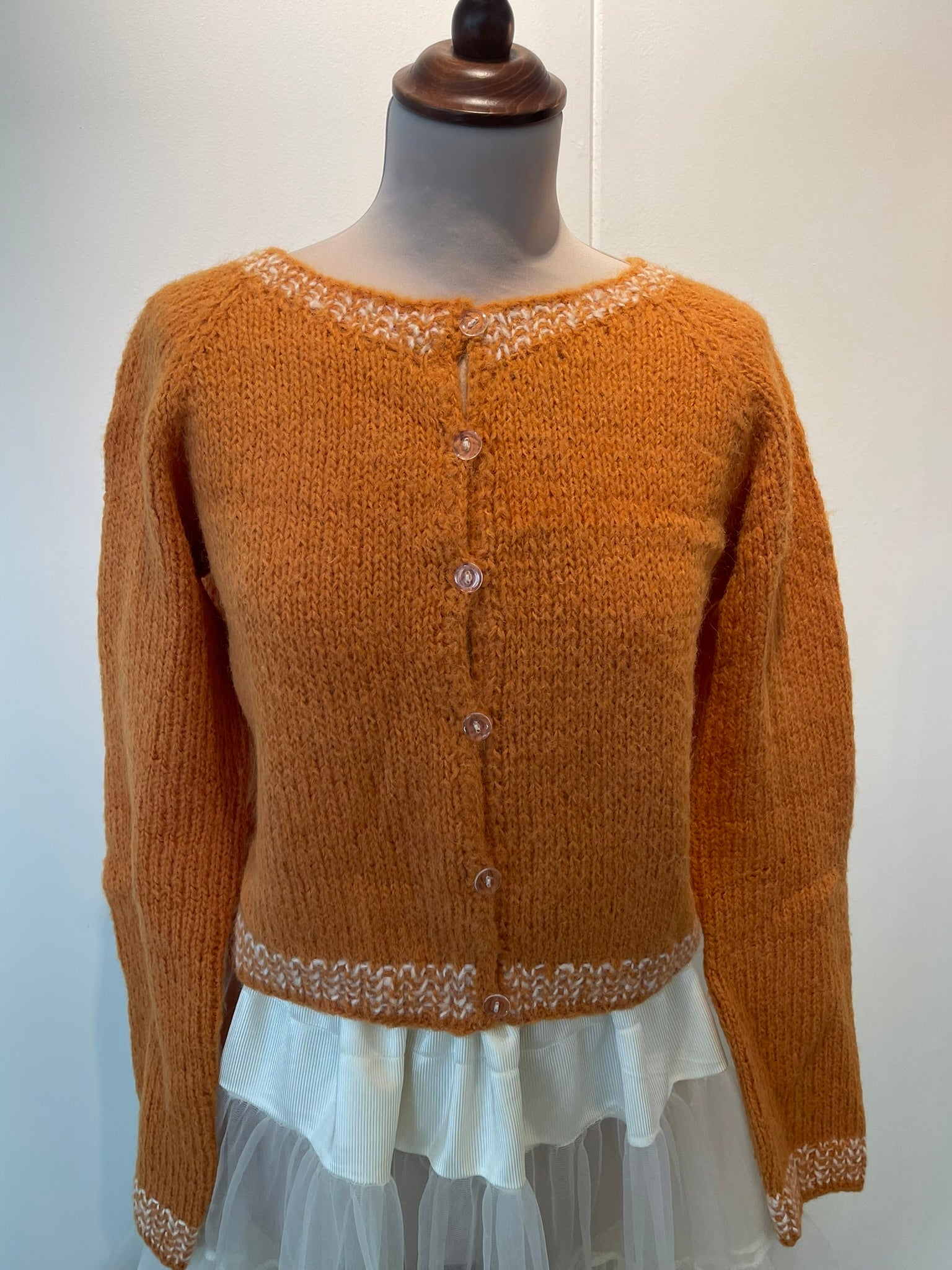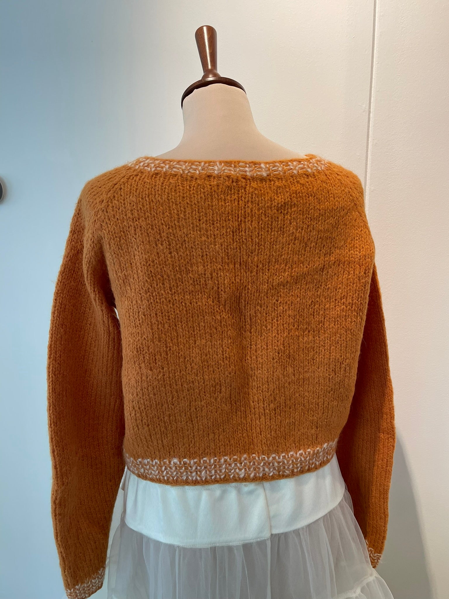 Opin, fínleg peysa úr góðu garni með fínlegum munsturbekk á ermum, hálsmáli og að neðan. Hún er prjónuð, með lask-ermum og eru ermar í fullri lengd og sídd á bol nokkurnvegin niður á mjaðmir. Passar vel við hvað sem er. Peysan er lítið notuð og lítur vel út. Falleg peysa og liturinn yndislegur. Stærð S-M
