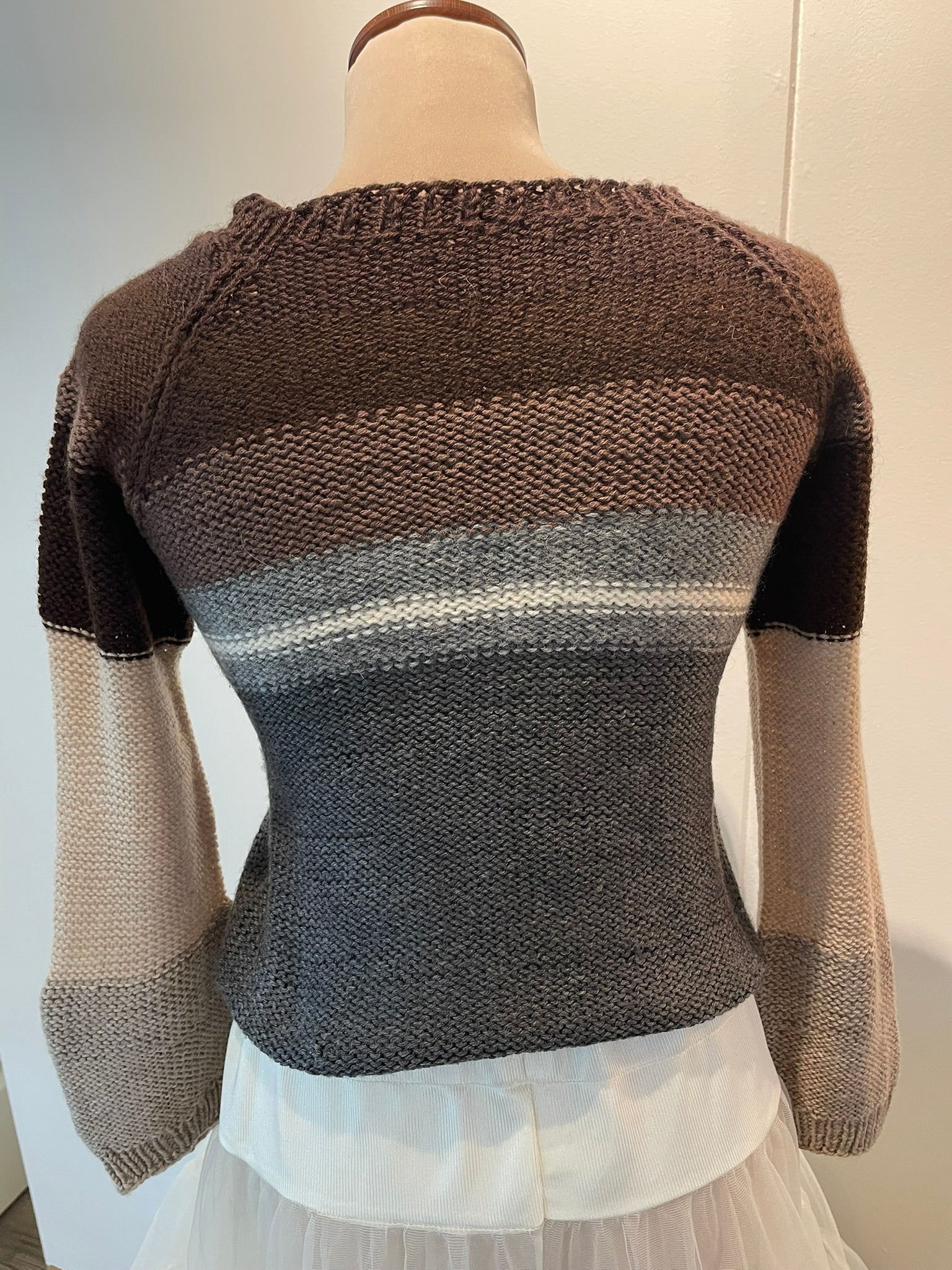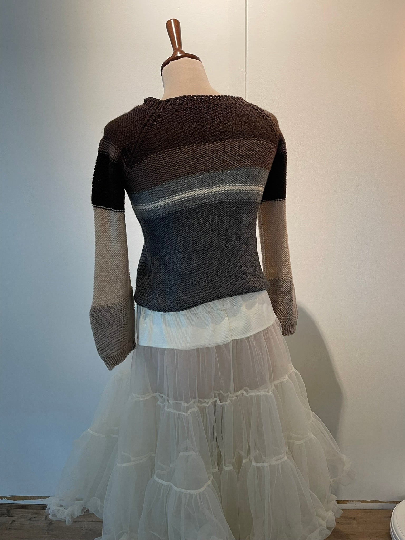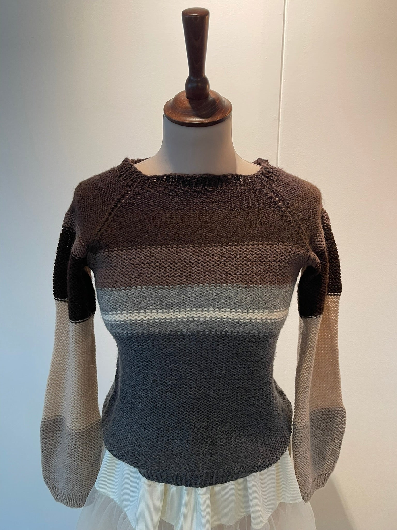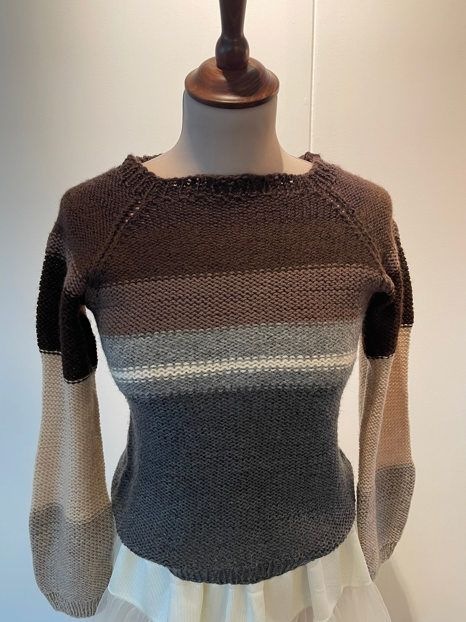 Þessi er líka haust- og vetrarleg, allavega litasamsettningarnar í henni. Hún er prónuð með brugðnum lykkjum og er með lask-ermum sem eru í fullri lengd en peysan er mjög nett og mátast þröng eða aðsniðin sem gefur henni mjög kvenlegann blæ. Stærðin er S-M og passar hún vel við hvað sem er. Nánast ónotuð flík sem er prjónuð úr nokkuð fínlegu garni og því er hún ekki þykk en mjög notaleg.
