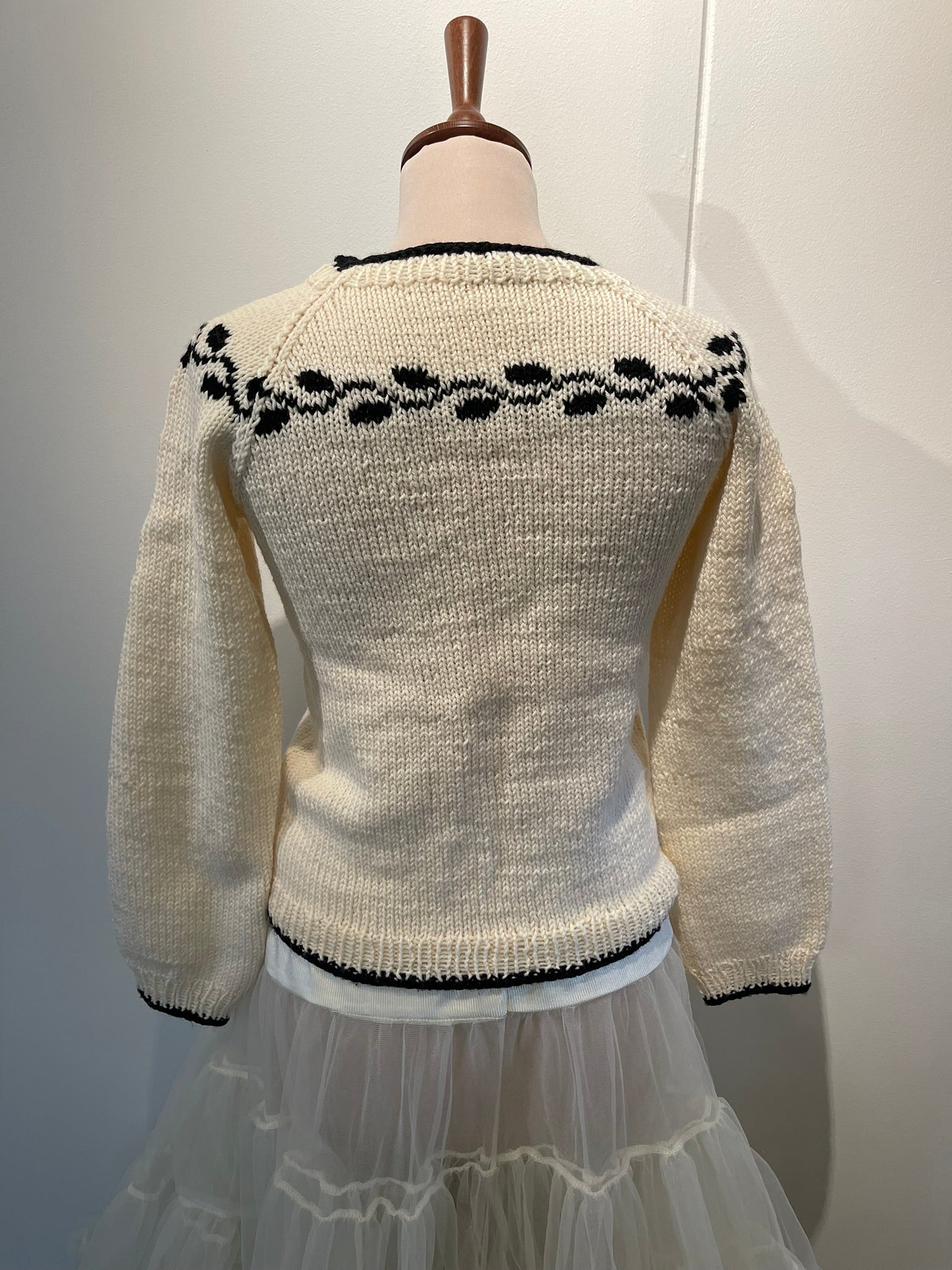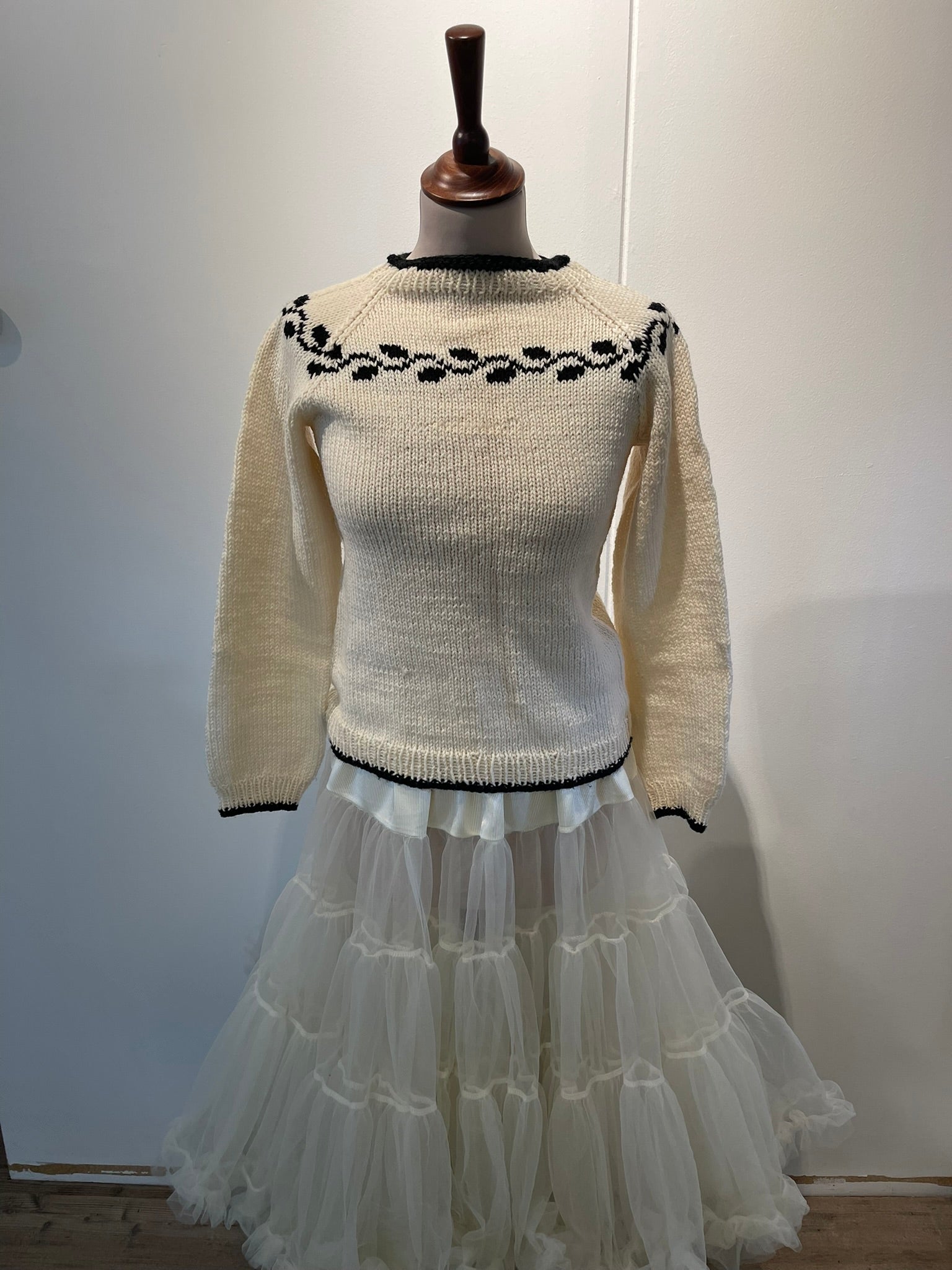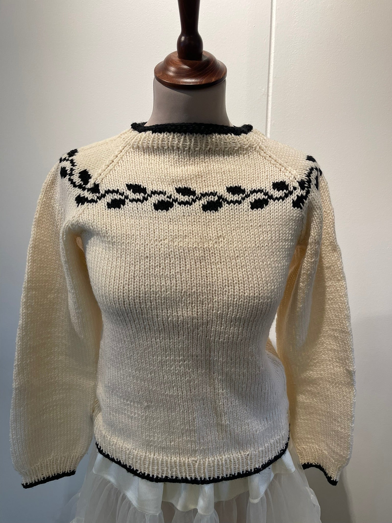 Hvít prjónuð peysa með svörtu á ermum,hálsmáli og neðri kanti og í nettum munsturbekk. Peysan er með lask-ermum og úr góðu garni. Ermalengd er örlítið styttri en venjan er en peysan öll er mjög nett og mátast þannig. Þessi flík er nánast ónotuð og hún er hlý og notaleg. Stærðin er S.