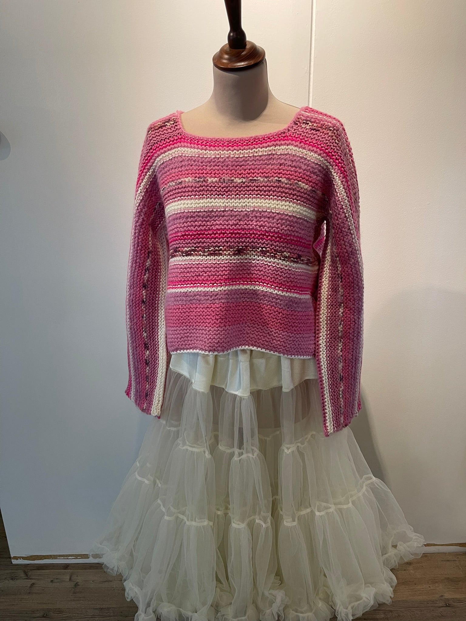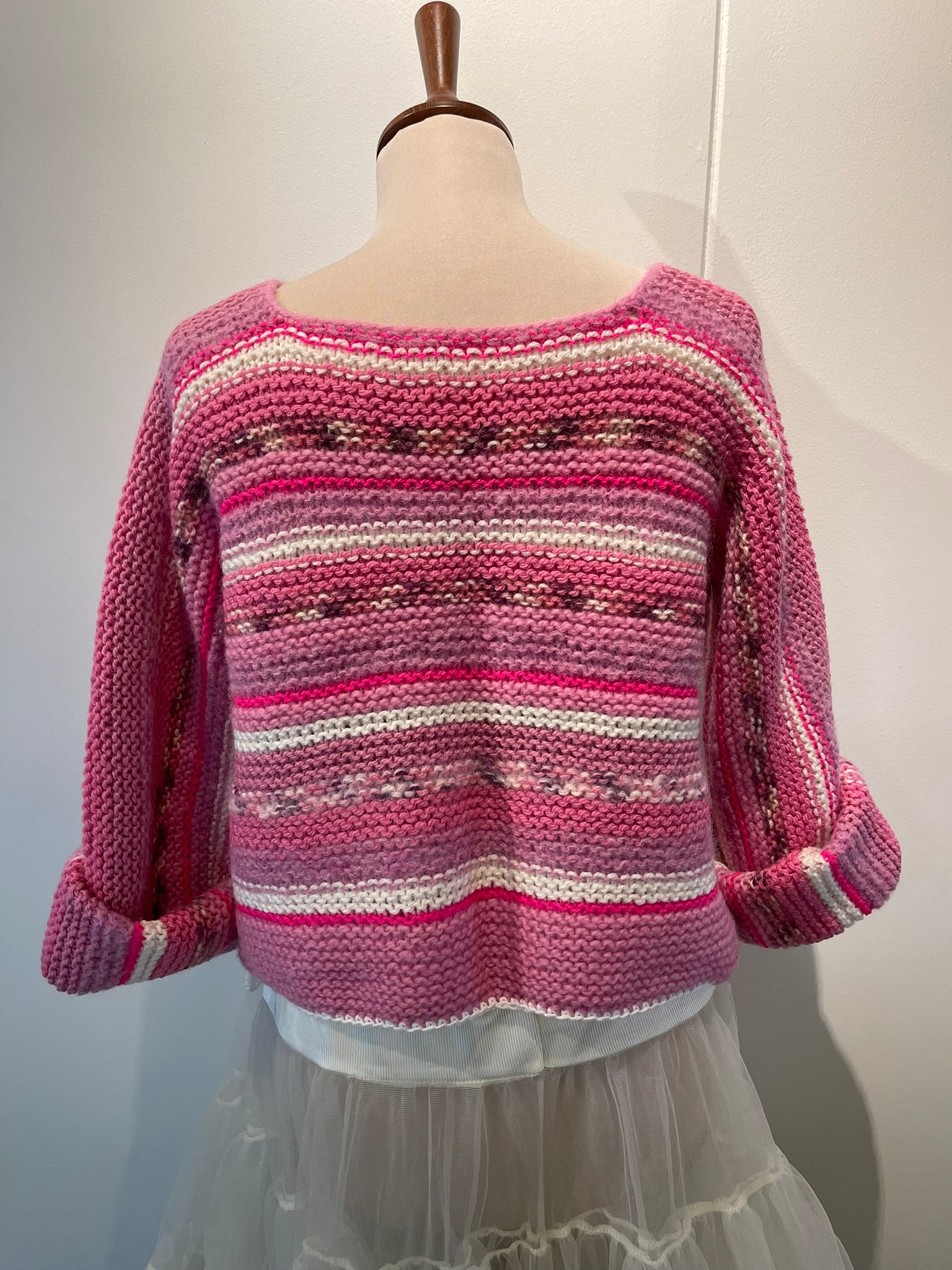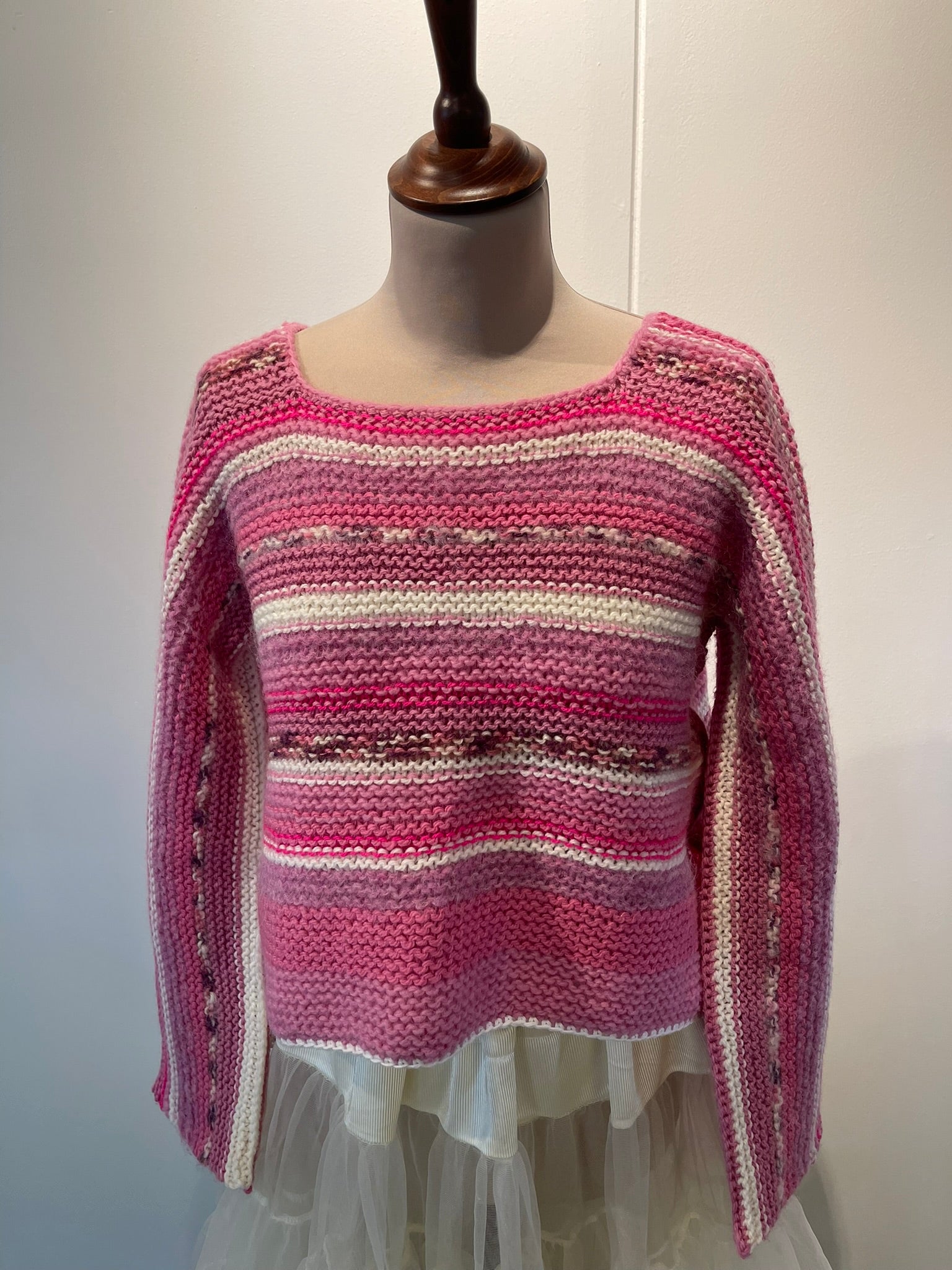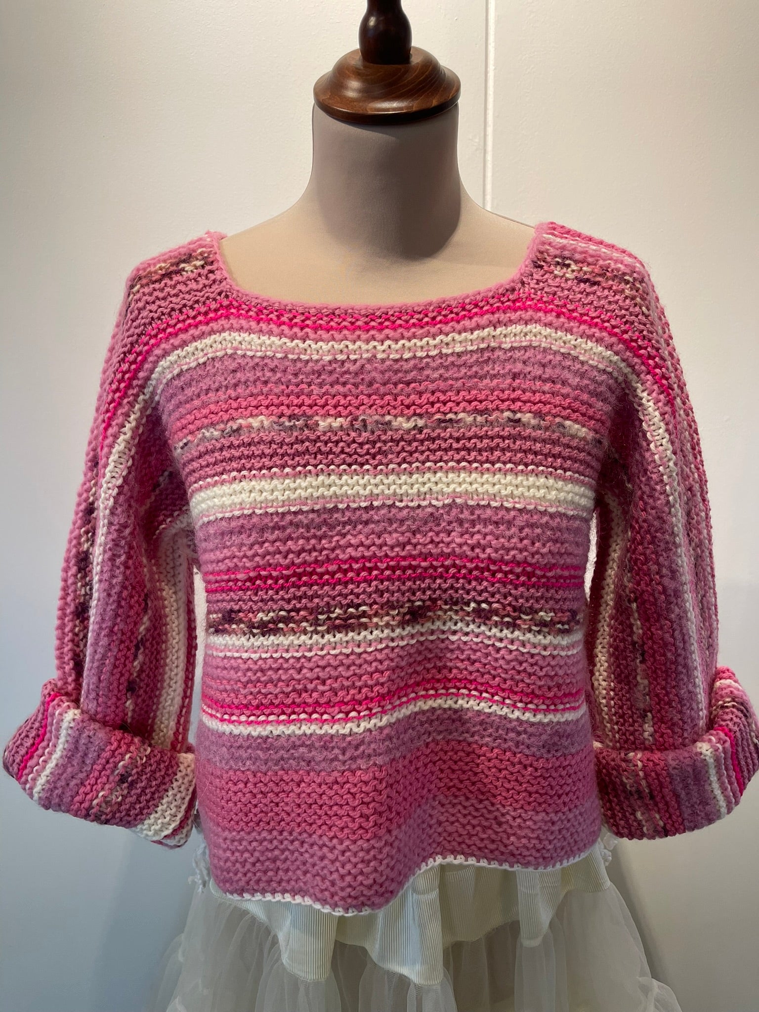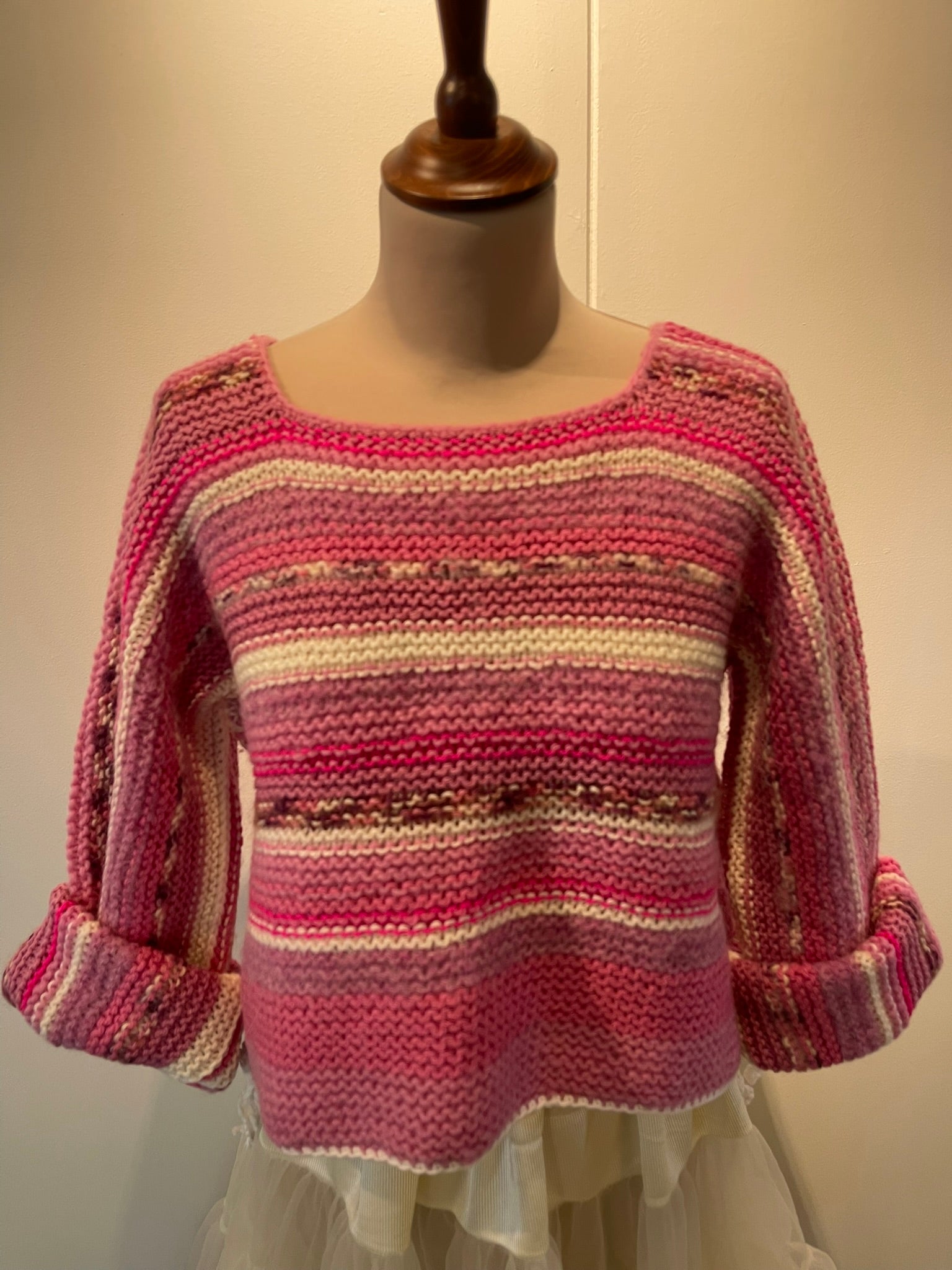 Þessi peysa er prjónuð með garðaprjóni fram og til baka og hekluð saman. Í henni eru fallegir litatónar og margvíslegar tegundir af garni sem allt er þó mjúkt og fallegt. Á hliðunum eru litlar klaufar sem bundnar eru saman með hekluðu bandi og er hægt að losa um þetta ef vill og hafa peysuna með klaufum í hliðum. Peysan er nett og fallegt að bretta upp á ermarnar. Bolurinn er í styttri kantinum en passar þó við hvað sem er. Stærðin er S