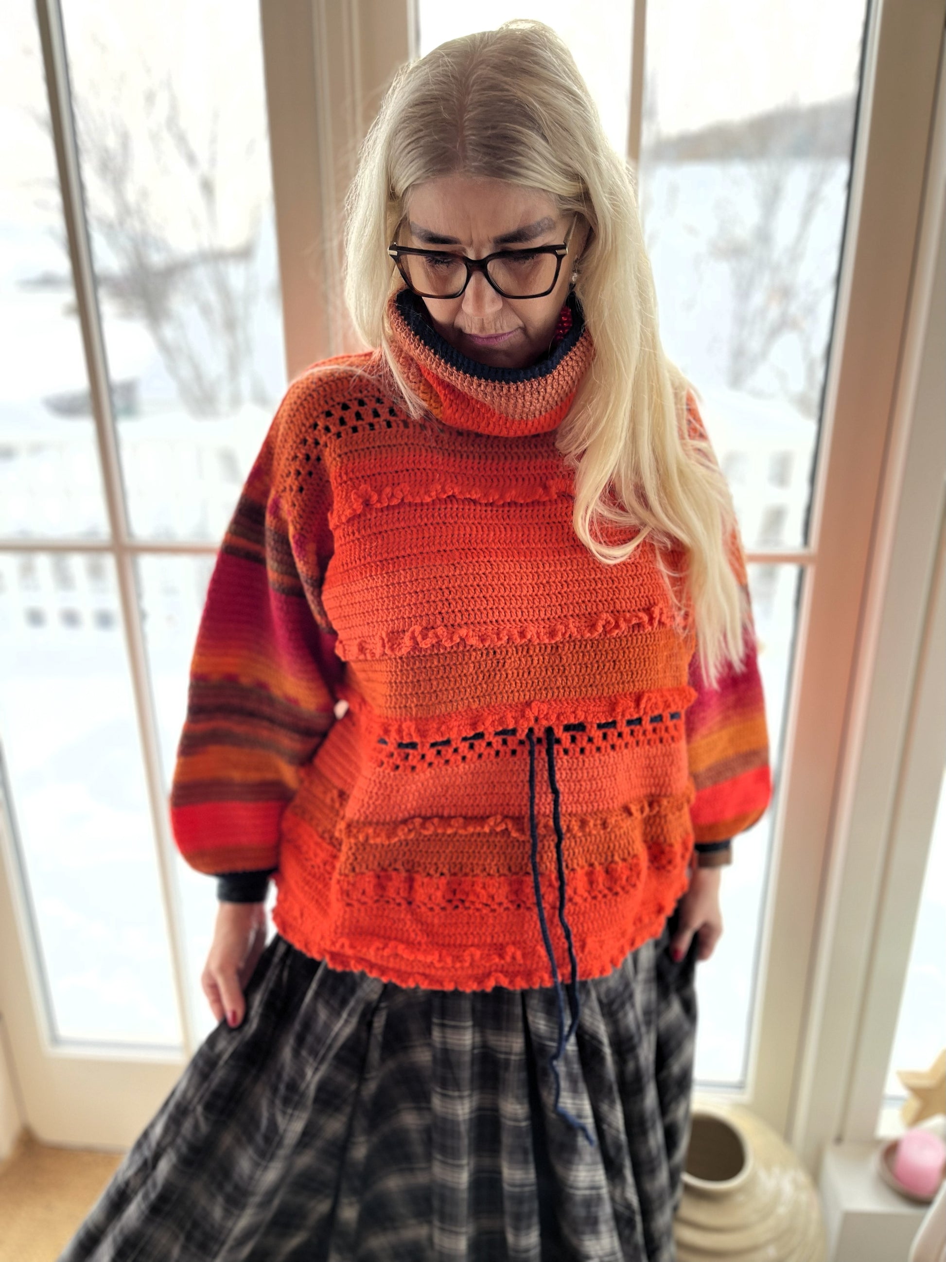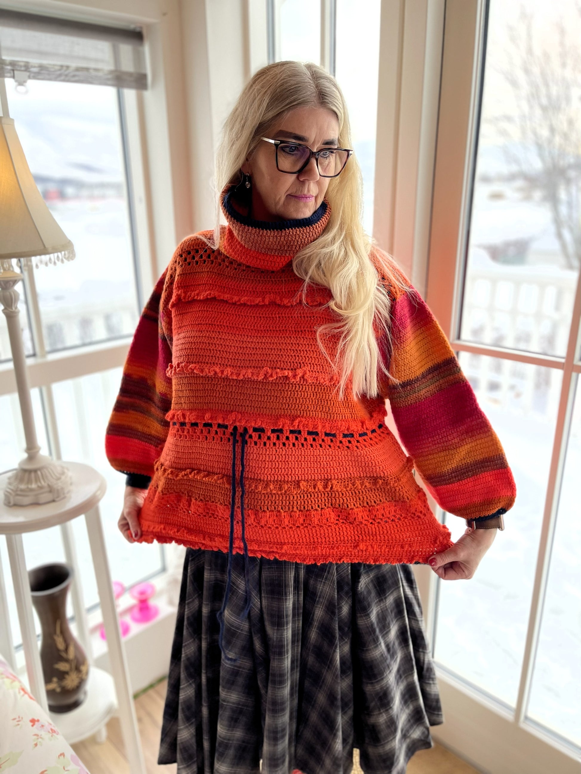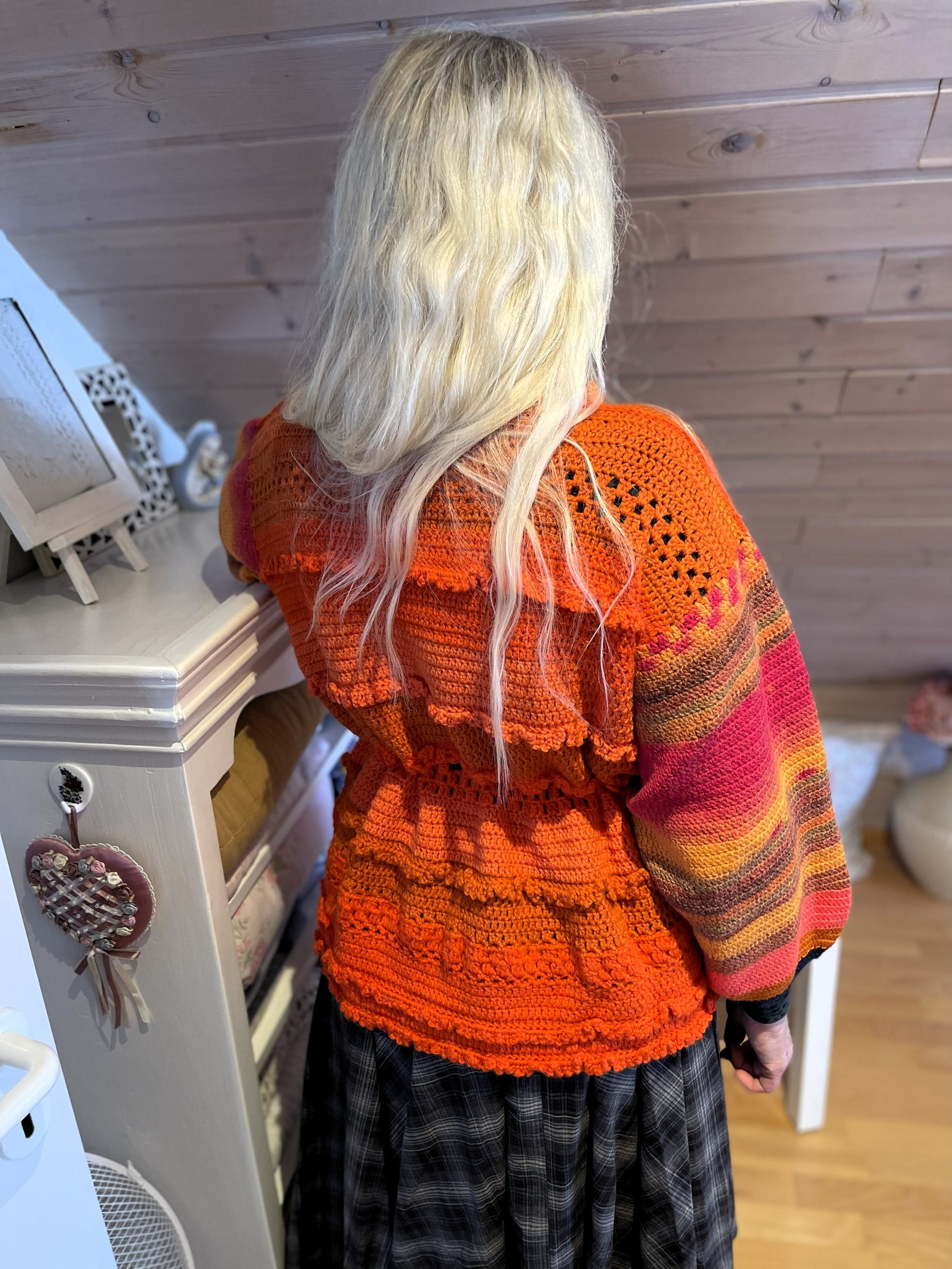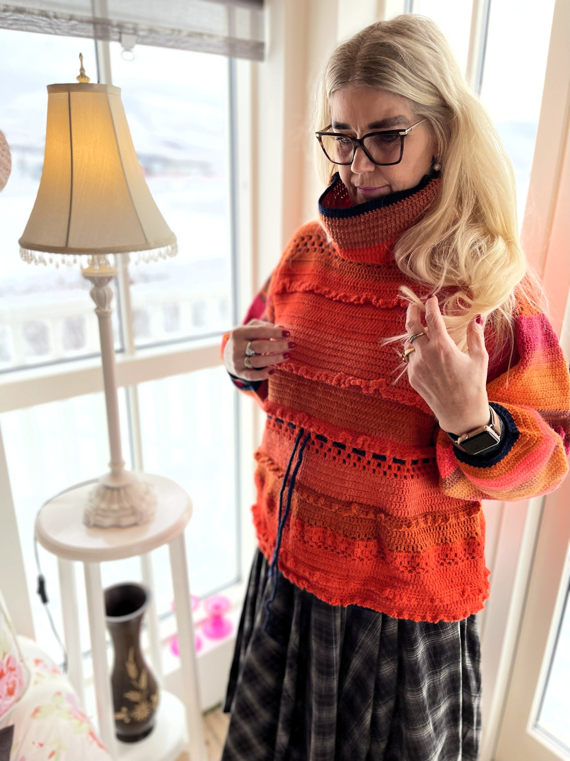 Falleg og sérstök peysa með mikinn karakter. Hún umvefur þann sem í hana fer með sínum notalega háa kraga og ekki skemmir fyrir þessi einstaklega fallegu litir sem í henni eru. Mandarína er heil, hekluð peysa með hekluðu bandi í mitti sem hægt er að draga saman en svo er líka hægt að sleppa því ef vill. Litatónarnir í þessari flík eru sérstakir og svo óskaplega fallegir, svo látlausir en þó alls ekki. Sannkölluð drauma peysa hlý og góð og allt um vefjandi.