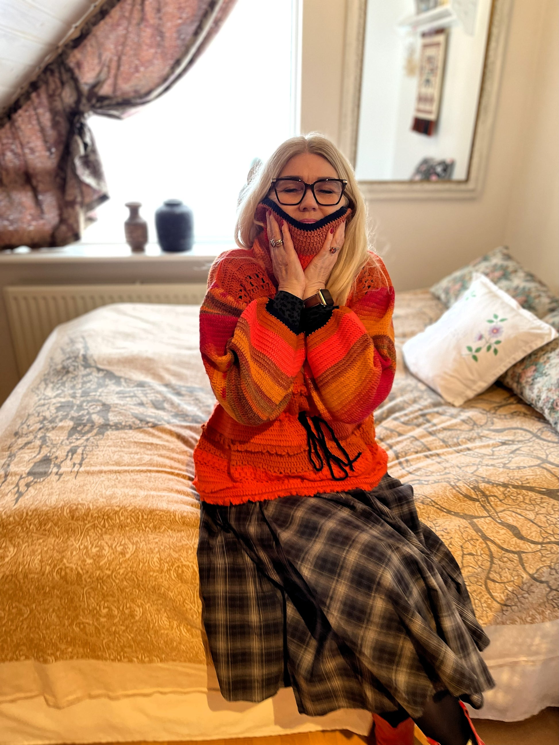 Efni: Garnið í þessari peysu er margskonar gæða garn, úr öllum “flokkum” en að mestu úr góðu mjúku ullar garni.