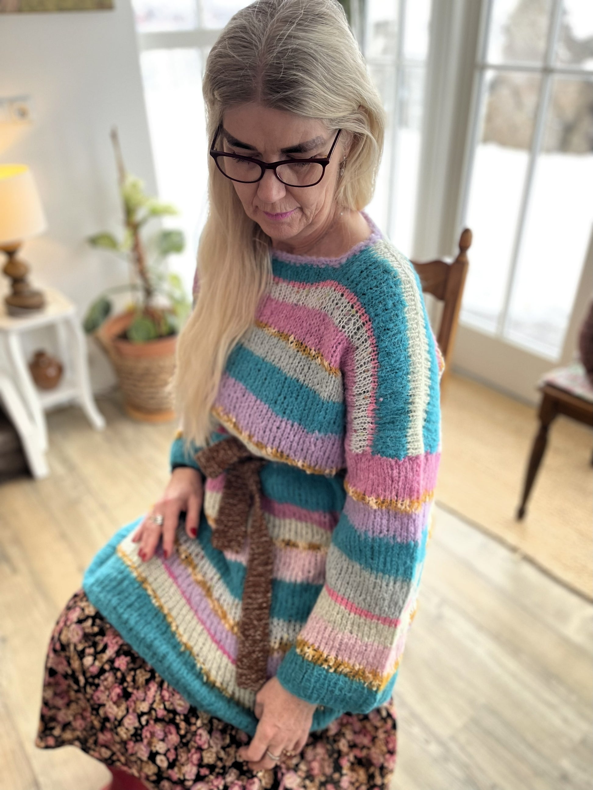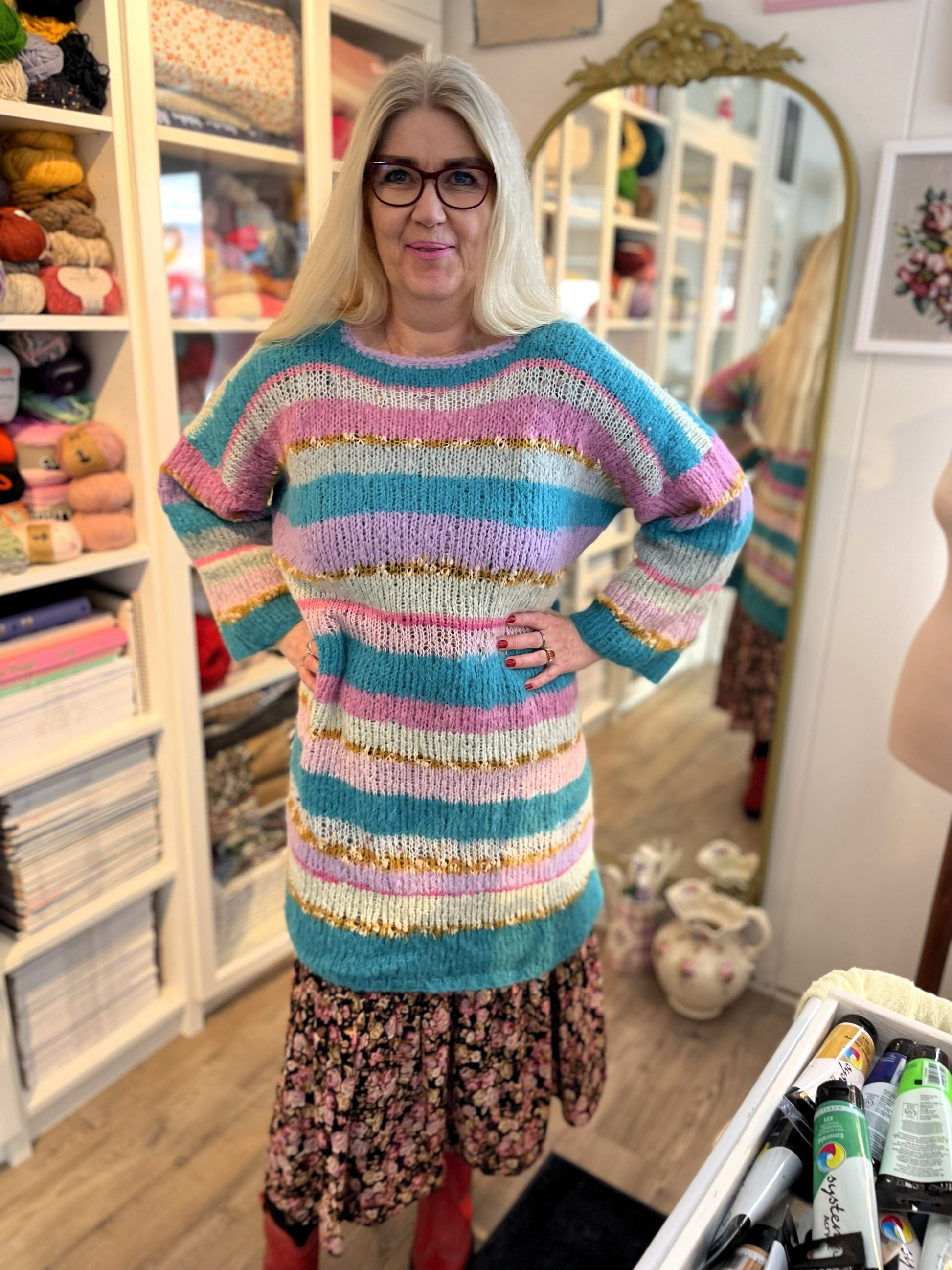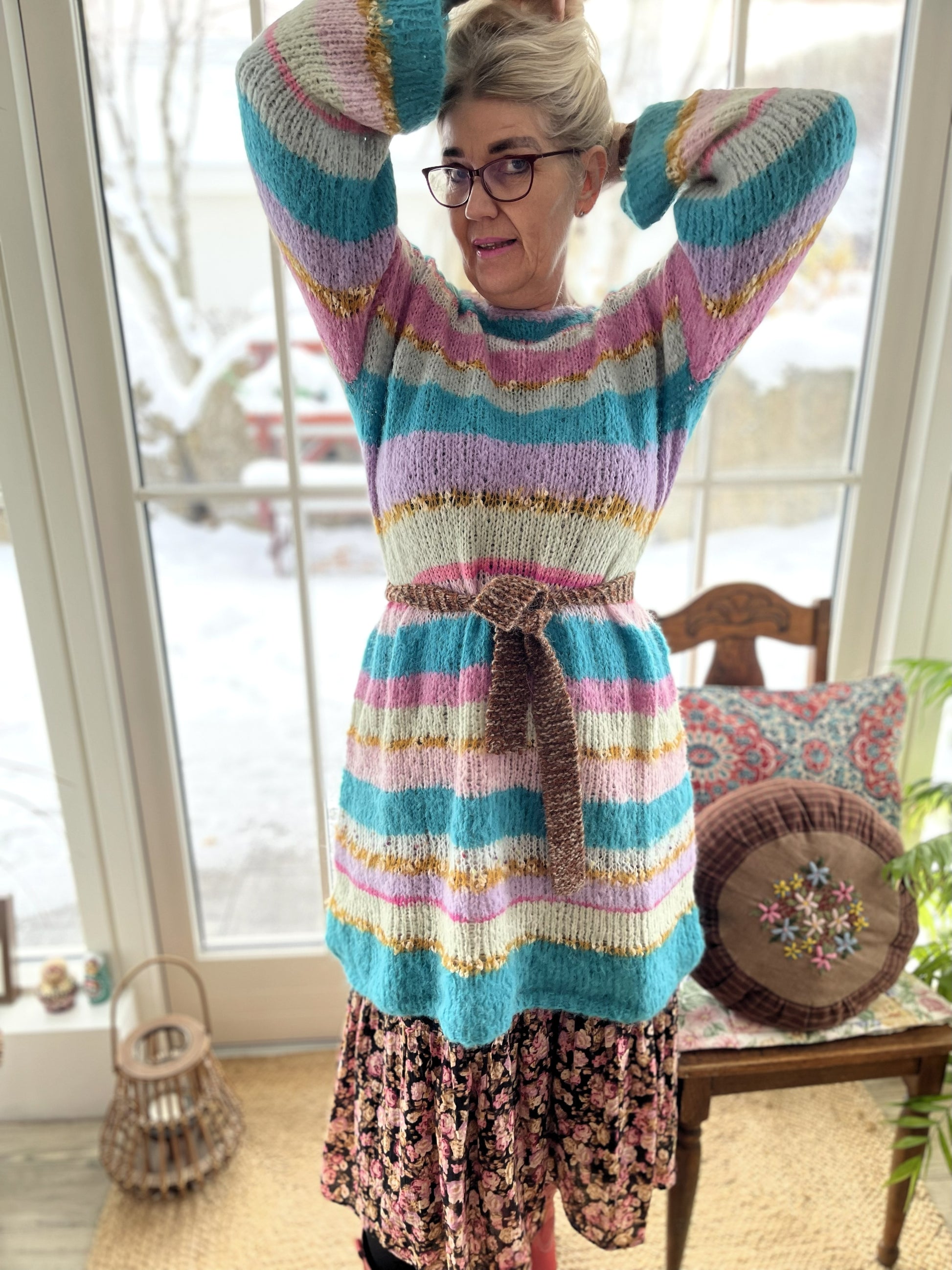Þessi dásemdar dúnmjúka peysa er laus-prjónuð úr fallegu garni sem veitir henni fallegt yfirbragð. Hún er nokkuð “fluffy” og teygjanleg enda prjónuð úr miklu gæðagarni sem leikur við skinnið svo mjúk er hún. Þessa flík er hægt að hafa lausa og þægilega eða að setja belti, að eigin vali, í mittið og þá breytist yfirbragðið á peysunni. Litirnir í Dúnmjúk eru fallegir pastell-litir sem eru svo yndislegir. Sannkölluð gæða flík hún Dúnmjúk.