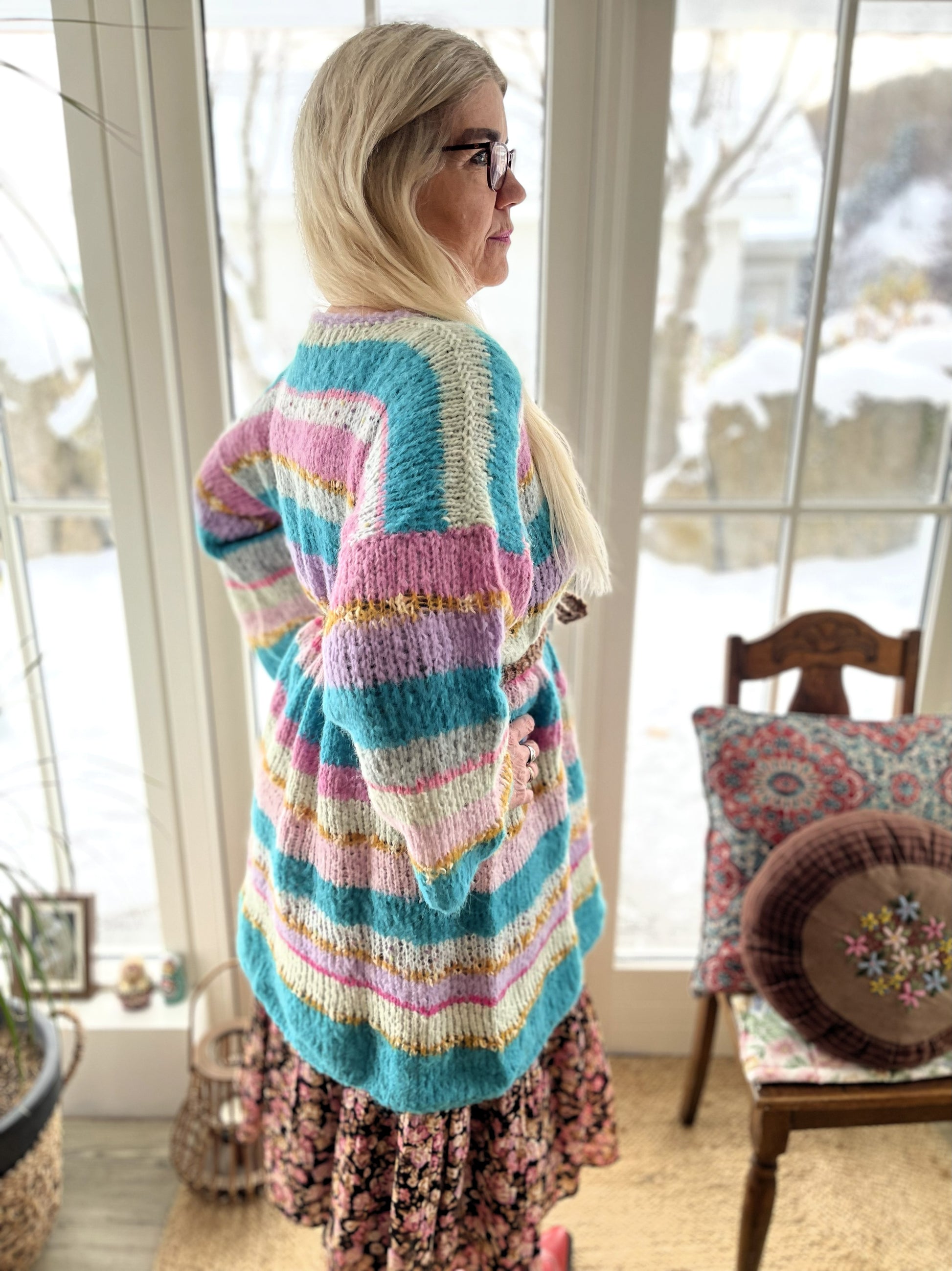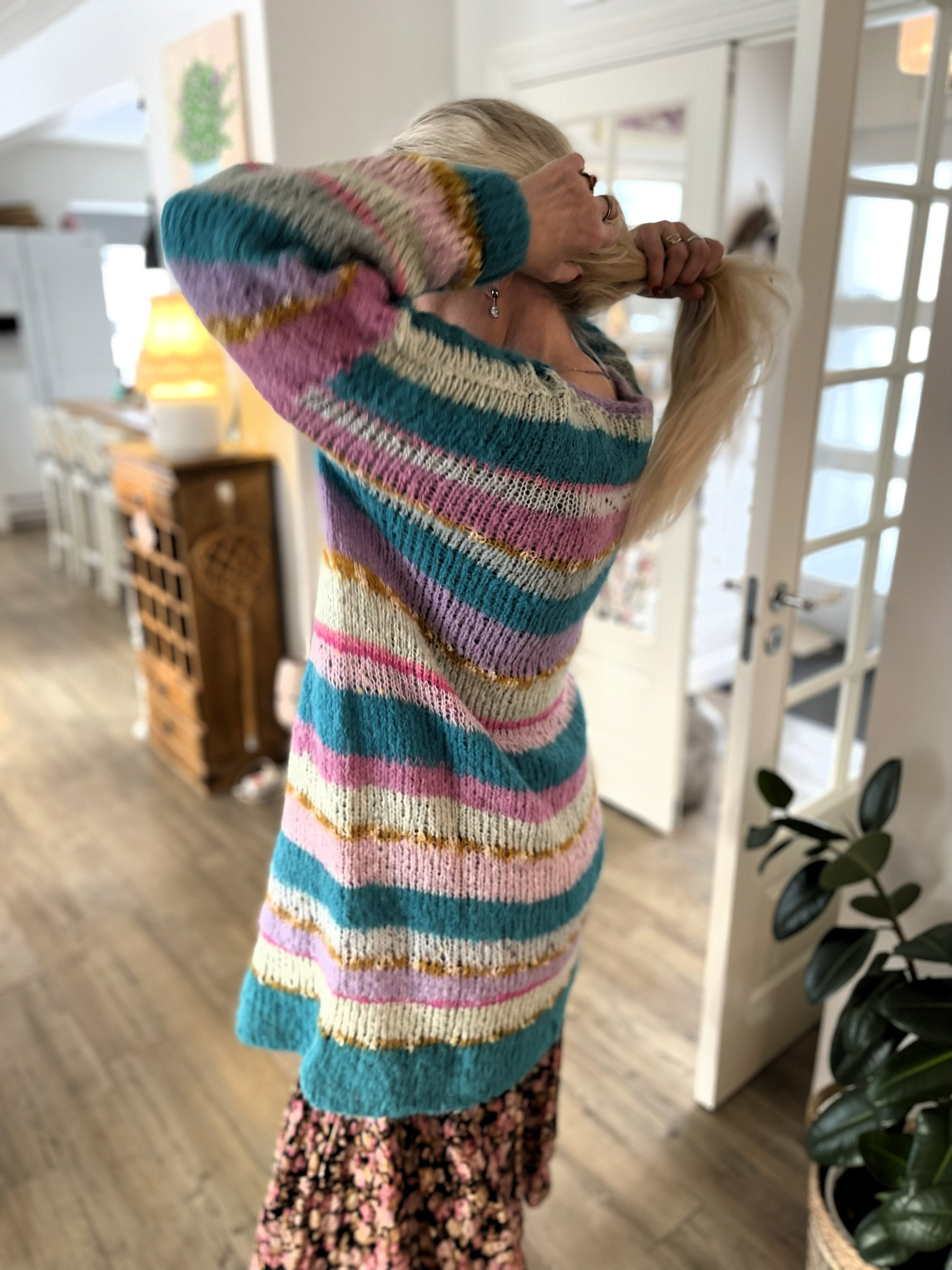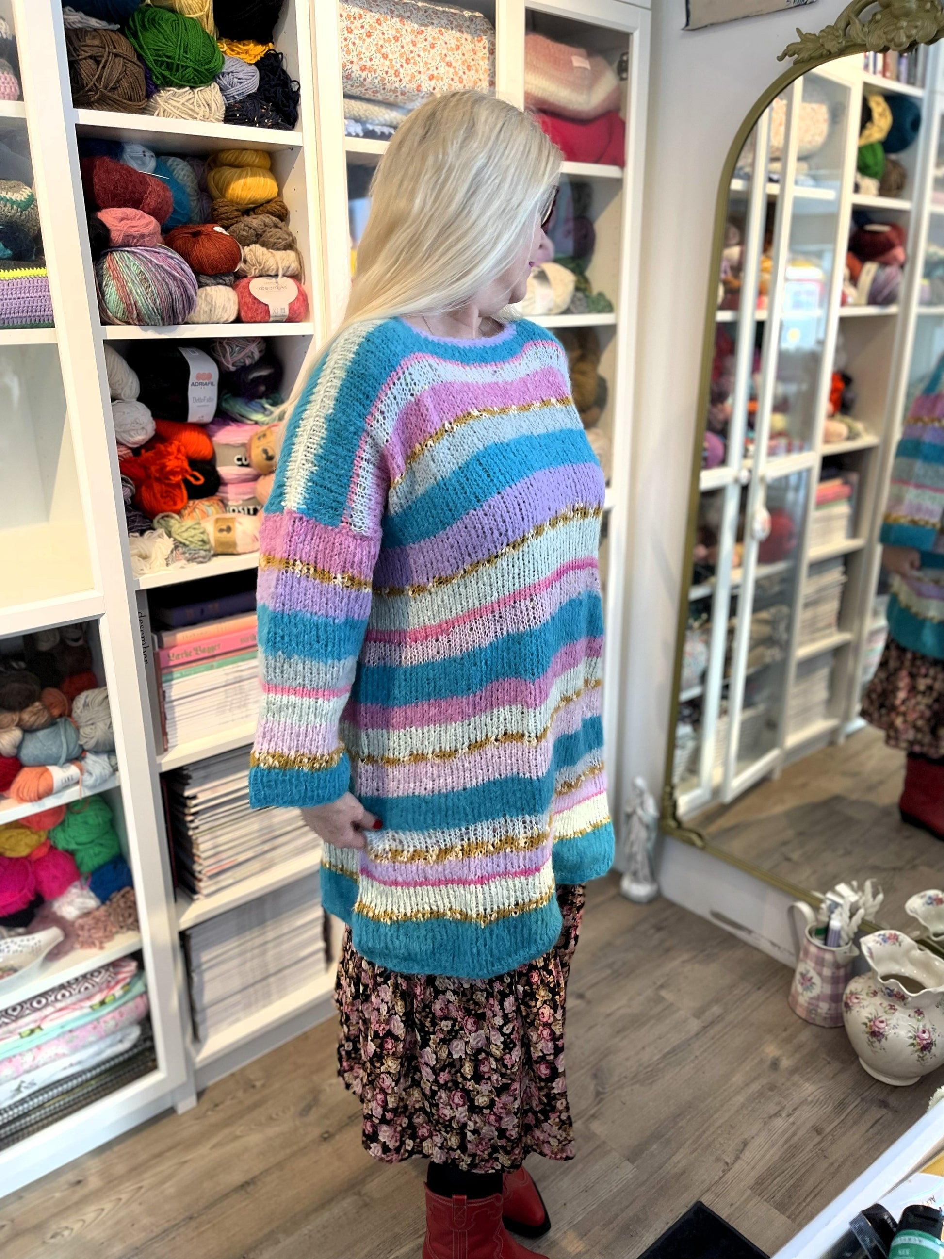 Þessi dásemdar dúnmjúka peysa er laus-prjónuð úr fallegu garni sem veitir henni fallegt yfirbragð. Hún er nokkuð “fluffy” og teygjanleg enda prjónuð úr miklu gæðagarni sem leikur við skinnið svo mjúk er hún. Þessa flík er hægt að hafa lausa og þægilega eða að setja belti, að eigin vali, í mittið og þá breytist yfirbragðið á peysunni. Litirnir í Dúnmjúk eru fallegir pastell-litir sem eru svo yndislegir. Sannkölluð gæða flík hún Dúnmjúk.