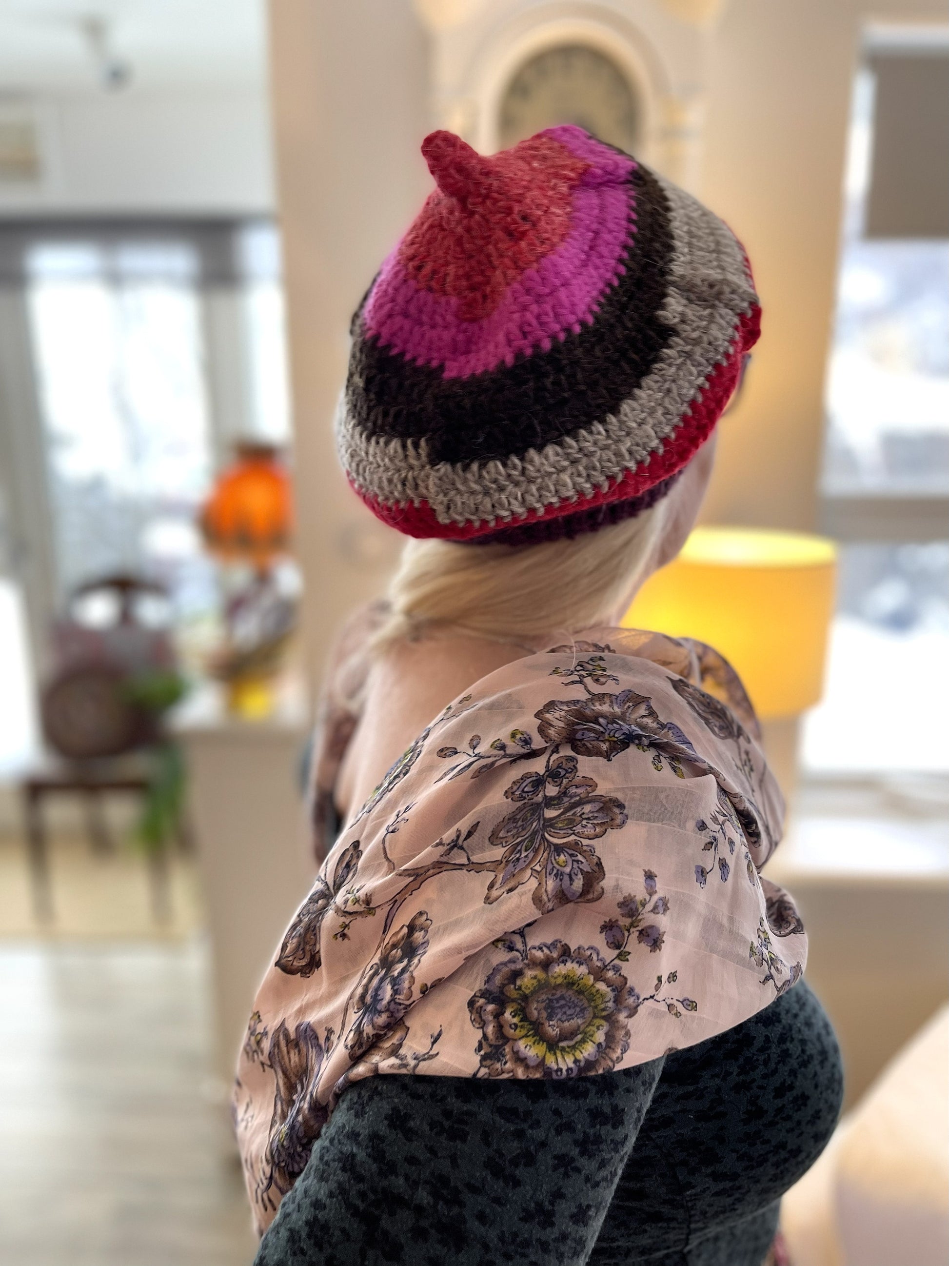 Lopahúfa er í alpahúfu stíl. Hún er hekluð úr lopa eins og nafnið bendir til og því er þetta hlý og góð húfa sem fangar athyglina fyrir sína sérstöðu í litasamsettningum. Lopahúfa klæðist vel og er þægileg og er yndislegt höfuðfat í alla staði.