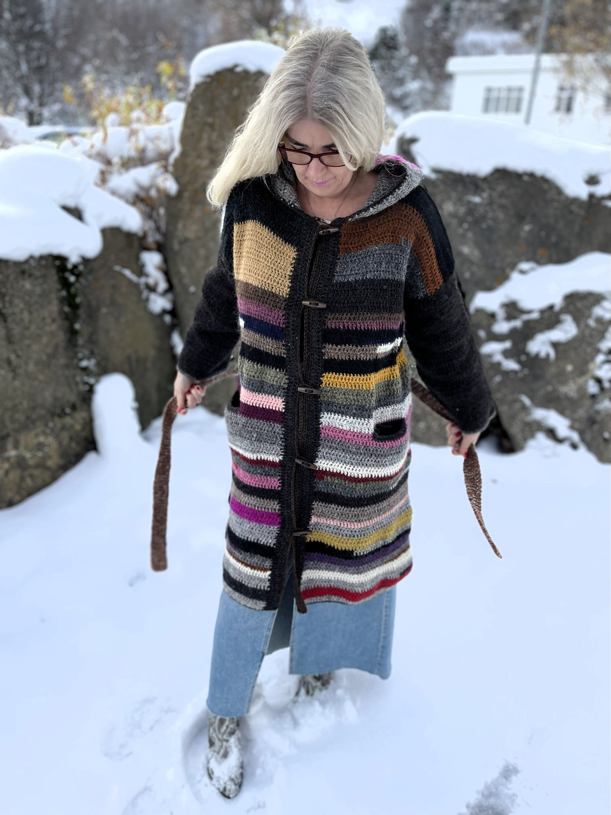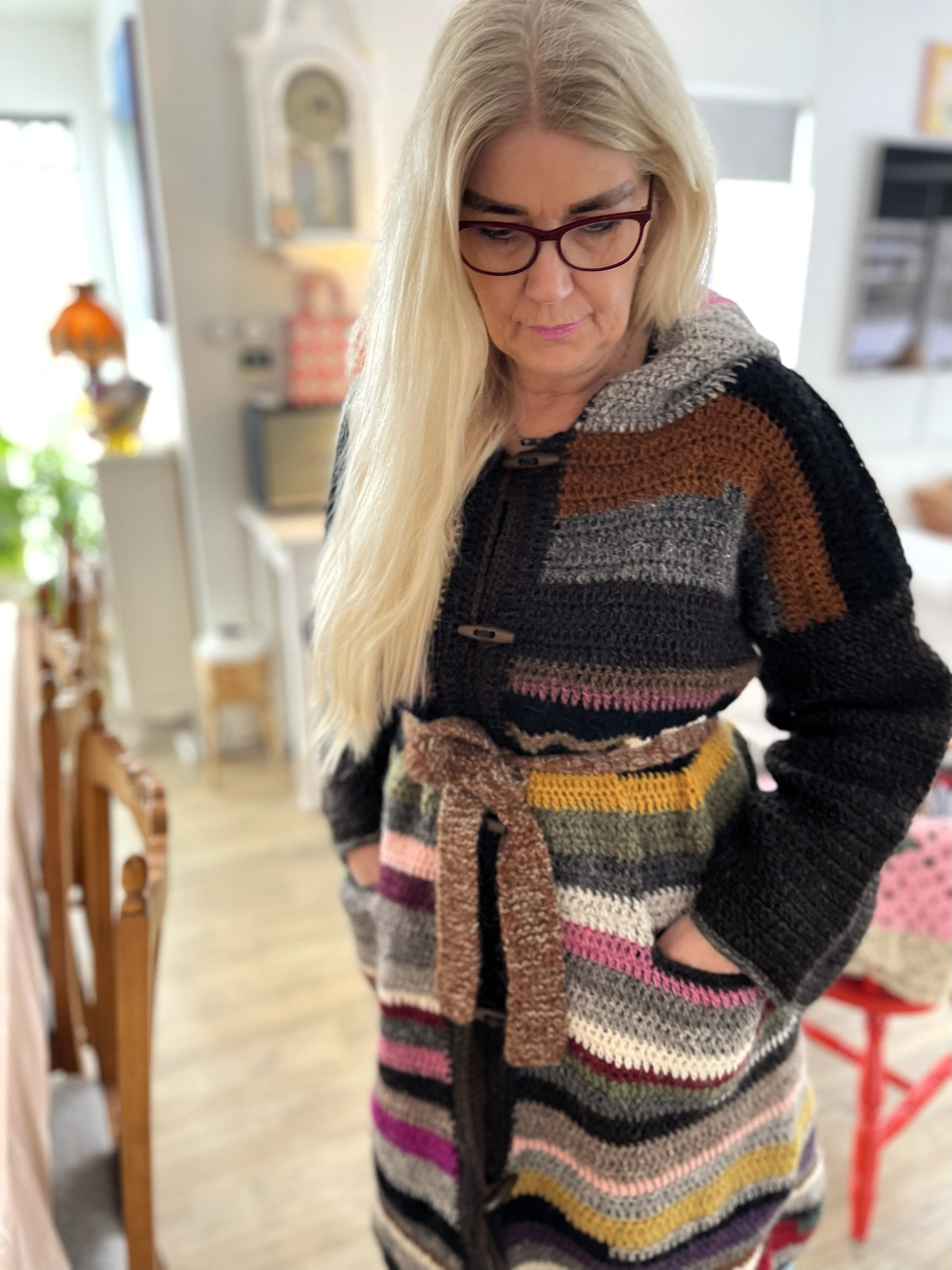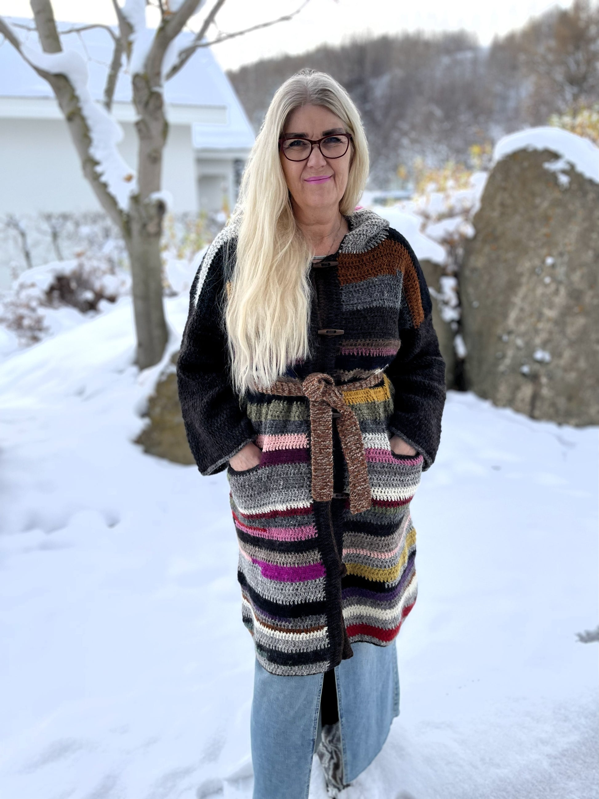 Rósalínu Lopapeysan. Þessi flík er mjög sérstök þar sem að hún er hekluð úr lopa og það “afgöngum” eða endum þar sem hver litur tekur við af öðrum og nánast hending látin ráða hvaða litur kemur næstur. Lopapeysan er hlý og opin með aflöngum trétölum, belti og hettu og ekki má gleyma vösunum. Hún er mjög klæðileg og hentar úti sem inni, vetur sem sumar. Hægt er að ráða því hvort að beltið er notað eða ekki en engir “hankar” eru í hliðum fyrir beltið til að fallegra sé að sleppa því ef vill. Einstaklega notaleg flík og mjög eiguleg fyrir lopapeysu unnendur.