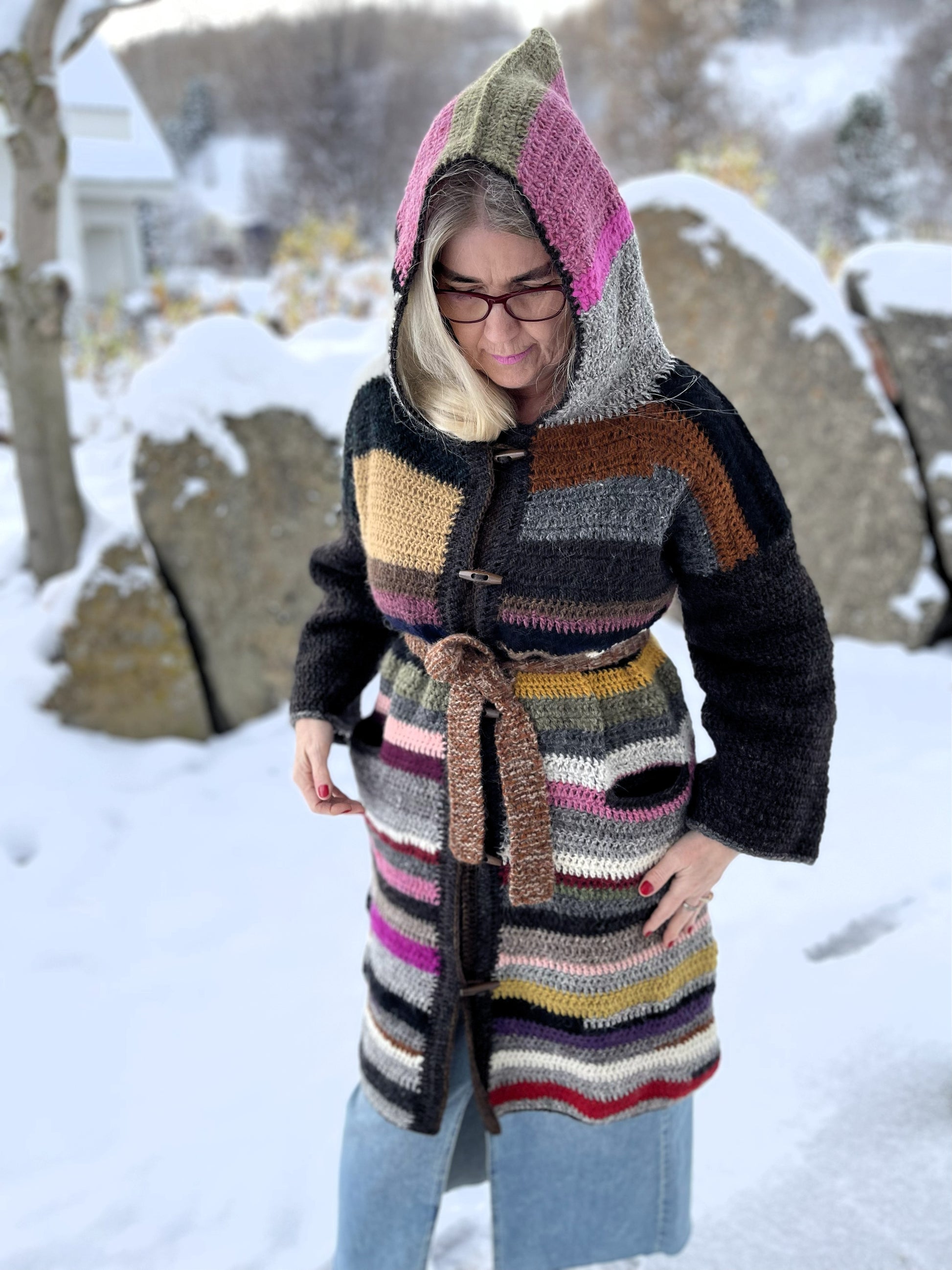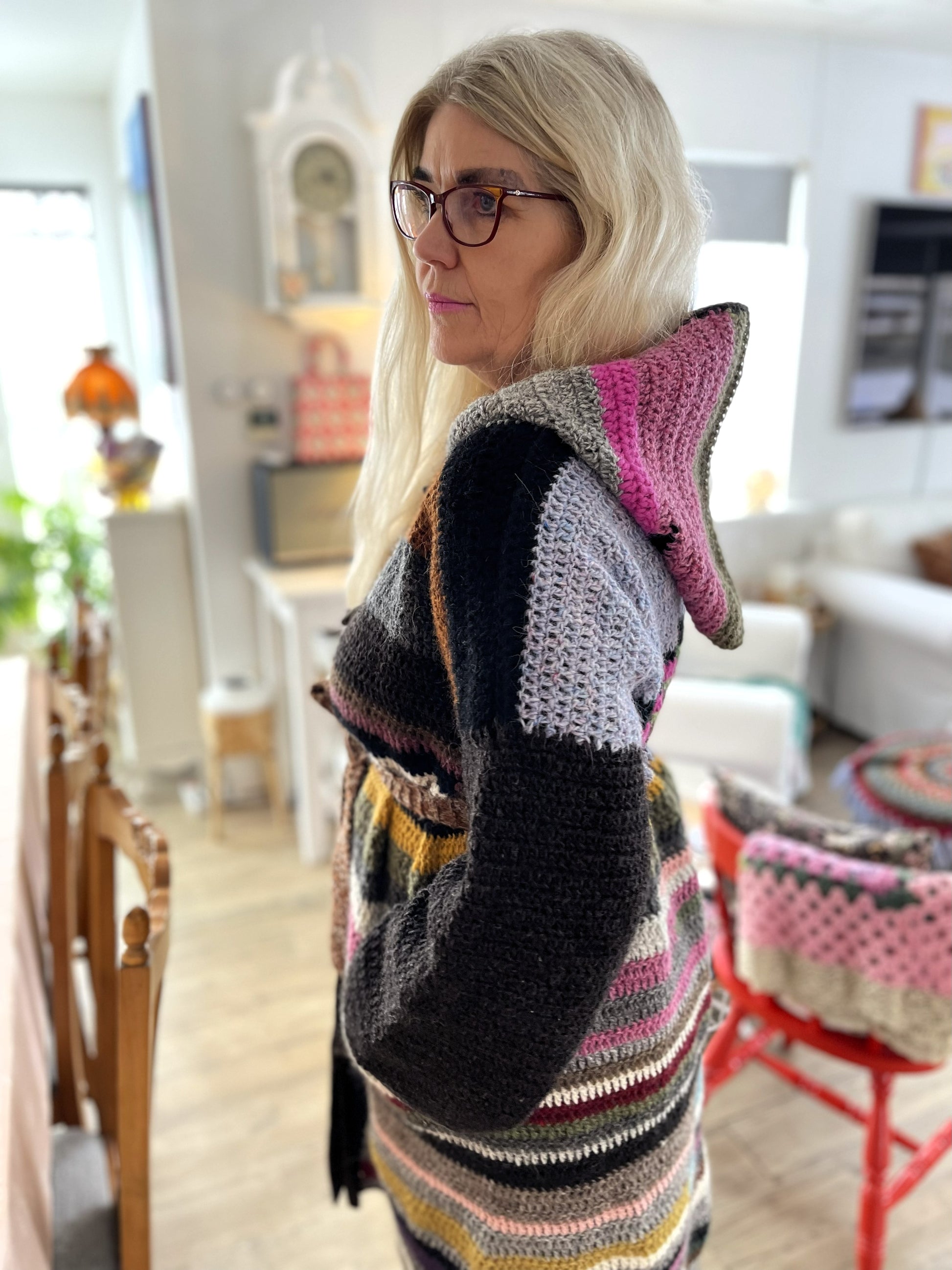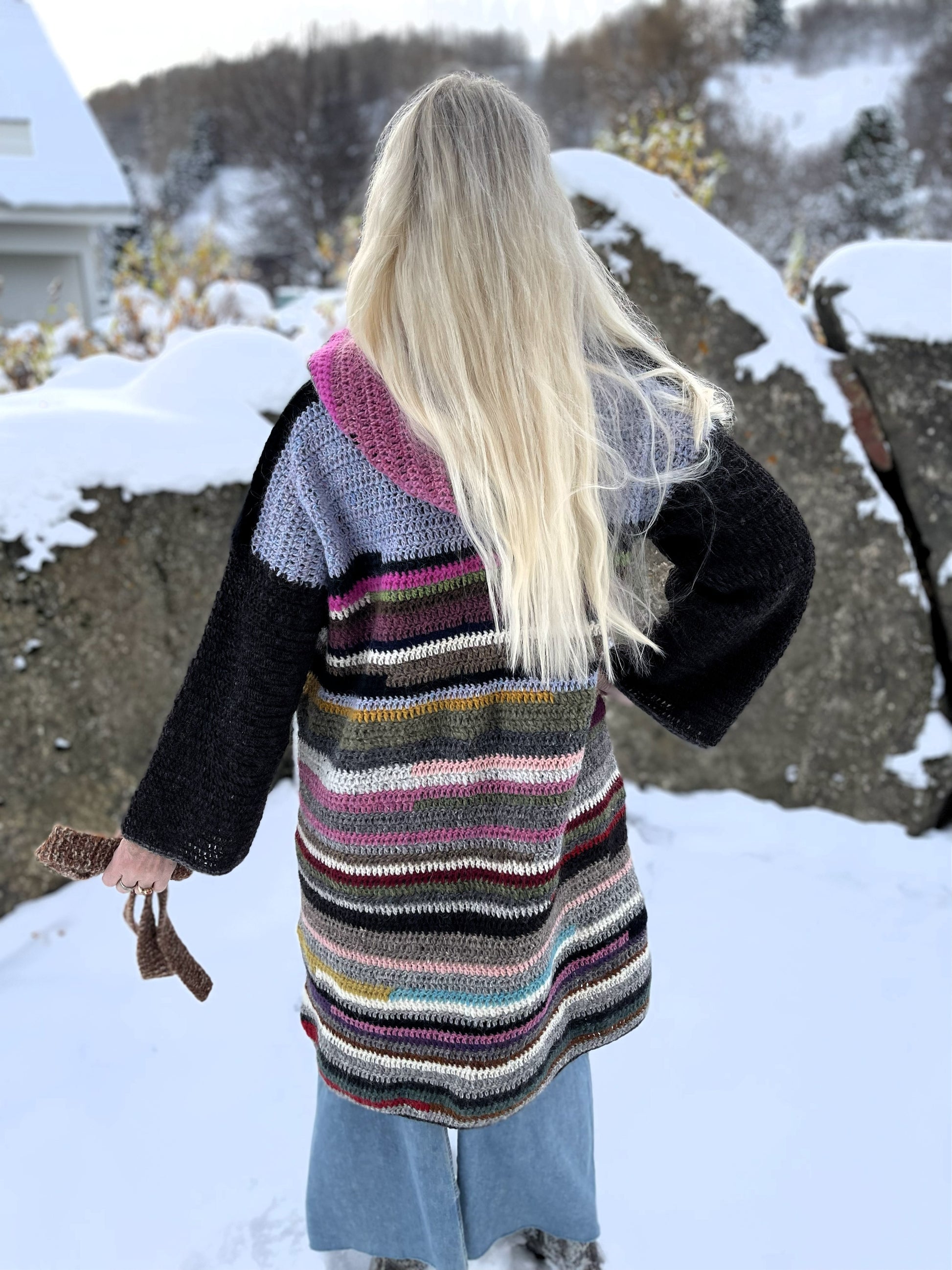 Rósalínu Lopapeysan. Þessi flík er mjög sérstök þar sem að hún er hekluð úr lopa og það “afgöngum” eða endum þar sem hver litur tekur við af öðrum og nánast hending látin ráða hvaða litur kemur næstur. Lopapeysan er hlý og opin með aflöngum trétölum, belti og hettu og ekki má gleyma vösunum. Hún er mjög klæðileg og hentar úti sem inni, vetur sem sumar. Hægt er að ráða því hvort að beltið er notað eða ekki en engir “hankar” eru í hliðum fyrir beltið til að fallegra sé að sleppa því ef vill. Einstaklega notaleg flík og mjög eiguleg fyrir lopapeysu unnendur.